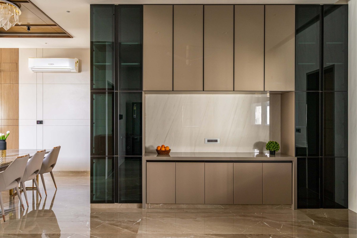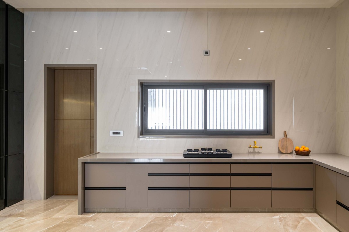 The kitchen exemplifies the project’s commitment to understated elegance and functional modernity. Designed with precise detailing, it brings together sleek matte cabinetry and expanses of marble for a refined, luxurious environment. Black glass accents provide depth while abundant daylight accentuates the purity of form. Storage is integrated seamlessly into the layout, maintaining a minimalist flow that underscores the guiding ethos of ‘functional luxury.’