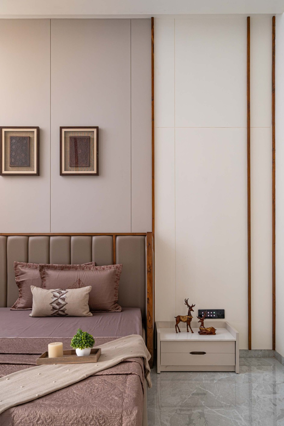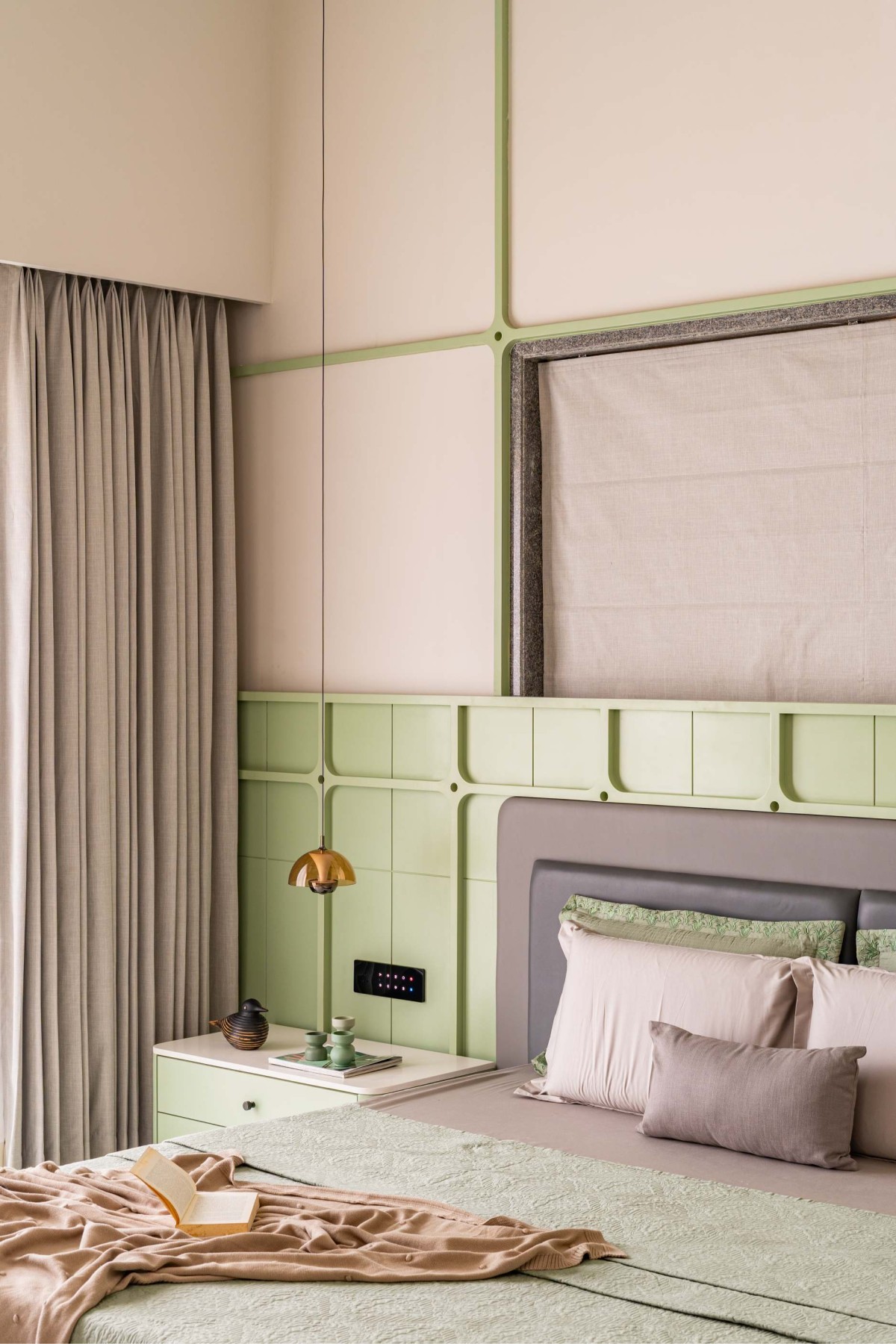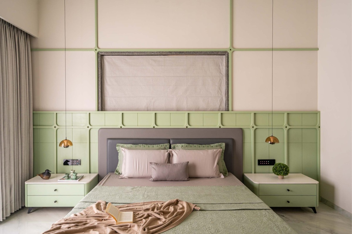 A second bedroom introduces a tranquil identity through its sage green panelling, paired with soft beige walls for a calming, contemporary atmosphere. The feature wall, organized in a subtle geometric grid, frames a simple upholstered bed with grace. Sleek floating nightstands, brass pendant lights, and linen textures bring sophistication, while a compact study corner, integrated into vertical wood panels, adds utility without disturbing the serenity. This space embodies timeless modern living, deliberately designed for reflection and rest.