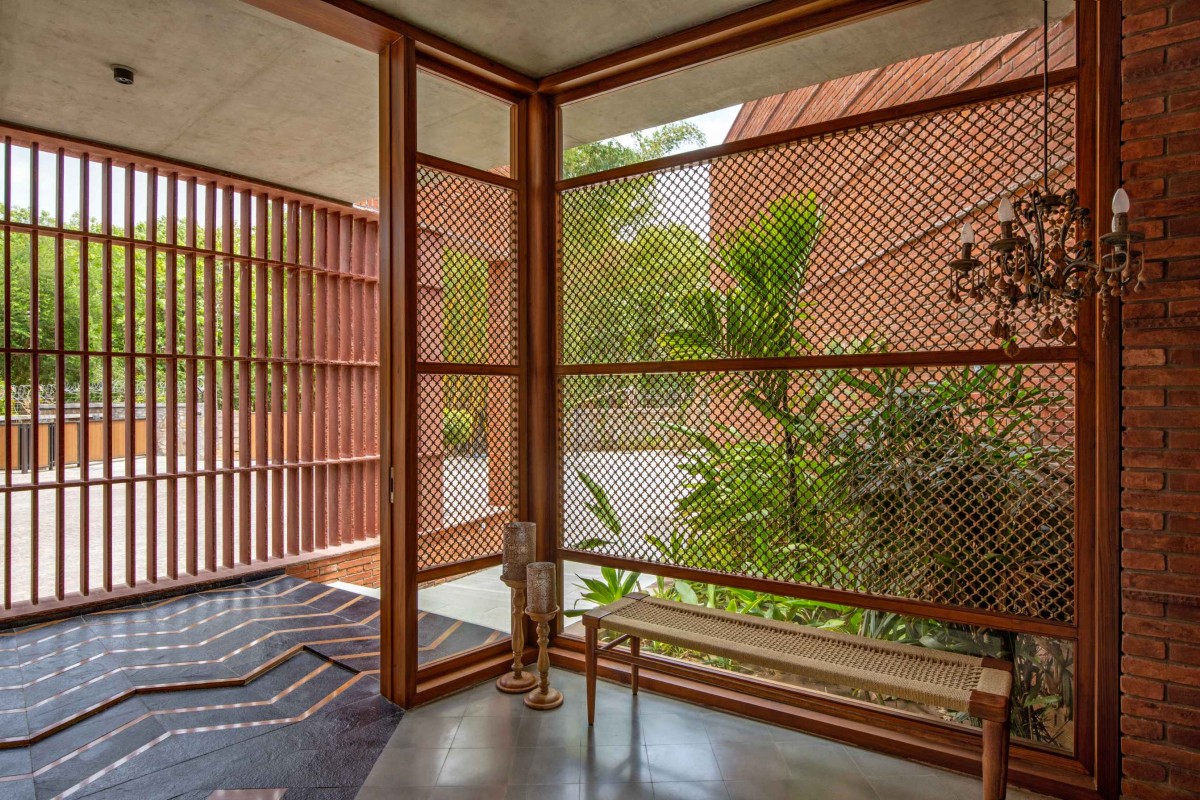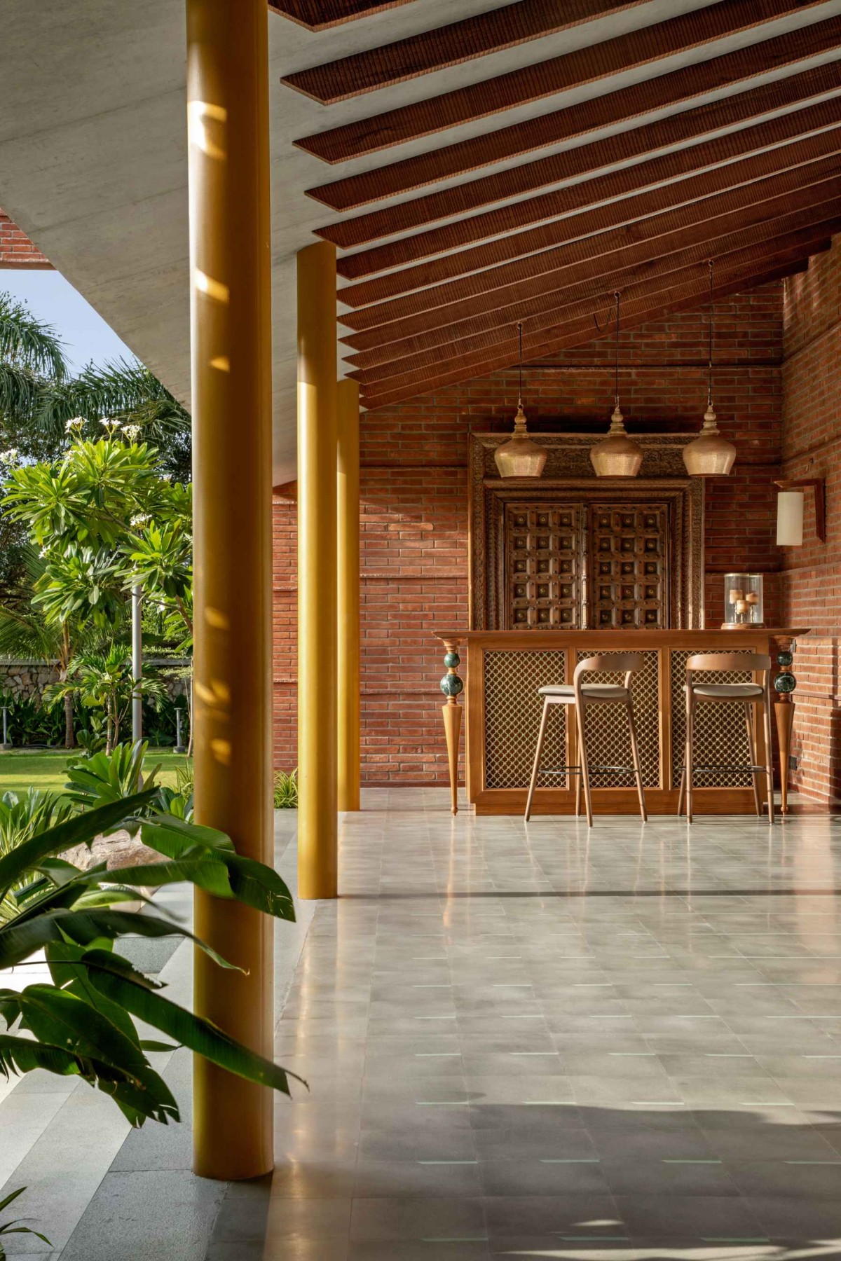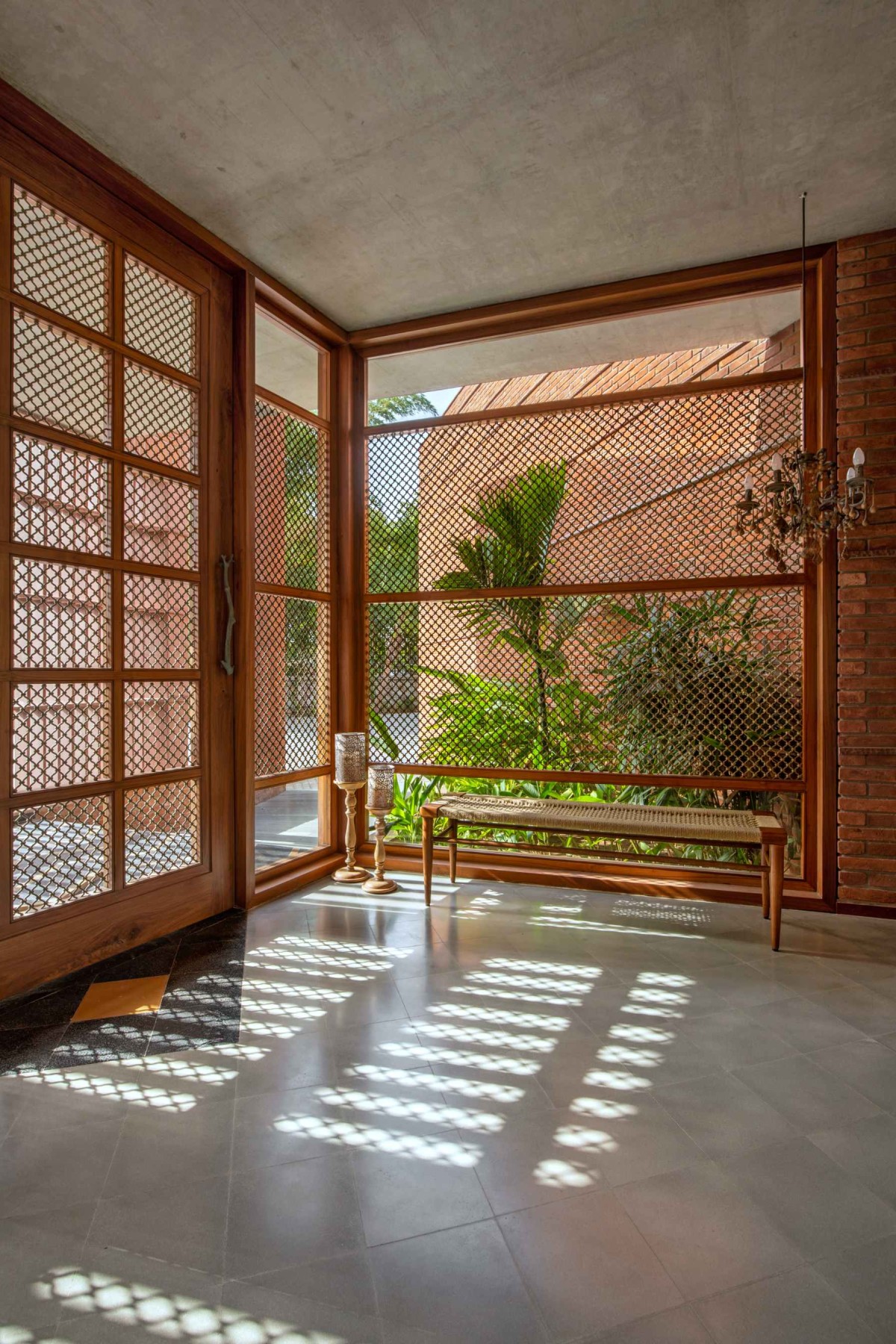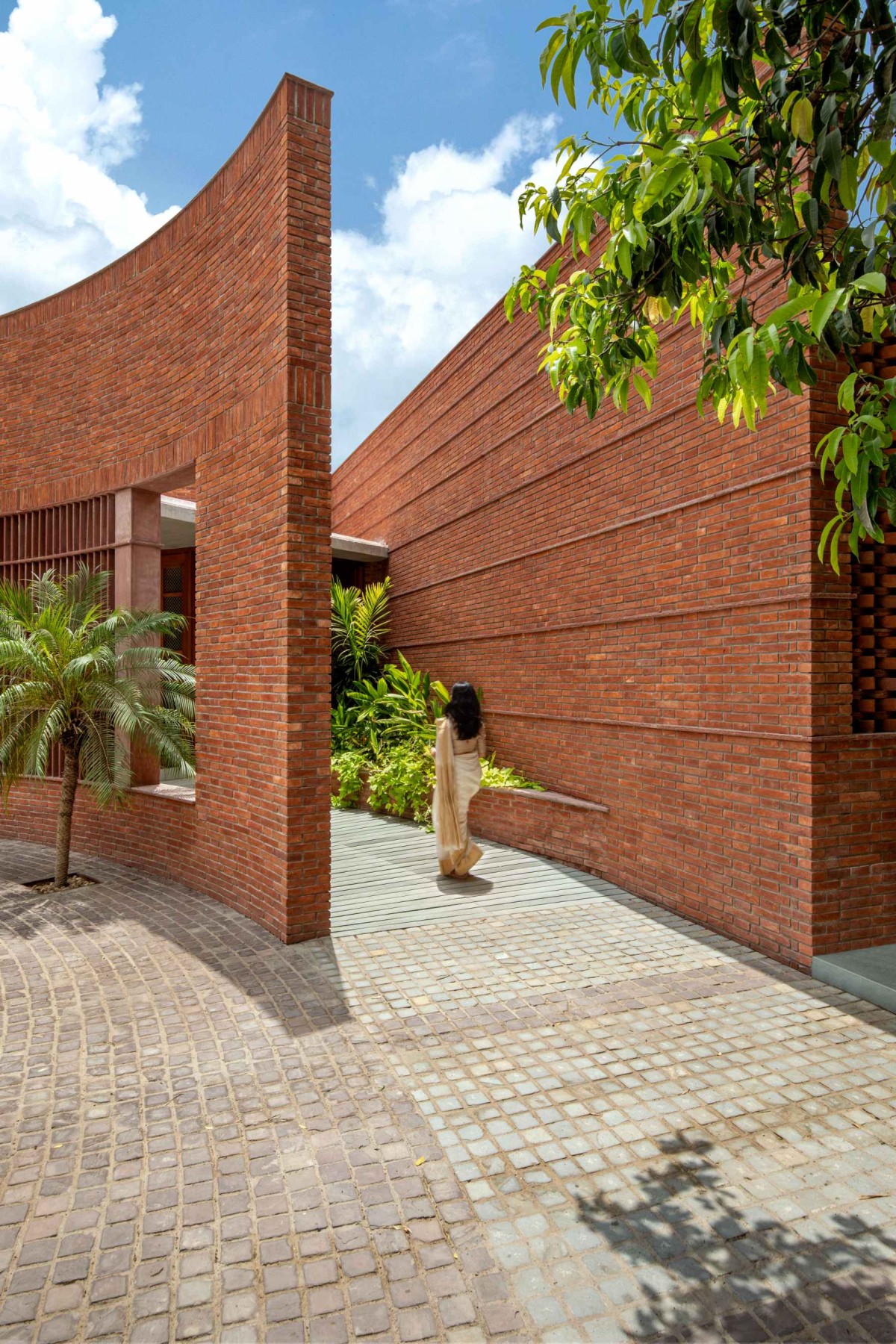 The overall experience of journeying towards the house is quite fascinating, filled with surprises at various stages. The first veil appears in the form of a tall concave wall done in a manner that makes it look like a gorgeous brick jali, lending it an opportunity to render the cobbled floor with engaging Sciography. Honestly, it is quite an element of suspense.