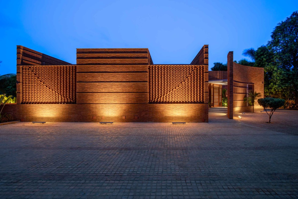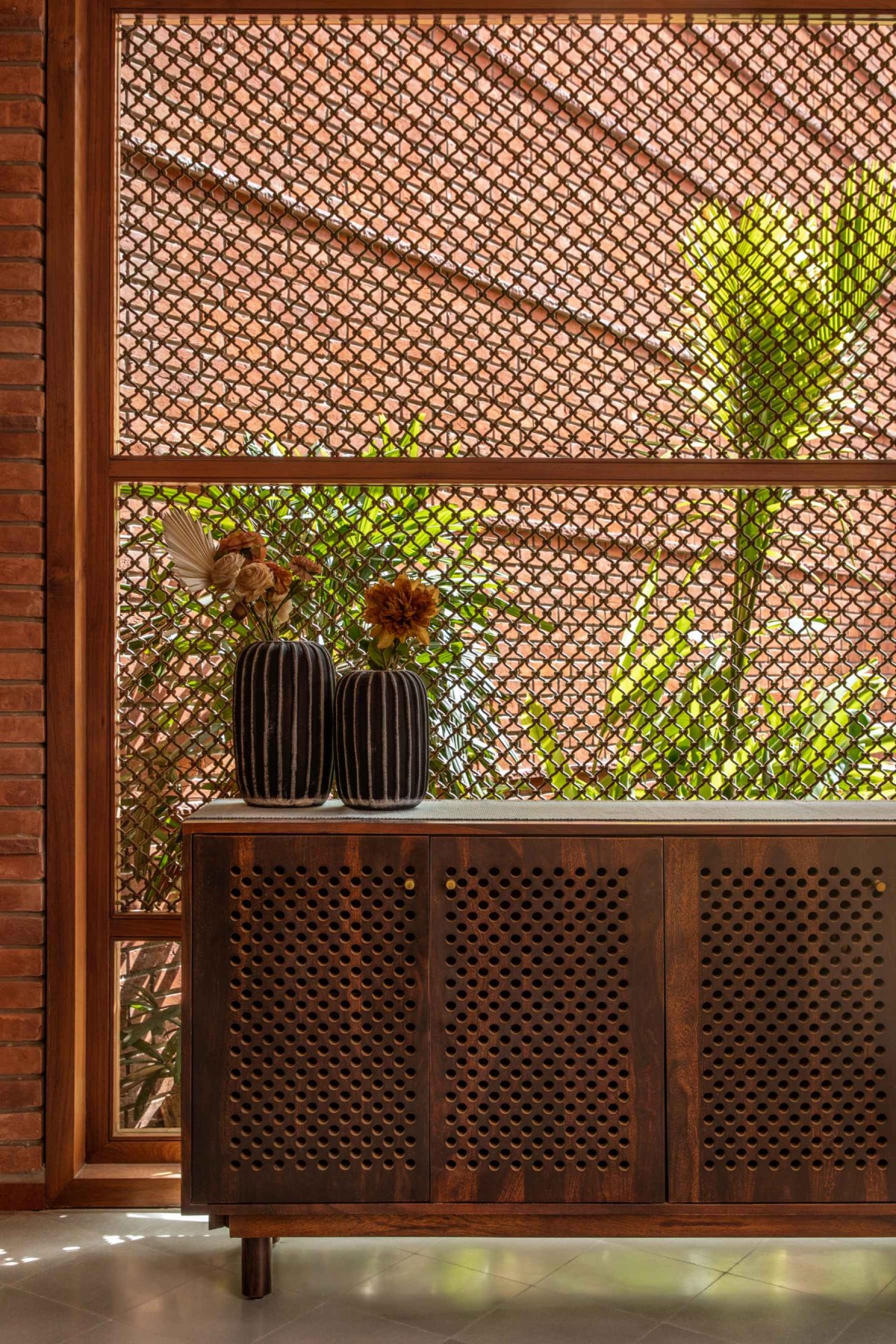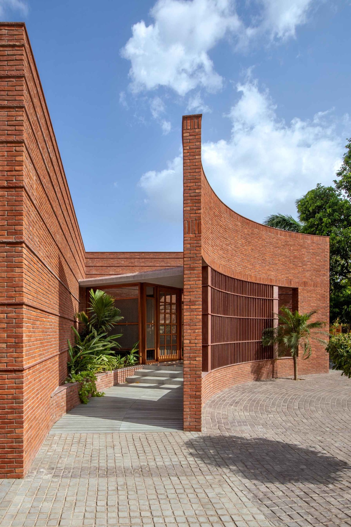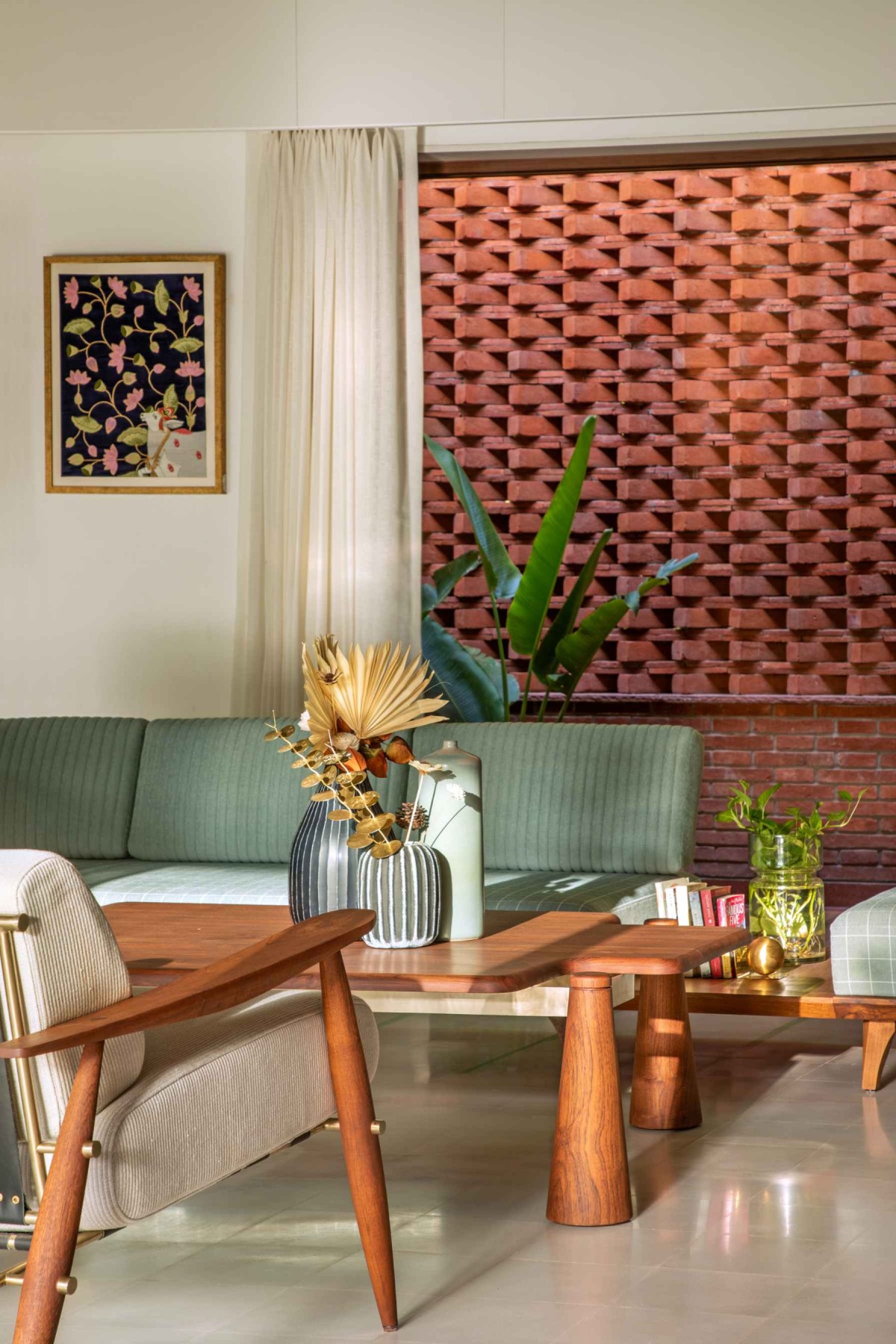 The overall experience of journeying towards the house is quite fascinating, filled with surprises at various stages. The first veil appears in the form of a tall concave wall done in a manner that makes it look like a gorgeous brick jali, lending it an opportunity to render the cobbled floor with engaging Sciography. Honestly, it is quite an element of suspense.