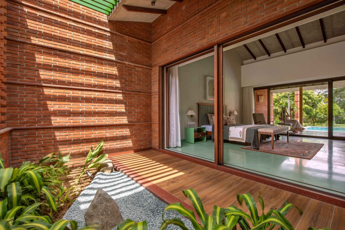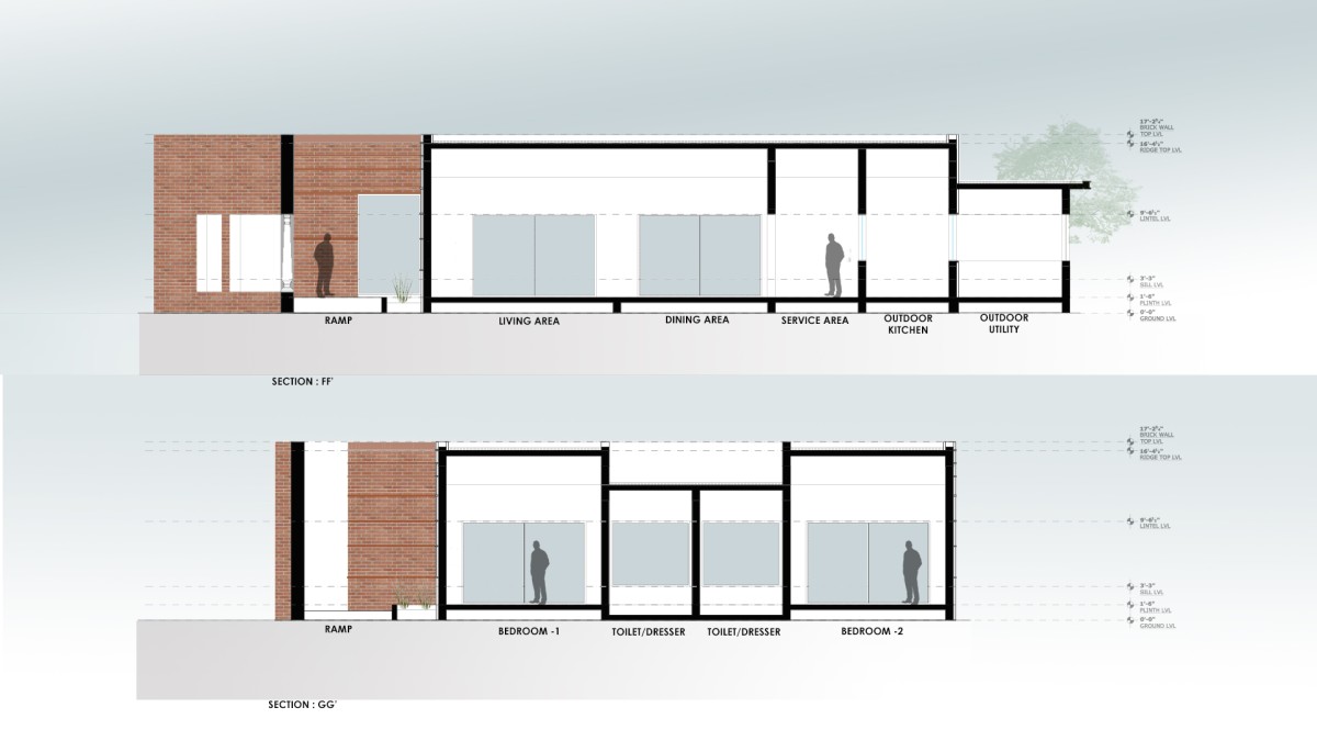 All spaces in the house, the living - dining and both bedrooms have a semi covered courtyard with subtle greens and brick jaali as a spill out space on one end. The ambulatory circumscribing the exteriors is another spill out on the other end of each of these rooms. Thus even though one is inside the house, there is a constant connection with the outdoors at all given times.