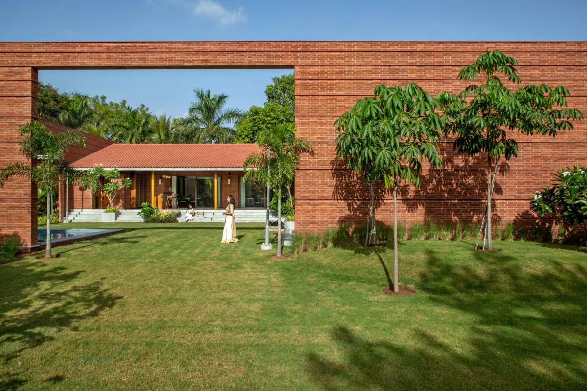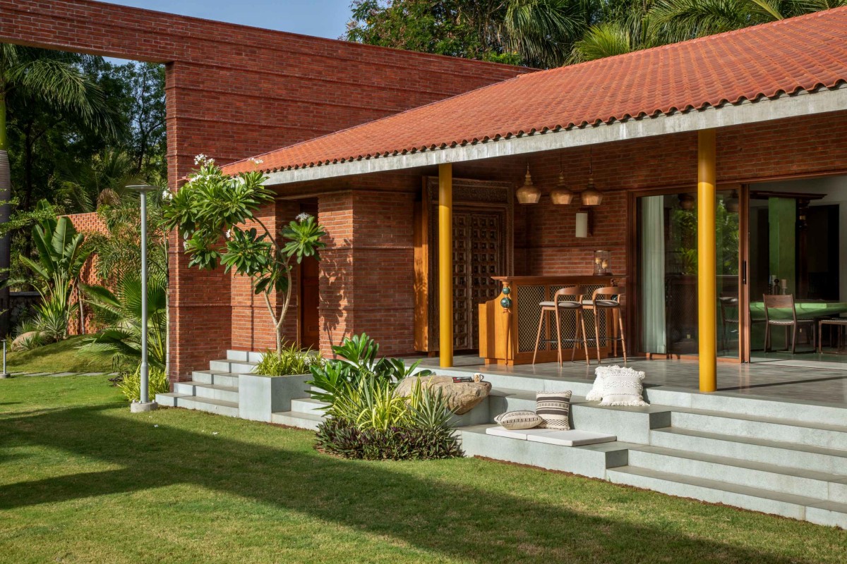 The plot is a squarish piece of land with a total area of roughly 43,600 Sq. Ft with a beautiful parcel of land with existing orchard and a minimal client requirement of simply 2 bedrooms and a kitchen, dining, they had the opportunity to sprawl around and limit the house to just one floor. Since, it was a farmhouse, the effort was to lend it a character similar to country side houses. Thus the use of bricks, sloping roof and manglore tiles.
