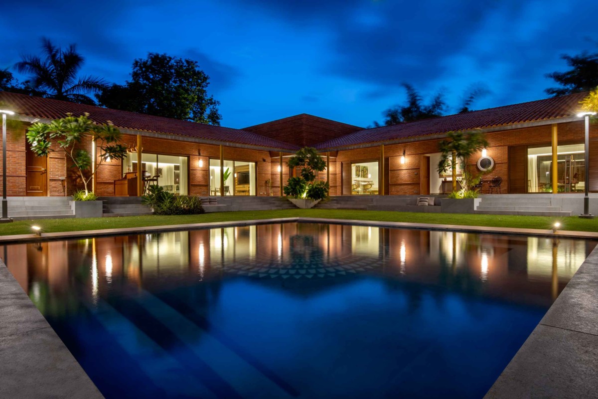 Dusk light exterior view of Sitish Parikh Farmhouse by Dipen Gada and Associates