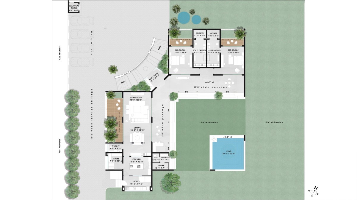 The house is surrounded by a picturesque garden with a small orchard on one corner of the site. It nests a tiny circular seating area under it. There is another Terminalia court on the other side of the garden and a jogging track along the periphery of the plot.