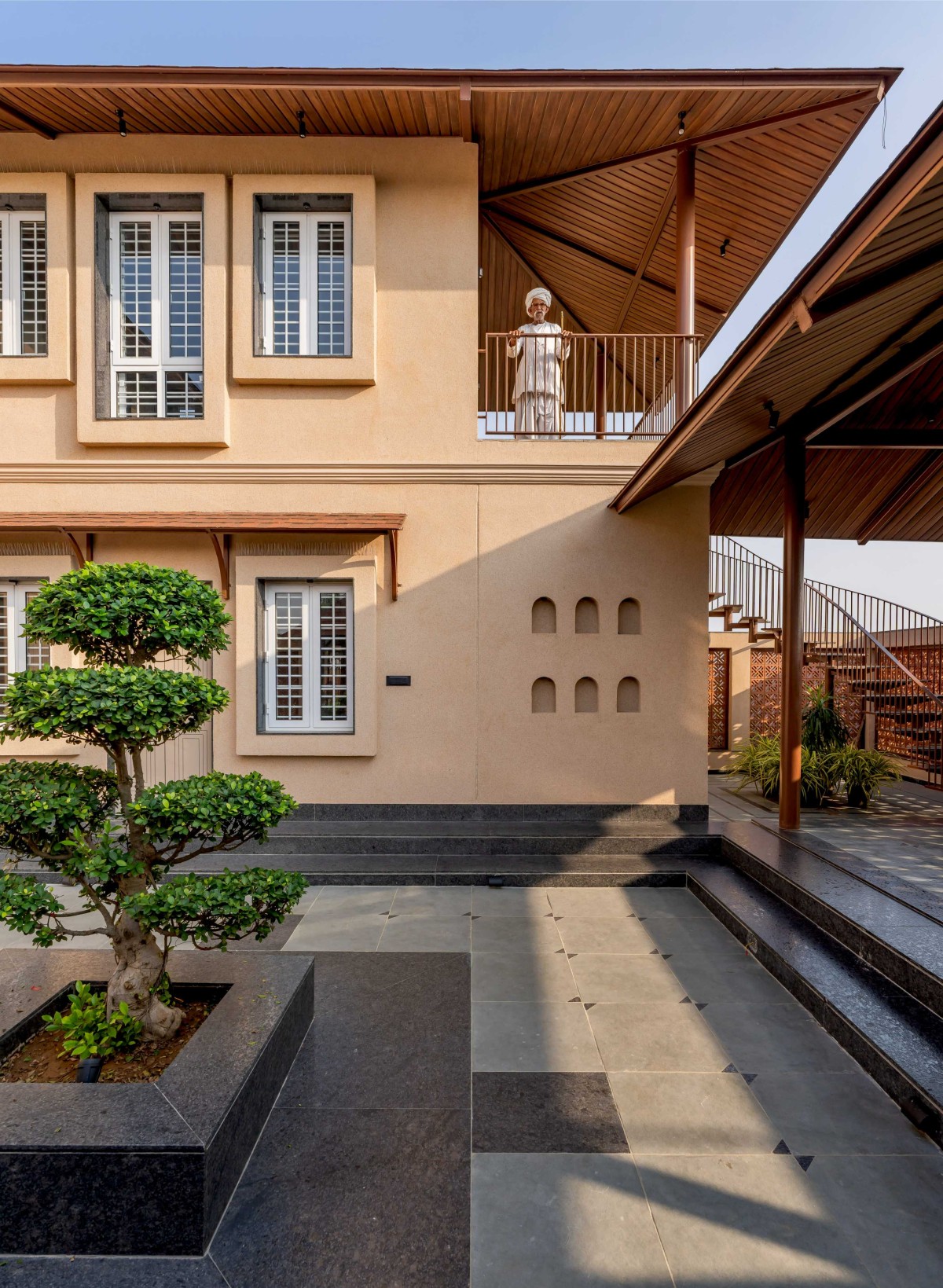 Material choices further root the project in its context. Textured plastered walls soften the massing and recall traditional village homes. Terracotta jaalis line the south-west shaded portico, enabling cross-ventilation while casting intricate patterns of light on the natural stone floors. Indian stone flooring composed of kota and kadappa stones ensures durability and thermal comfort, and invites visitors to sit on the floor, as is customary in this part of the world. At the heart of the entrance courtyard sits a carefully nurtured bonsai, tended by the client for years, symbolizing continuity, patience, and the personal history that grounds the home.