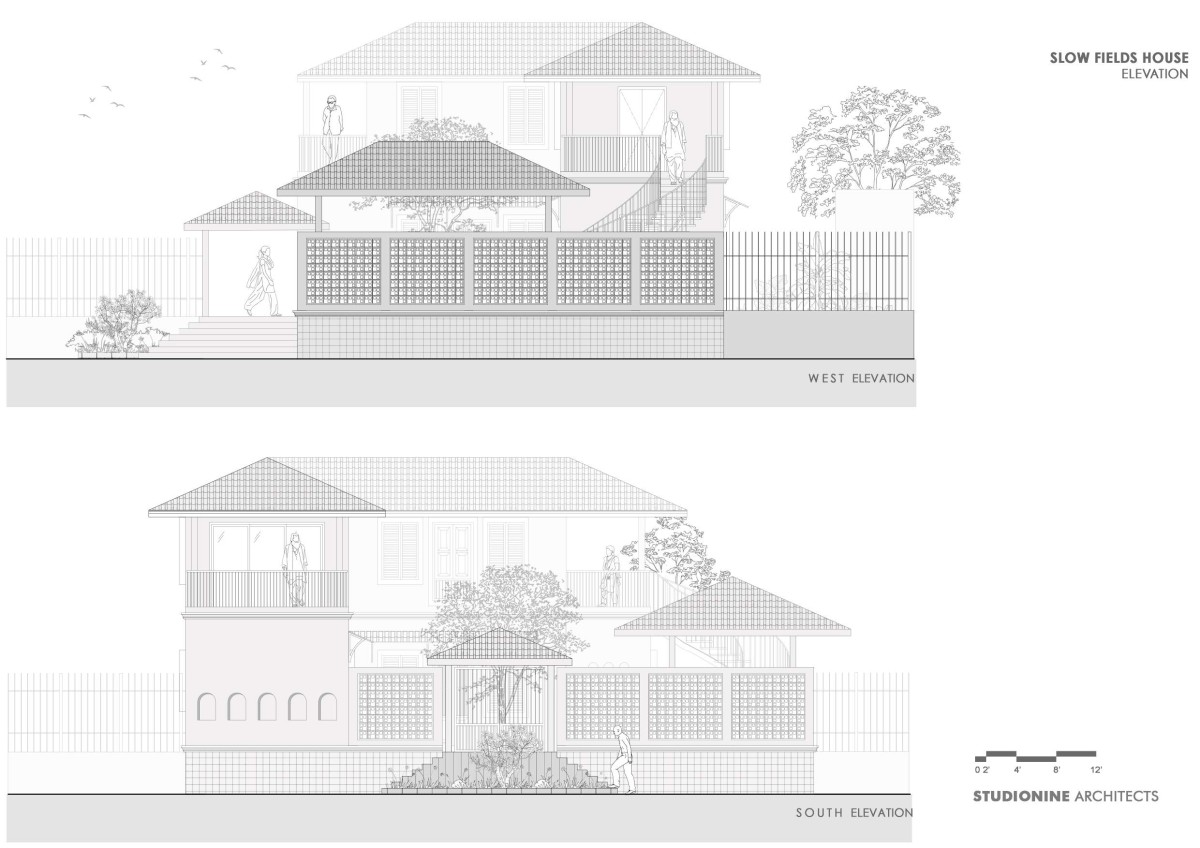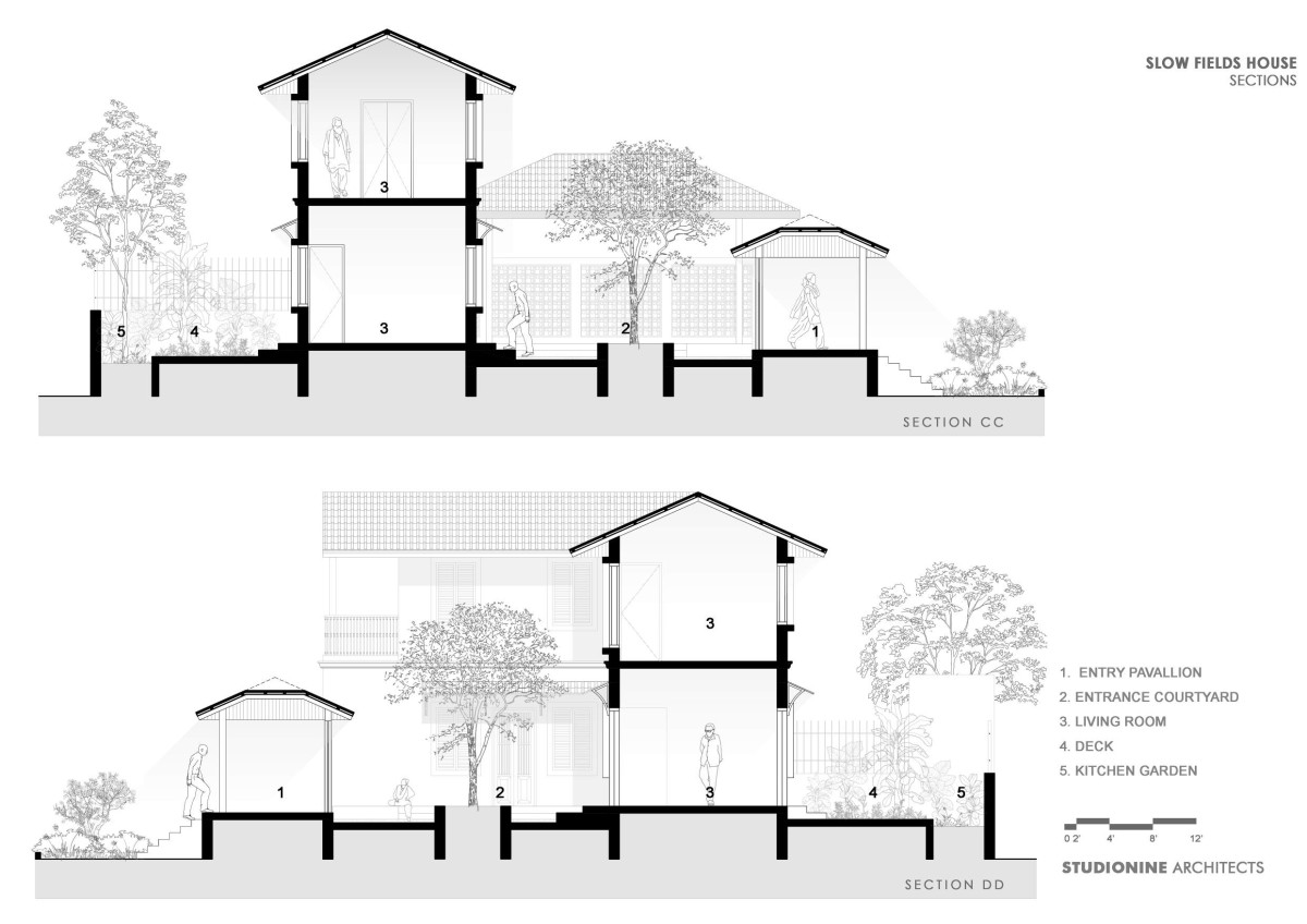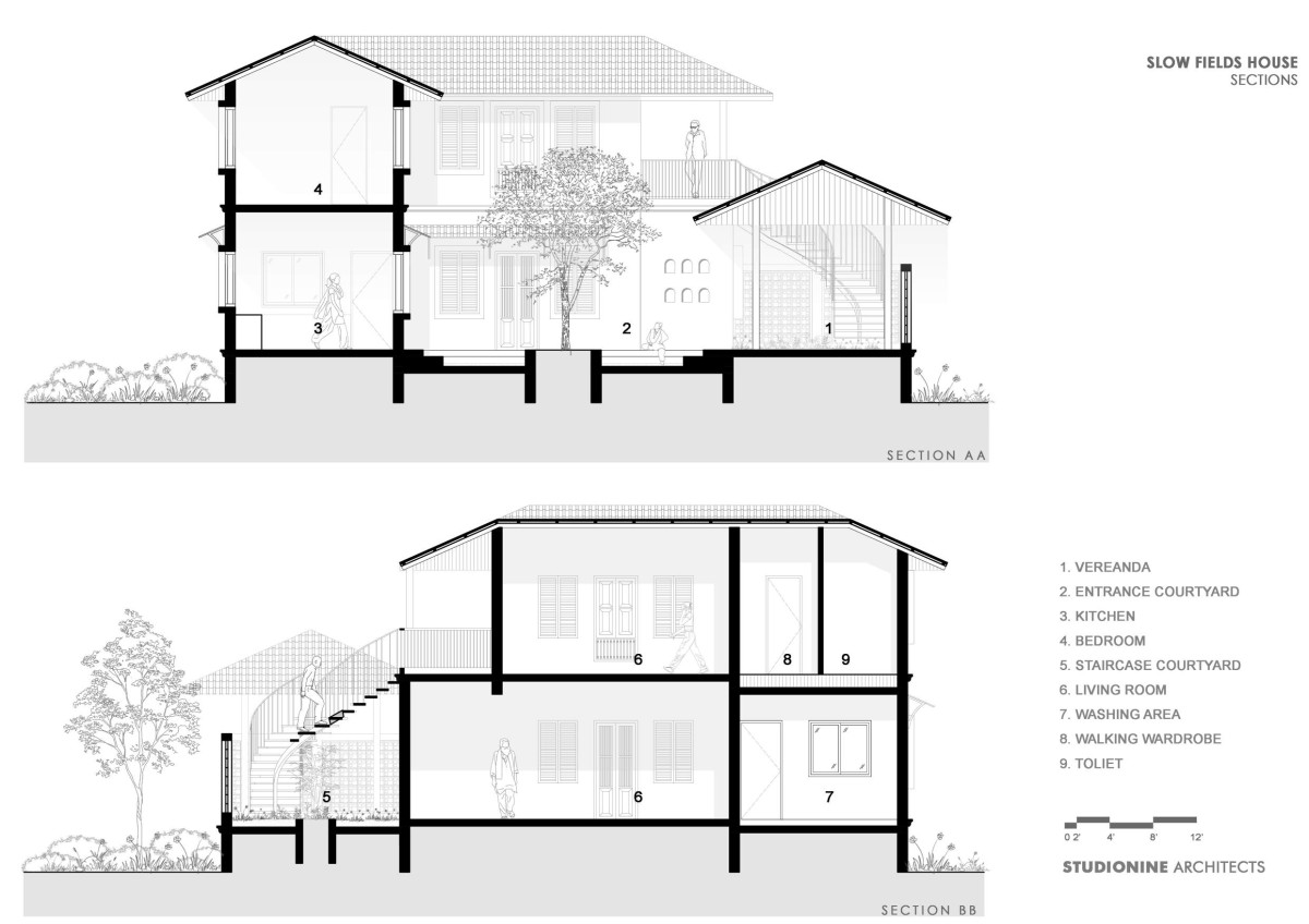 The experience of inhabiting the home is guided by sensory stillness—dappled sunlight, shifting shade, the breeze moving through perforated screens, and long views toward the fields. The spaces are scaled to host people generously, replicating the social openness of traditional village households. The home becomes a setting for unhurried interactions: conversations under the verandah, children playing in the courtyard, elders resting in the filtered light.