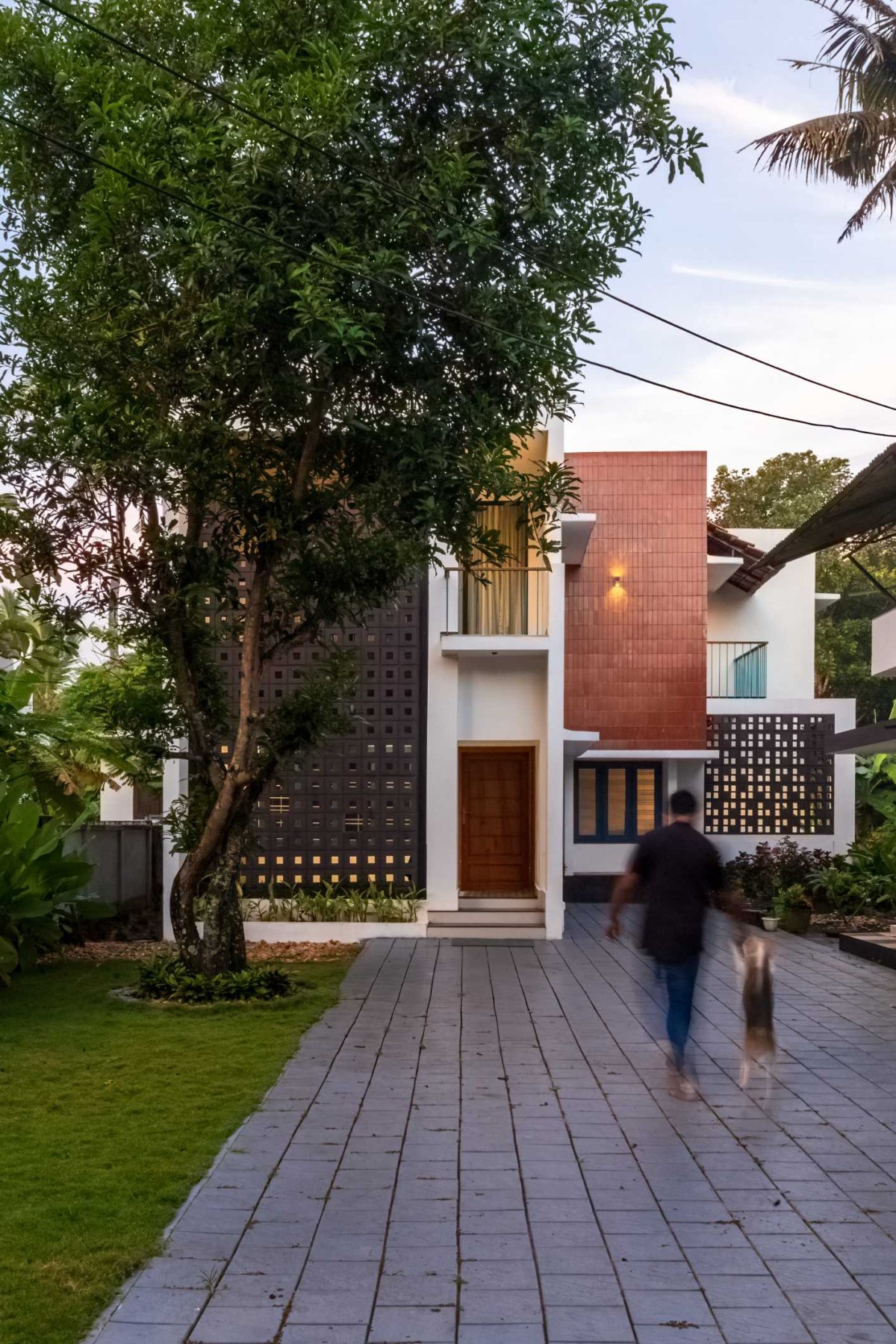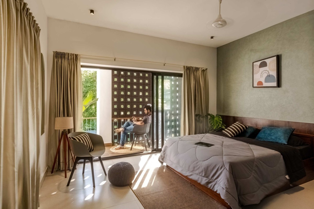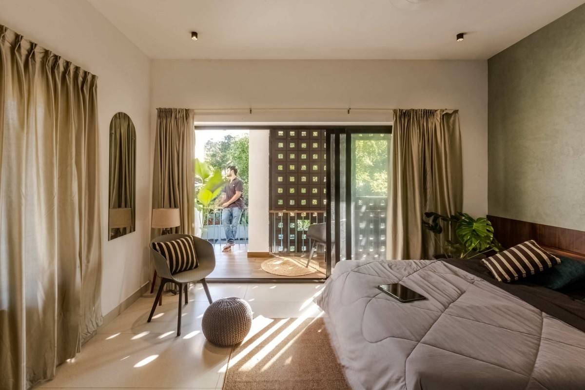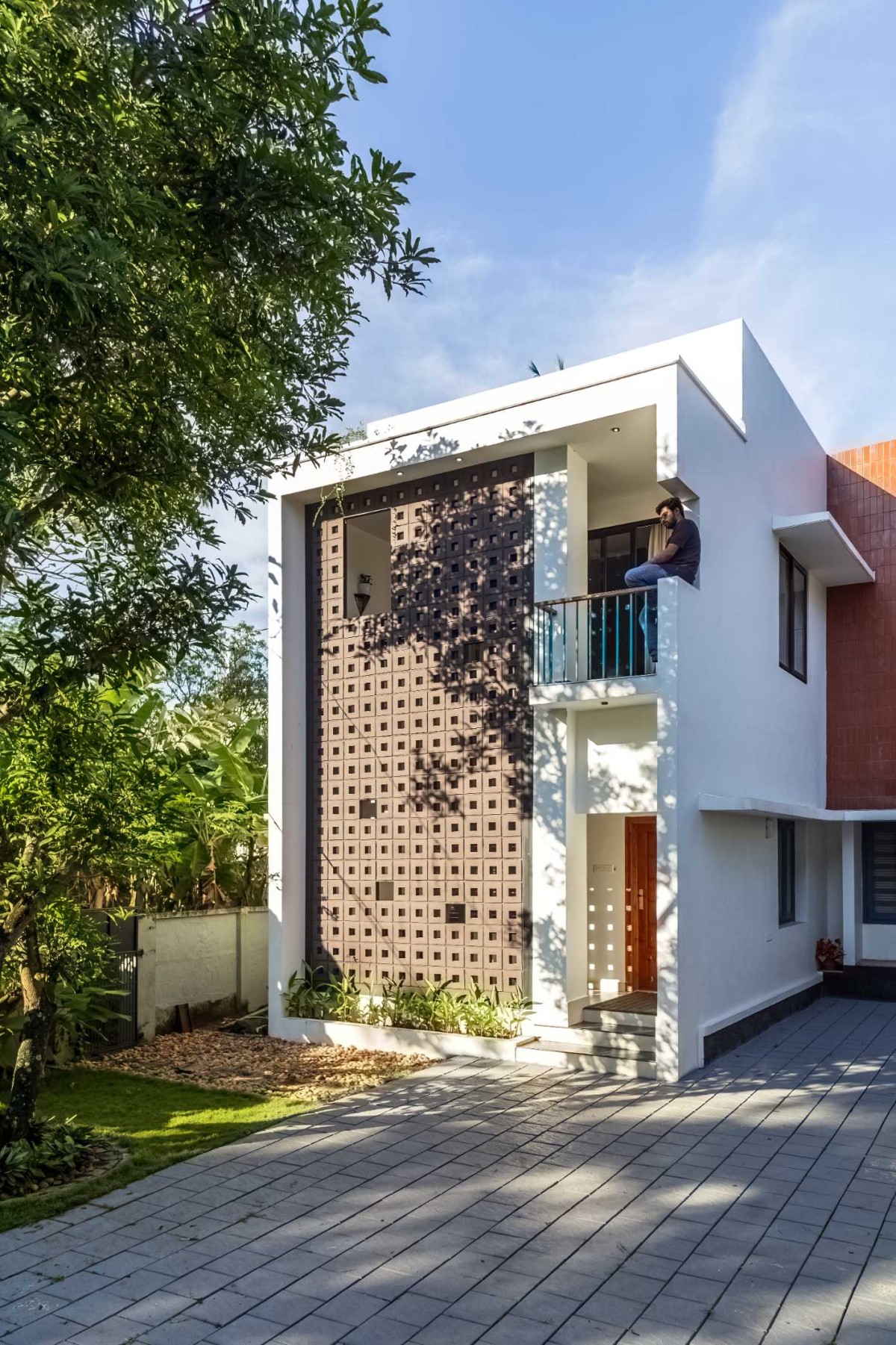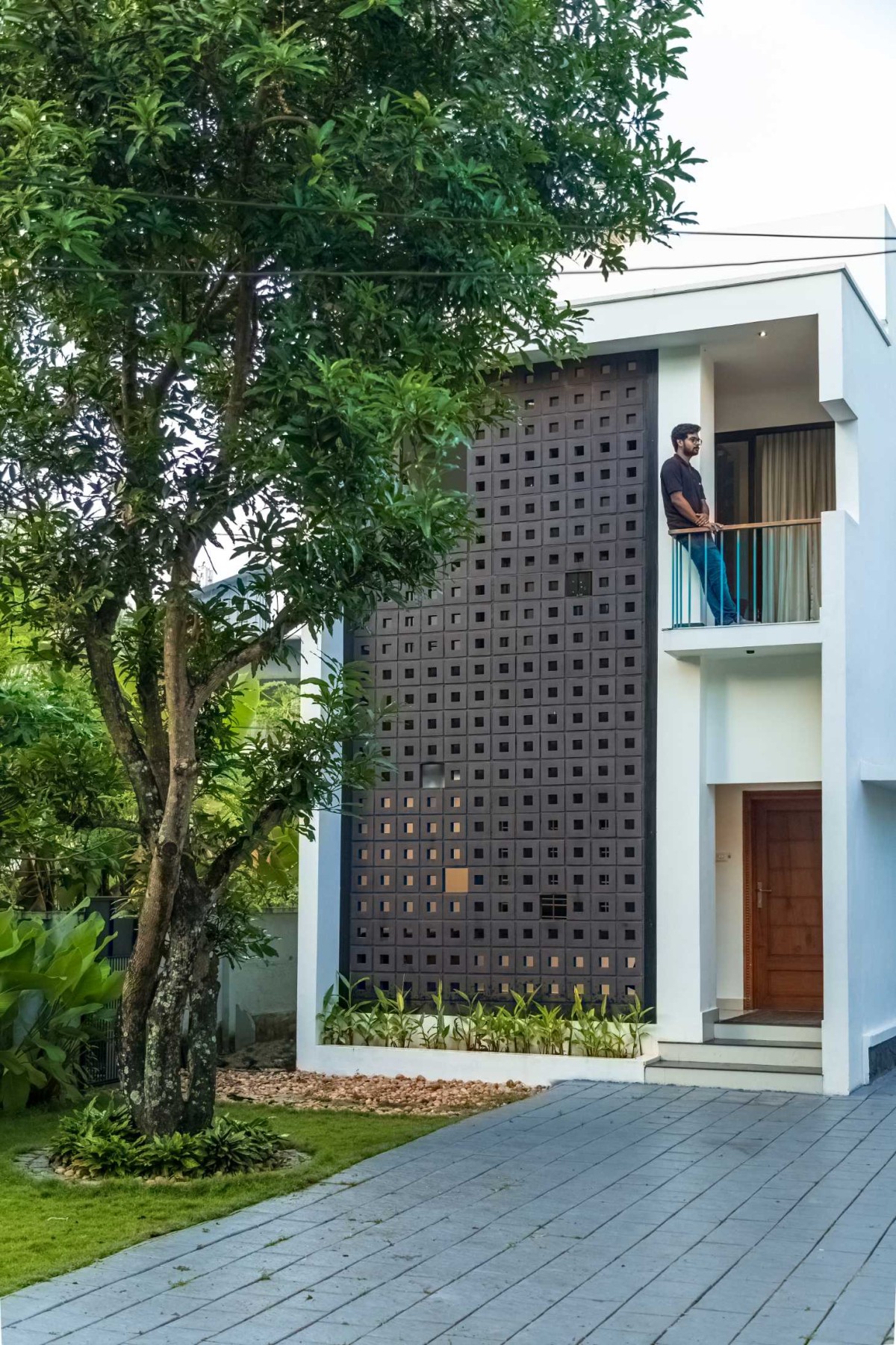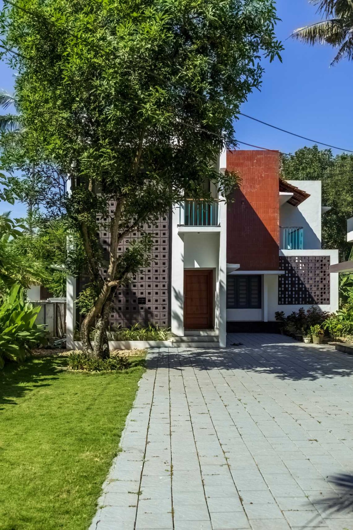 The landscape of this house is aligned longitudinally around the existing mango tree, with the lush foliage of Calathea lutea running alongside the compound wall. vertically prominent elevation with a color palette that stays close to the nature, with its terracotta textures and earthy tinted jaalis stands out in the green backdrop. The massiveness of the high jaali wall in the façade is broken down with and exposed balcony placed right beside it. This balcony that emerges from the main bedroom with its glass walls, overlooks the entry way, exhibiting magnificence.