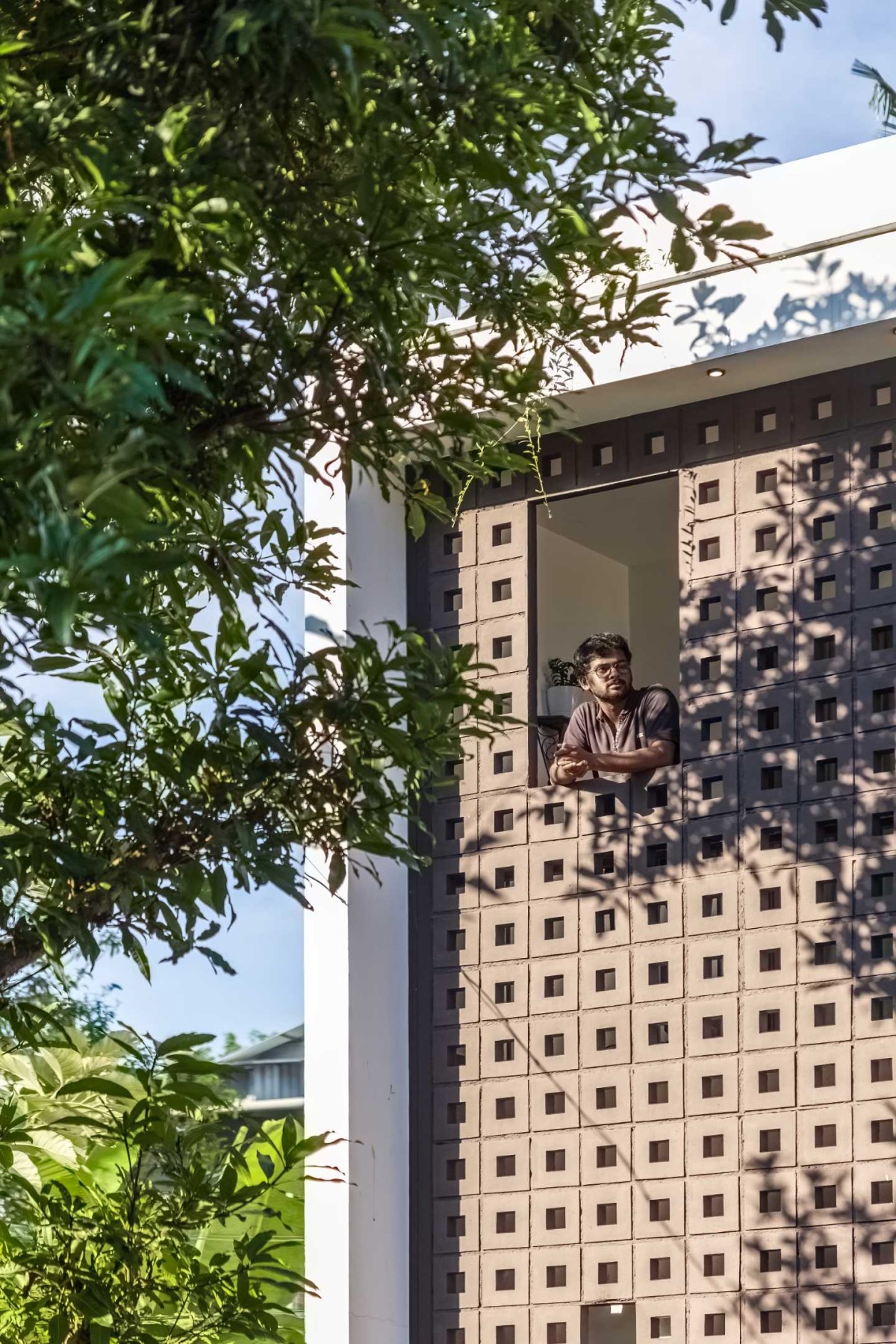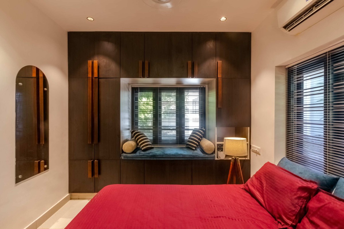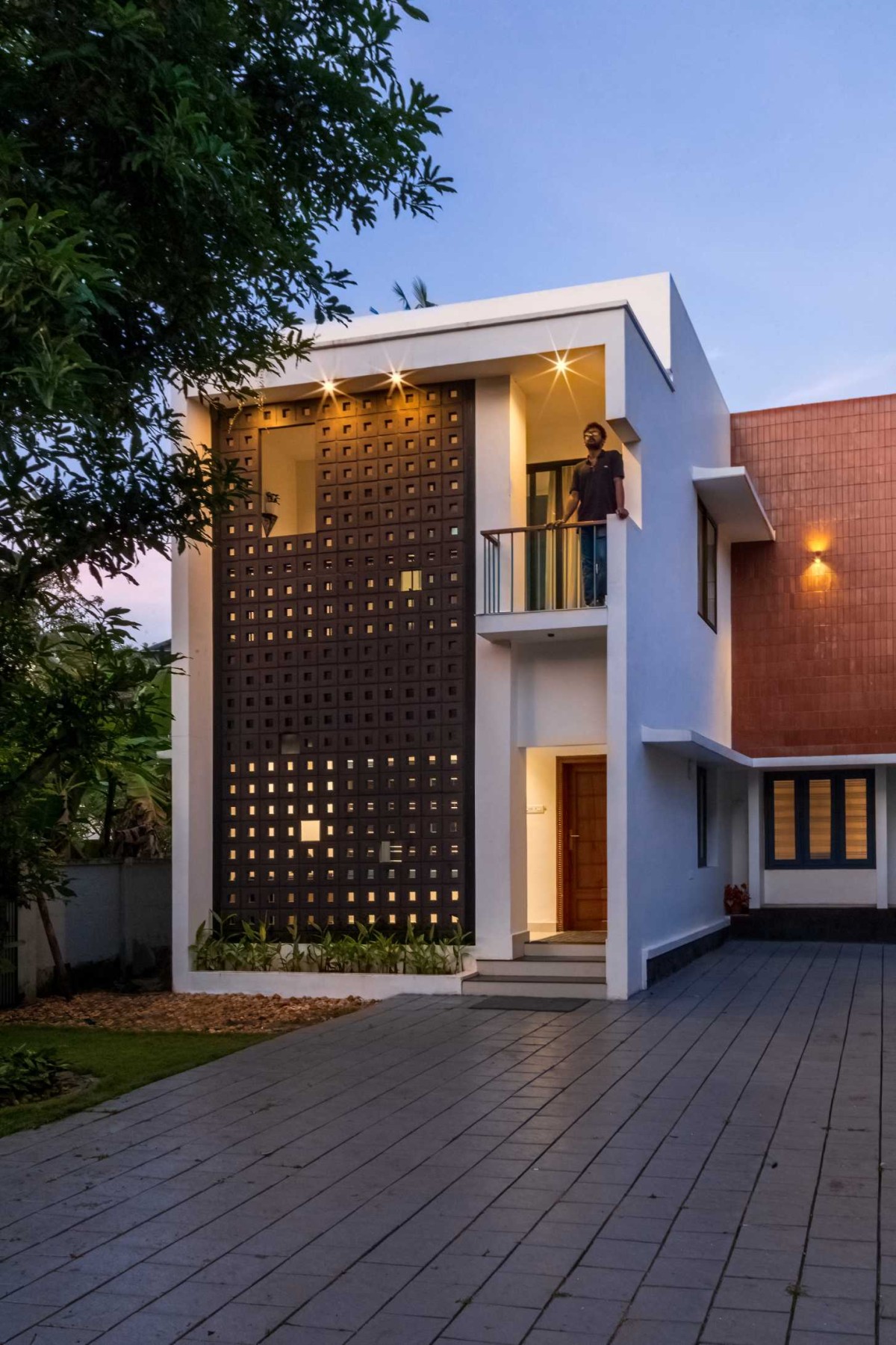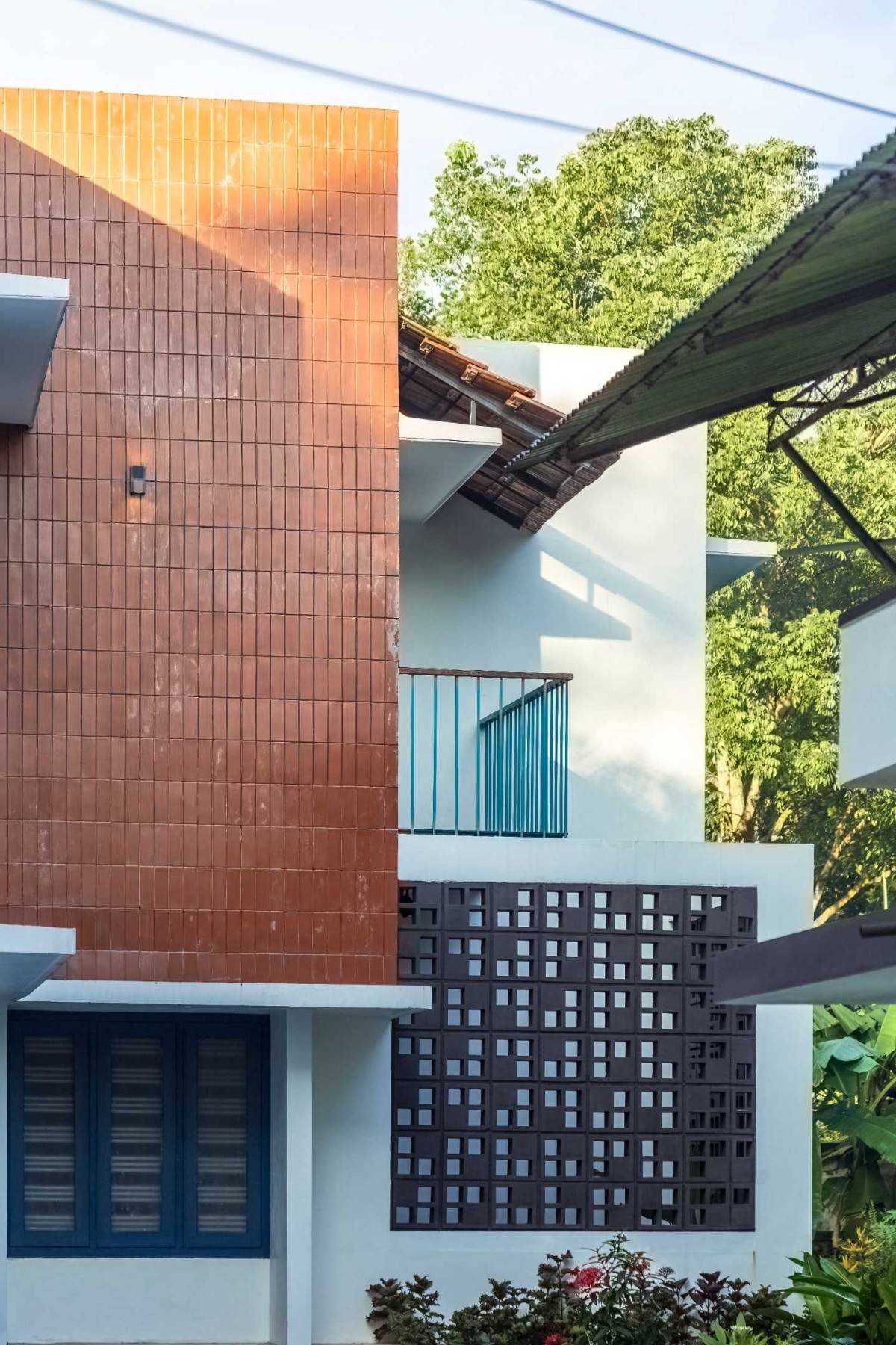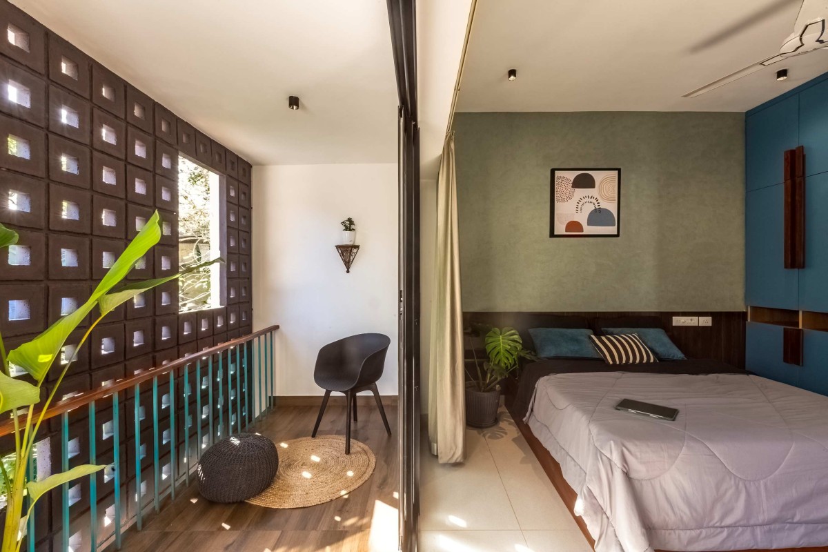 The landscape of this house is aligned longitudinally around the existing mango tree, with the lush foliage of Calathea lutea running alongside the compound wall. vertically prominent elevation with a color palette that stays close to the nature, with its terracotta textures and earthy tinted jaalis stands out in the green backdrop. The massiveness of the high jaali wall in the façade is broken down with and exposed balcony placed right beside it. This balcony that emerges from the main bedroom with its glass walls, overlooks the entry way, exhibiting magnificence.