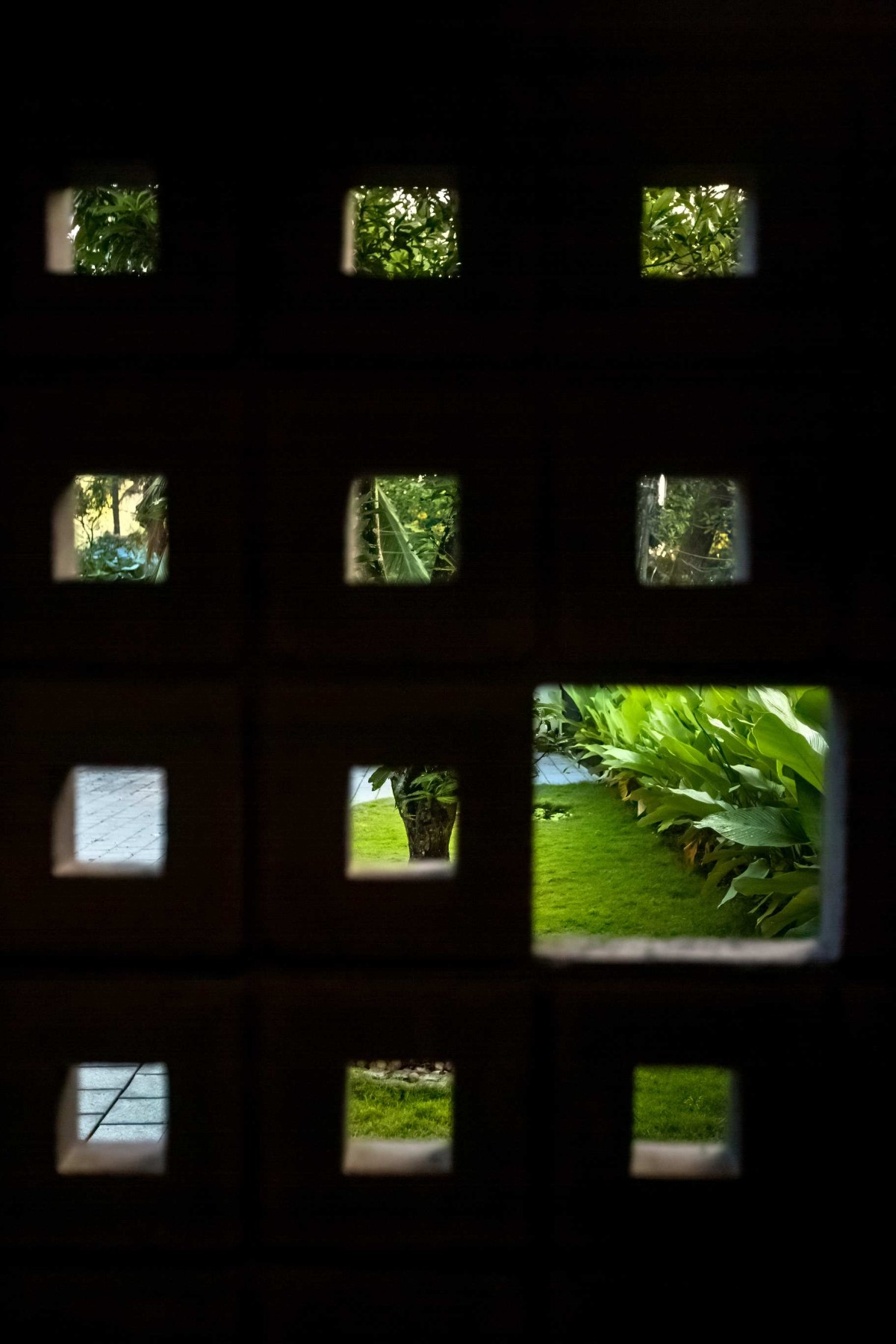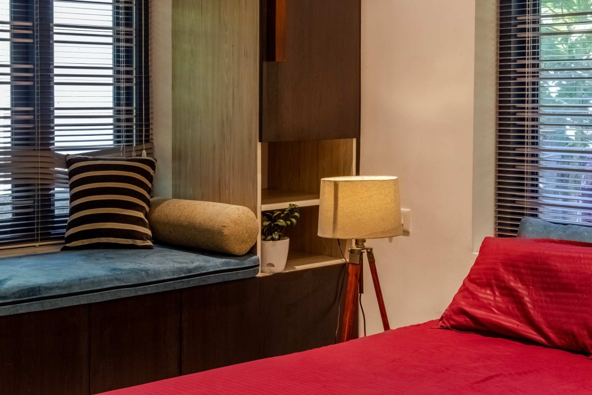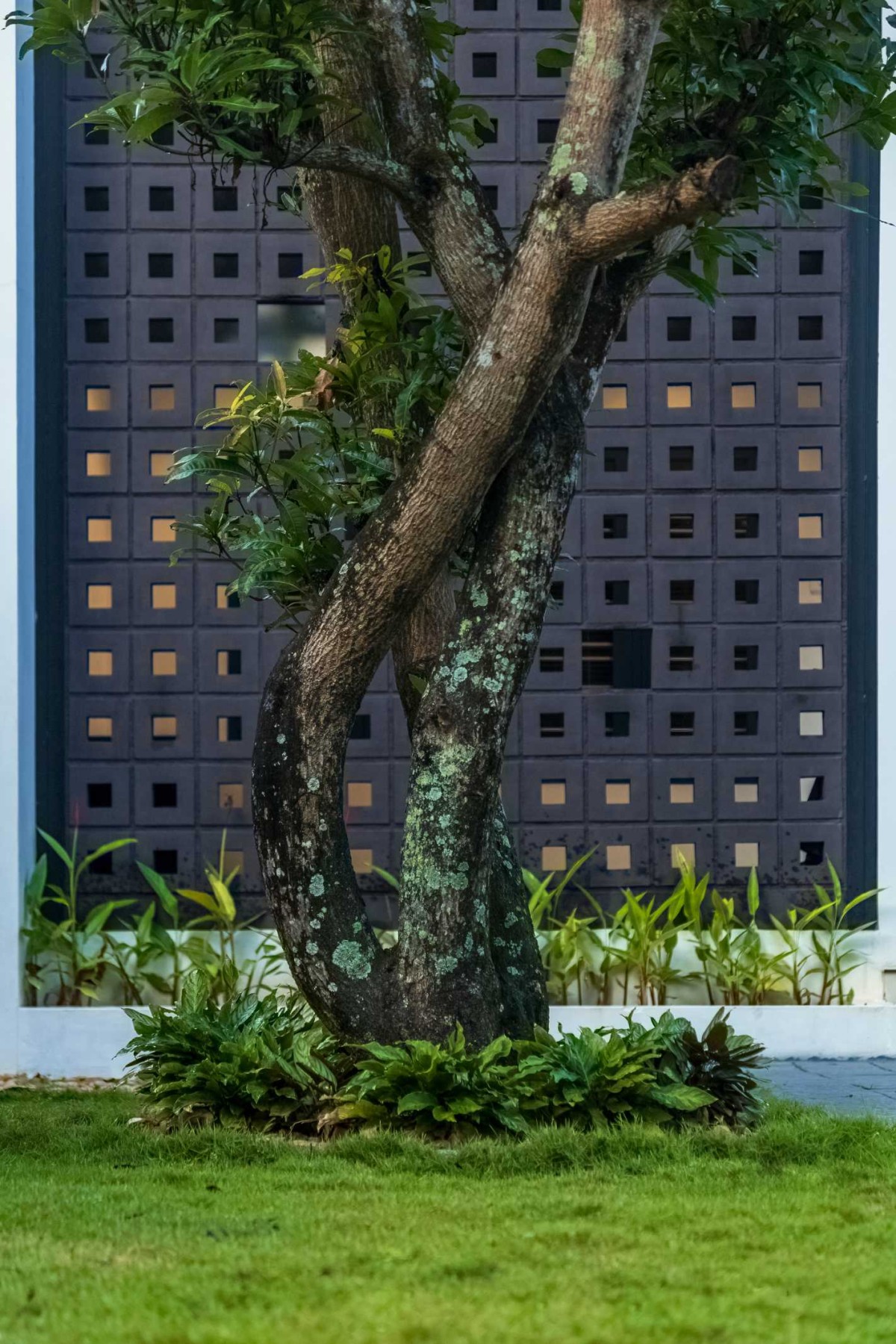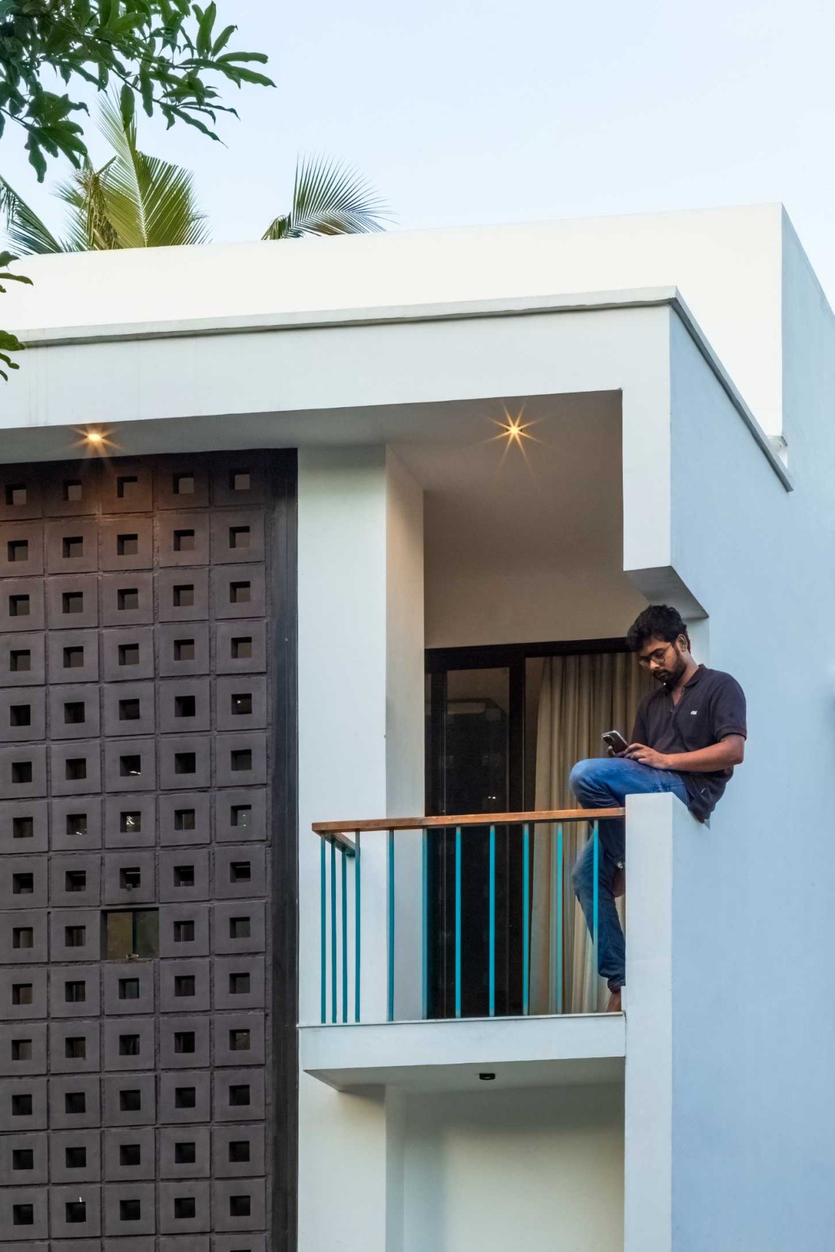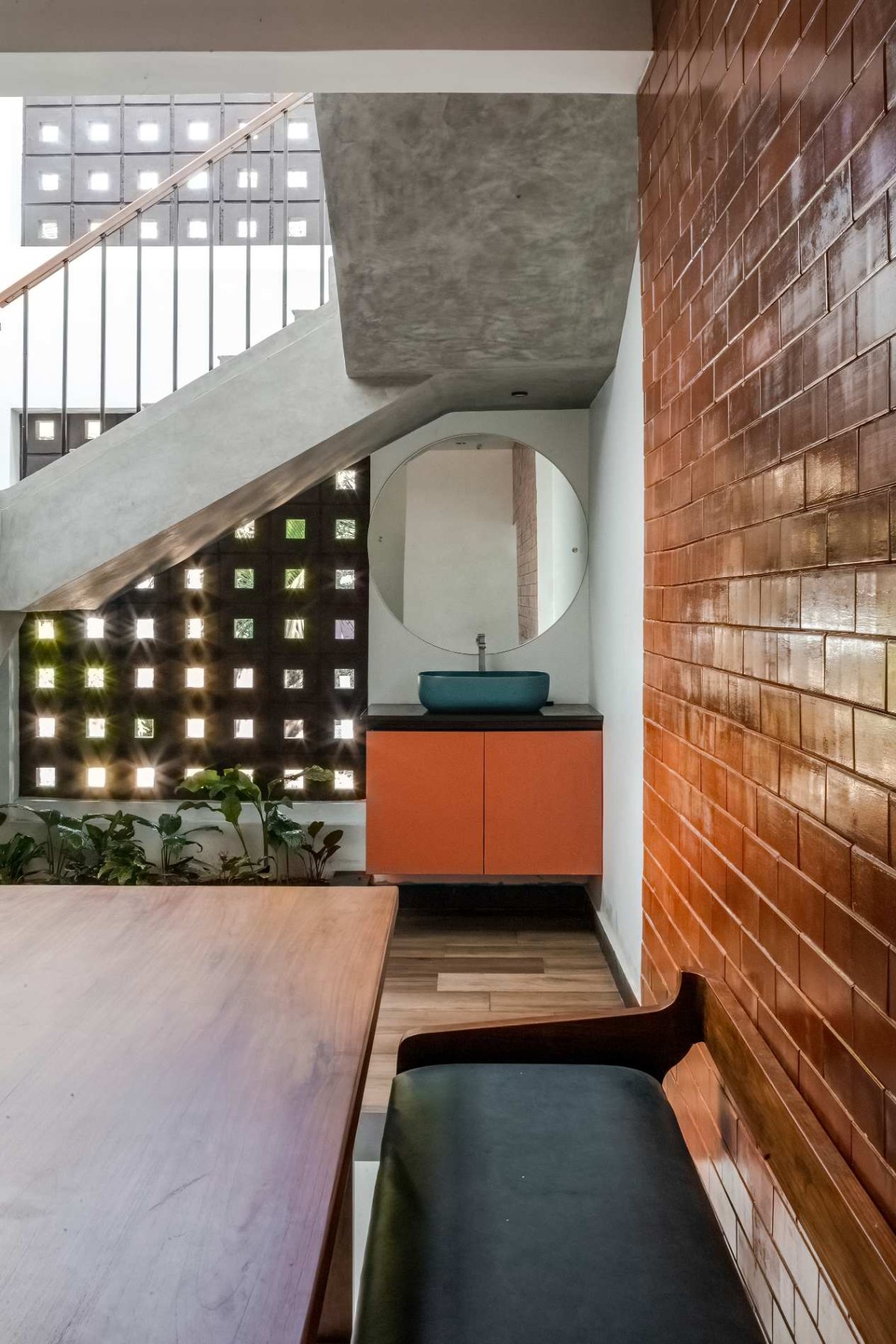 The landscape of this house is aligned longitudinally around the existing mango tree, with the lush foliage of Calathea lutea running alongside the compound wall. vertically prominent elevation with a color palette that stays close to the nature, with its terracotta textures and earthy tinted jaalis stands out in the green backdrop. The massiveness of the high jaali wall in the façade is broken down with and exposed balcony placed right beside it. This balcony that emerges from the main bedroom with its glass walls, overlooks the entry way, exhibiting magnificence.