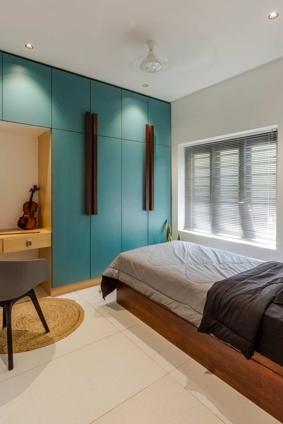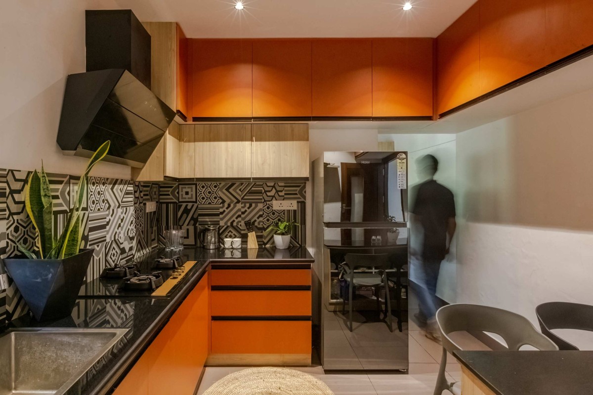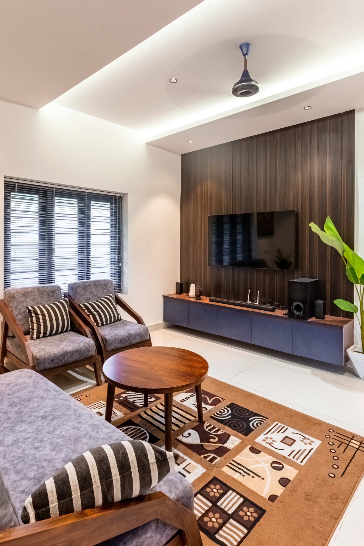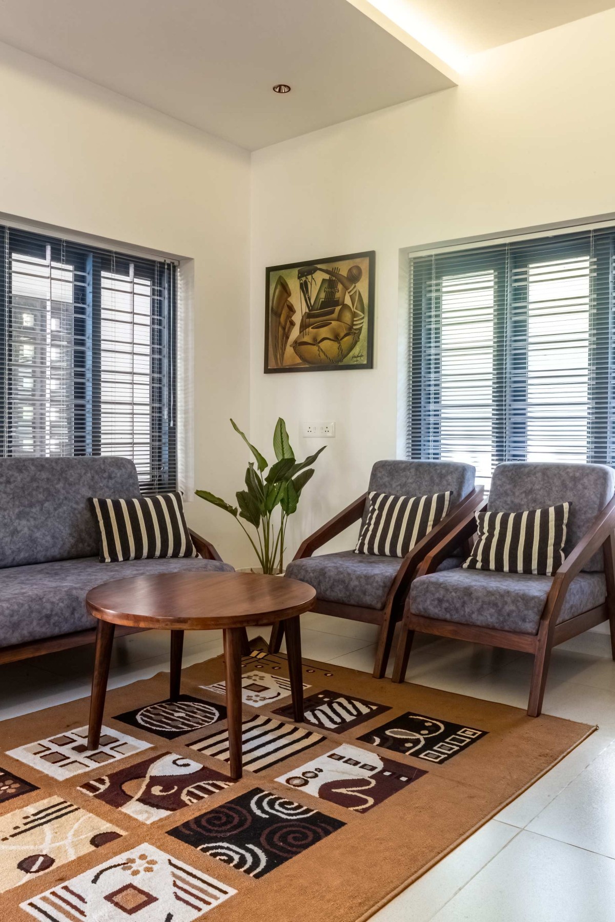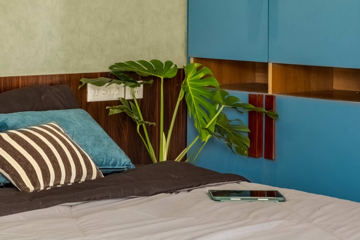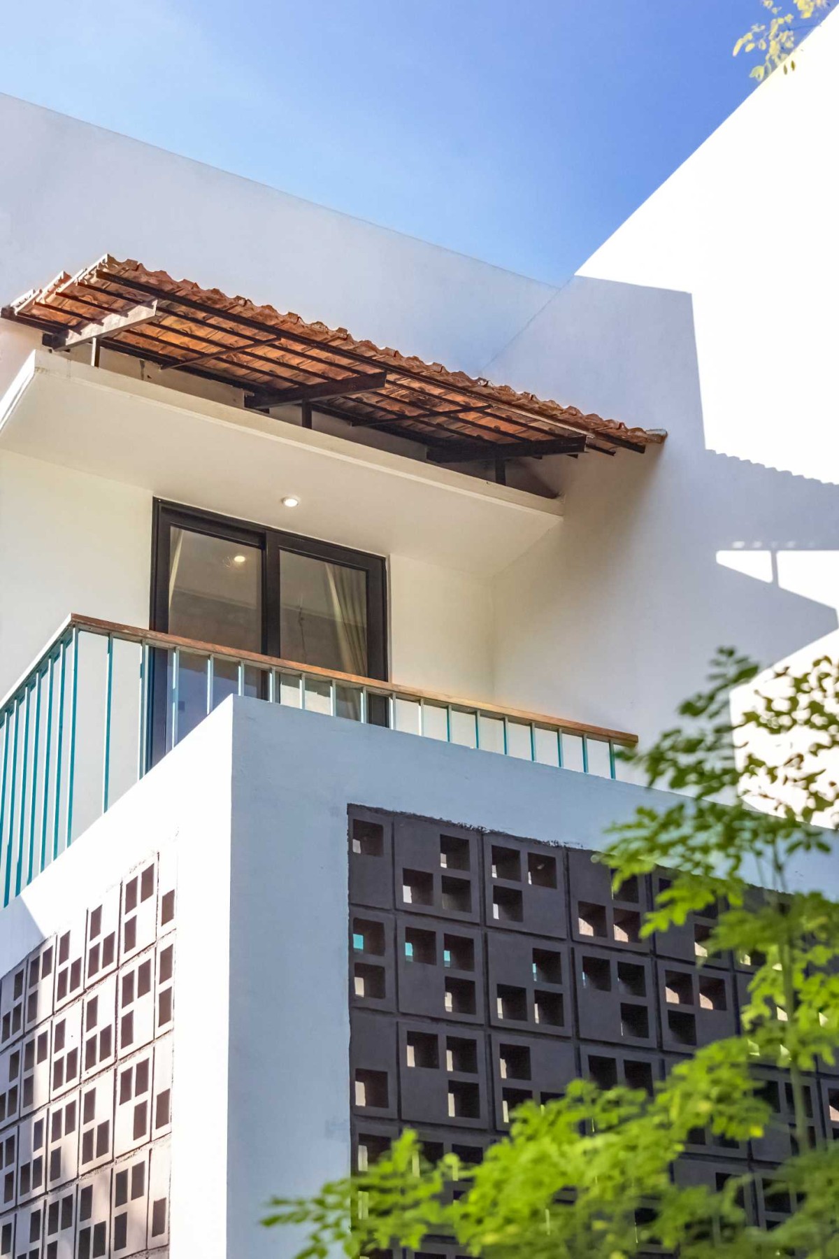 The landscape of this house is aligned longitudinally around the existing mango tree, with the lush foliage of Calathea lutea running alongside the compound wall. vertically prominent elevation with a color palette that stays close to the nature, with its terracotta textures and earthy tinted jaalis stands out in the green backdrop. The massiveness of the high jaali wall in the façade is broken down with and exposed balcony placed right beside it. This balcony that emerges from the main bedroom with its glass walls, overlooks the entry way, exhibiting magnificence.