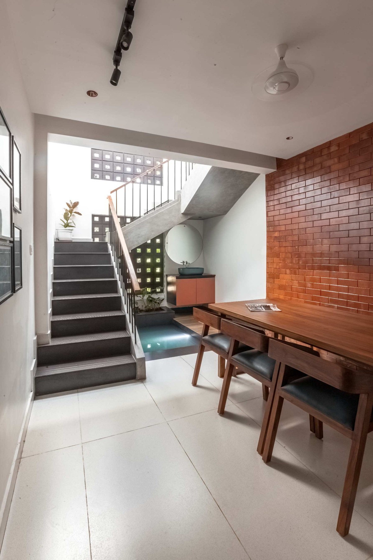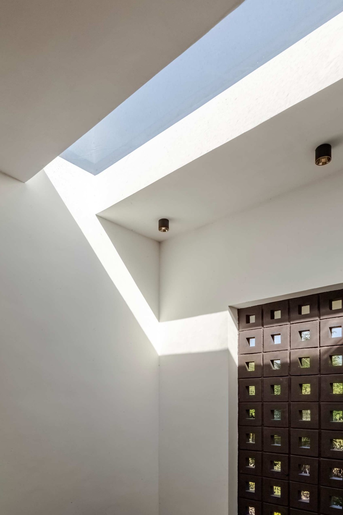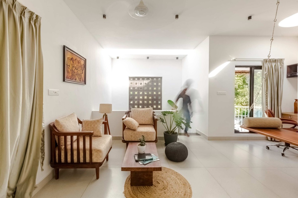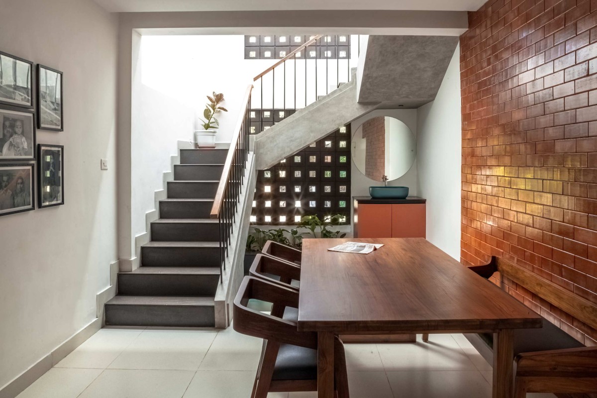 The interiors are spacious and efficient, polished to the point where one can't tell between the new and the old. The association of jaali walls and a waterbody inside the stair room complements the natural wind flow inside the dining room, as an exemplar of breathing architecture, and suffuse the room with soft daylight. The skylight positioned above the stairs enhance natural lighting in the interior and creates shadow plays throughout the day. The common balcony is positioned in favor of the rays of the setting sun and the windy west side of the house. The extended courtyard acts as a wind channel which is connected to the balcony, thereby serving it with a view, and acting as a vertical communication space.