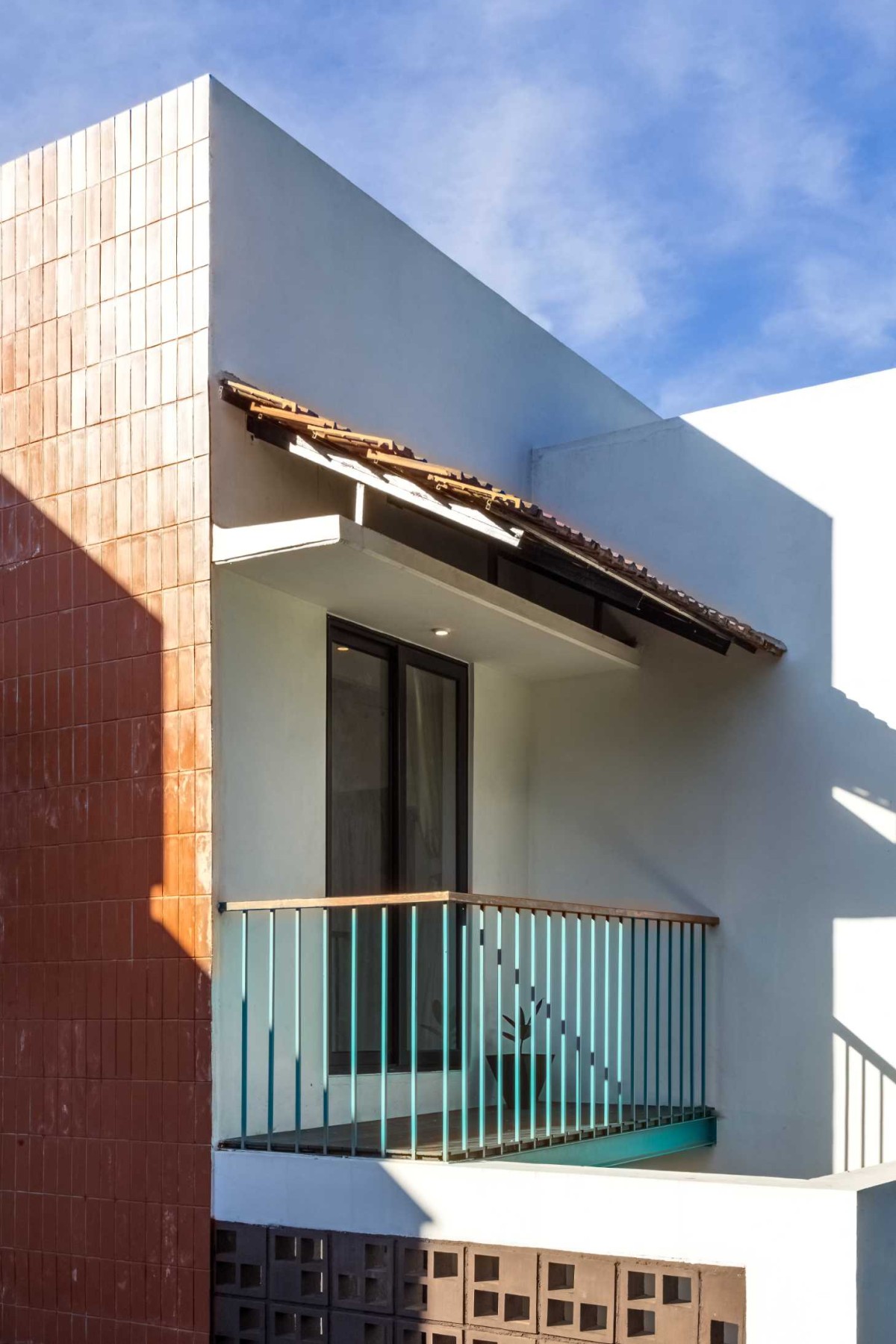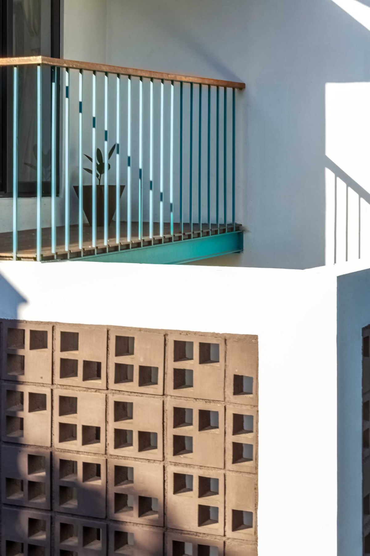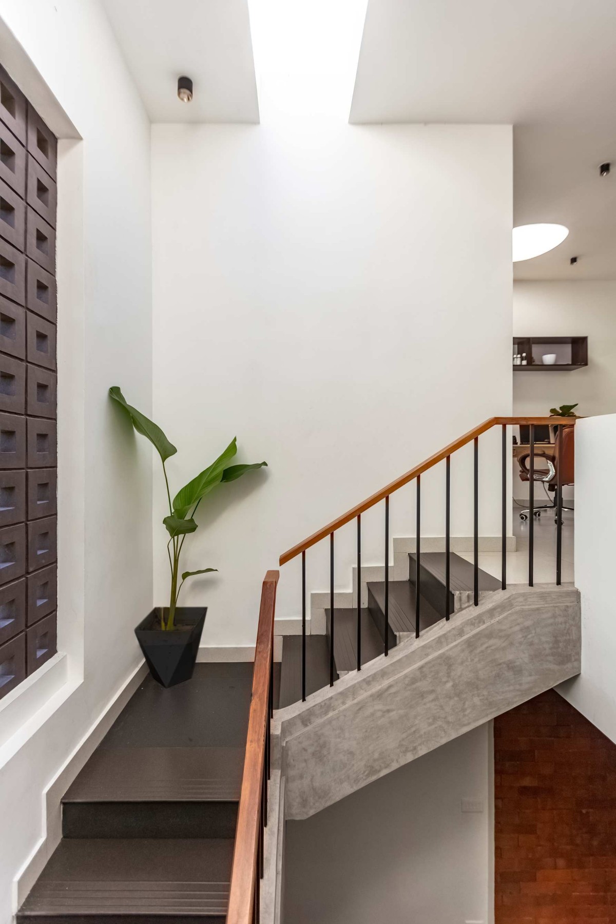 The interiors are spacious and efficient, polished to the point where one can't tell between the new and the old. The association of jaali walls and a waterbody inside the stair room complements the natural wind flow inside the dining room, as an exemplar of breathing architecture, and suffuse the room with soft daylight. The skylight positioned above the stairs enhance natural lighting in the interior and creates shadow plays throughout the day. The common balcony is positioned in favor of the rays of the setting sun and the windy west side of the house. The extended courtyard acts as a wind channel which is connected to the balcony, thereby serving it with a view, and acting as a vertical communication space.