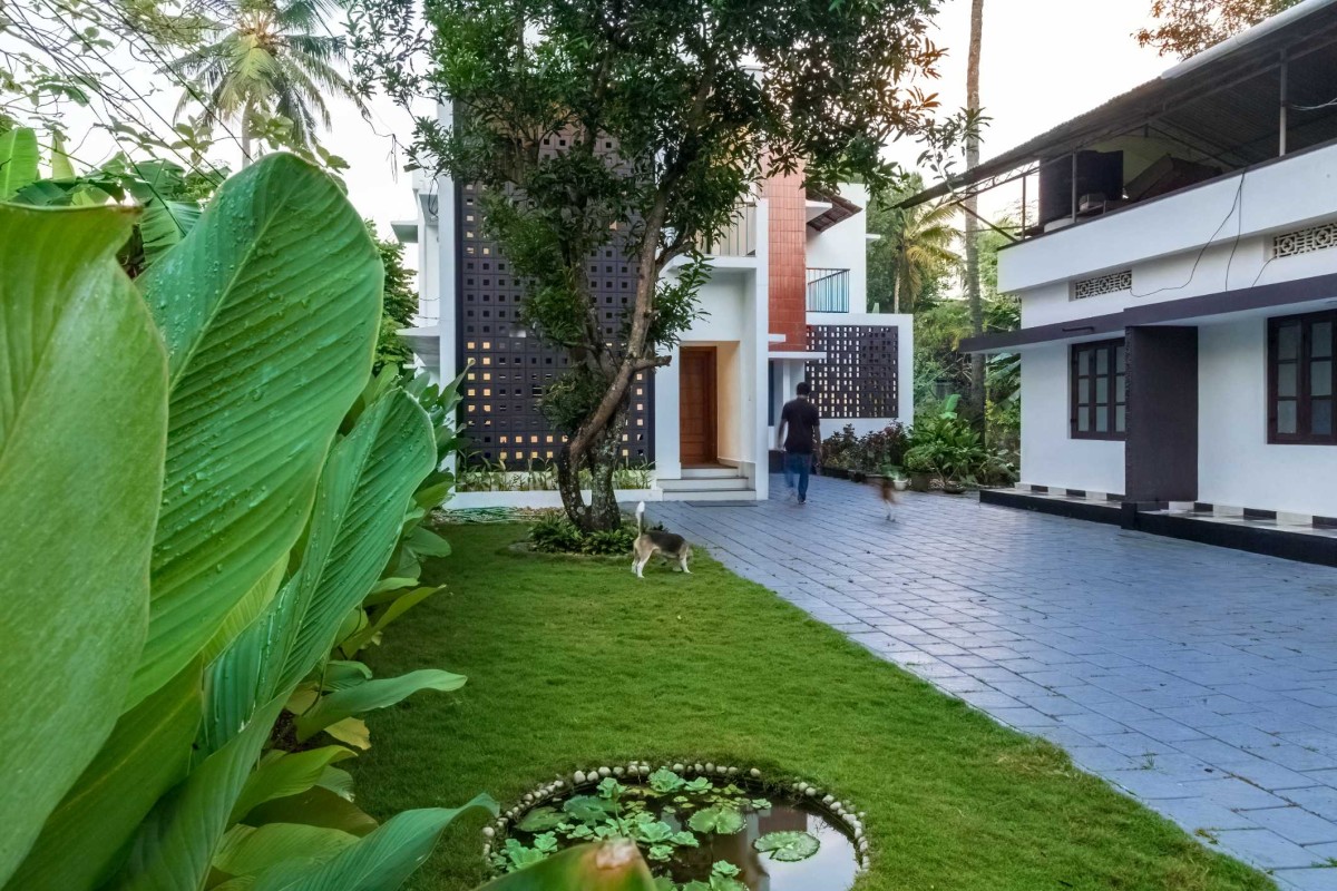 The project aimed in converting a comparatively congested 35-year-old two-bedroom house to a climatic responsive, four-bedroom residence with enabled functionality. The addition was a first floor with two spacious bedrooms and a stair room. The jaali wall that covers the two floors altogether serves as the main feature of the house, providing adequate privacy and an elegant light play in the interior during the morning daylight, and in the exterior during the night. It plays an all-in-all lead by filtering the views, breeze and light. With a horizontally terraced elevation, this house creates a mesmerizing scene that infuses a variety of surfaces. The masked balcony and verandah contribute to the character of the building, concurrently aiding to the privacy, without compromising its functionality.