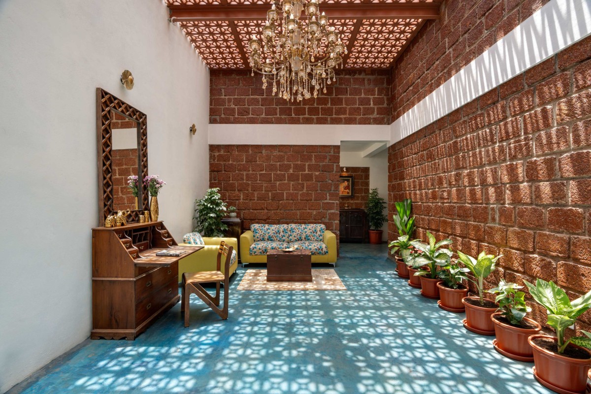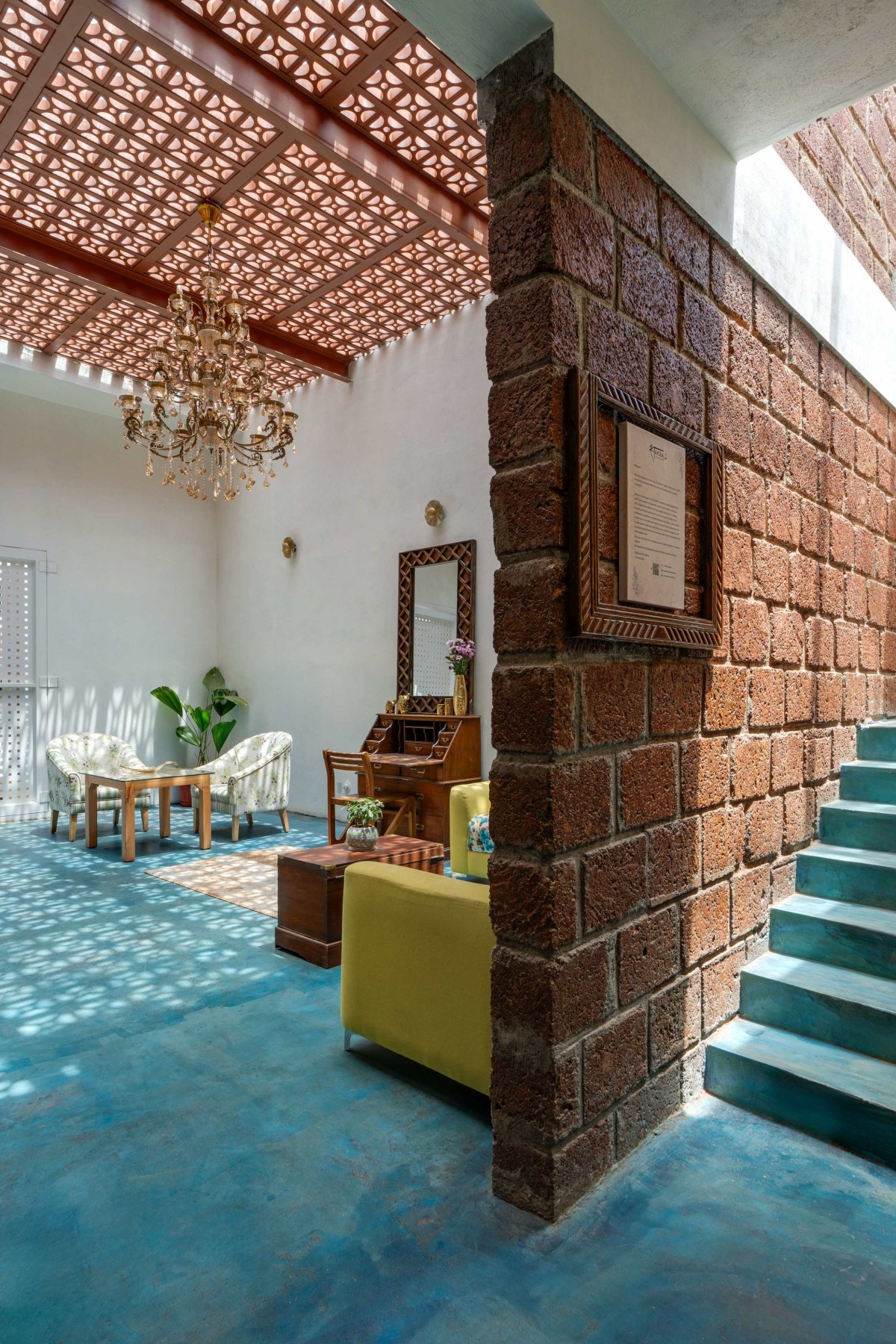 The construction process was equally meticulous. Locally sourced laterite, stone slabs, and brick masonry were assembled with precision, with stone beams and slabs cut and placed on site. The flooring, executed in Vacuum Dewatered Flooring (VDF), incorporates subtle blue and green pigments, creating a cool, composed surface that complements the material palette. Artworks collected from Chitra Santhe and curated antiques are interwoven throughout the interiors, enriching the spatial narrative and encouraging exploration.