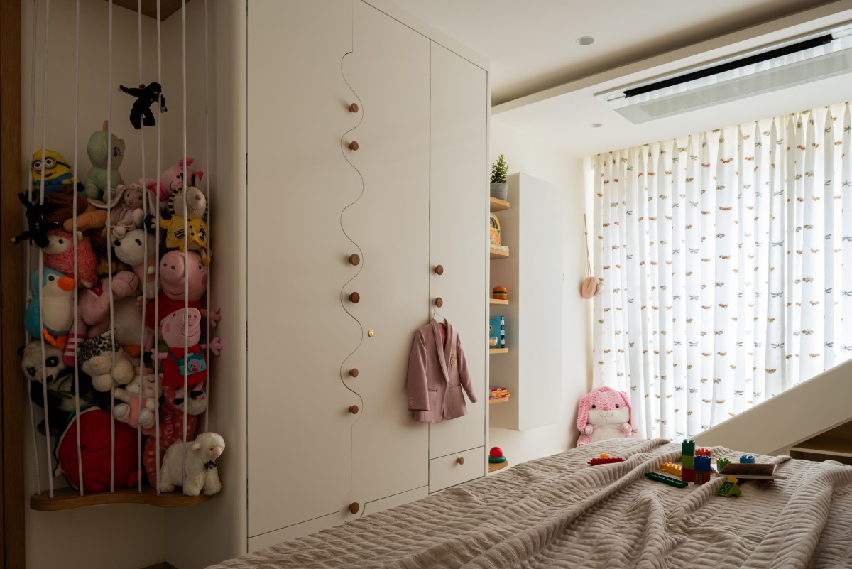 One of the standout features of Soléa is the dual-sided walk-in wardrobe designed for the master suite. Rather than opting for a traditional enclosed closet, they conceptualized a fluid transitional zone—a wardrobe that not only serves both the homeowners but also visually anchors the flow between the sleeping and dressing areas.