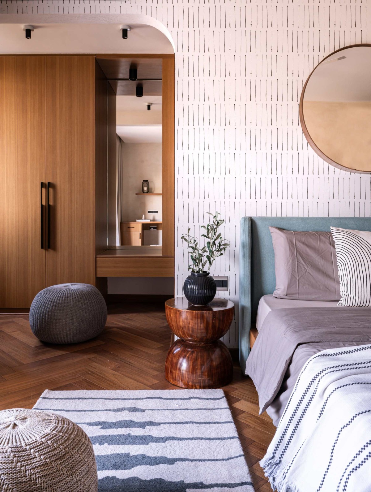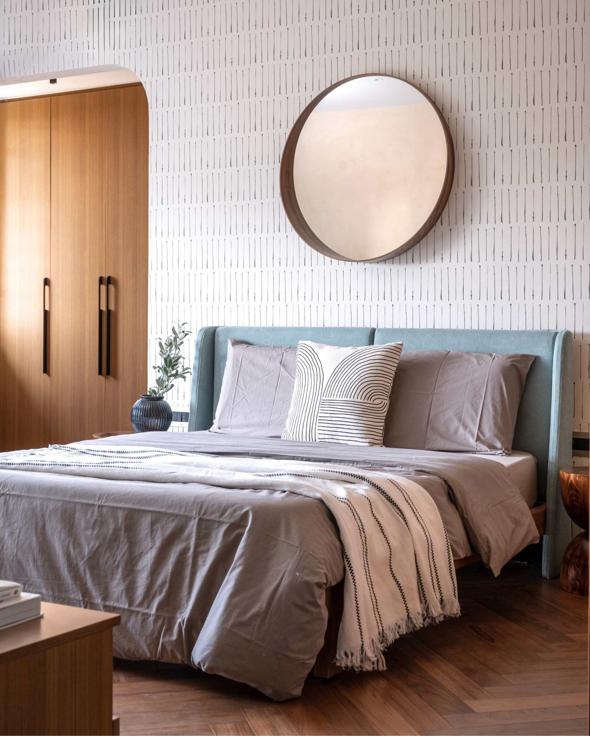 For now, this doubles as a guest/study, but with storage and finishes that can transition into a children’s room later. The herringbone flooring continues here, with a patterned wallpaper and soft blue accents.