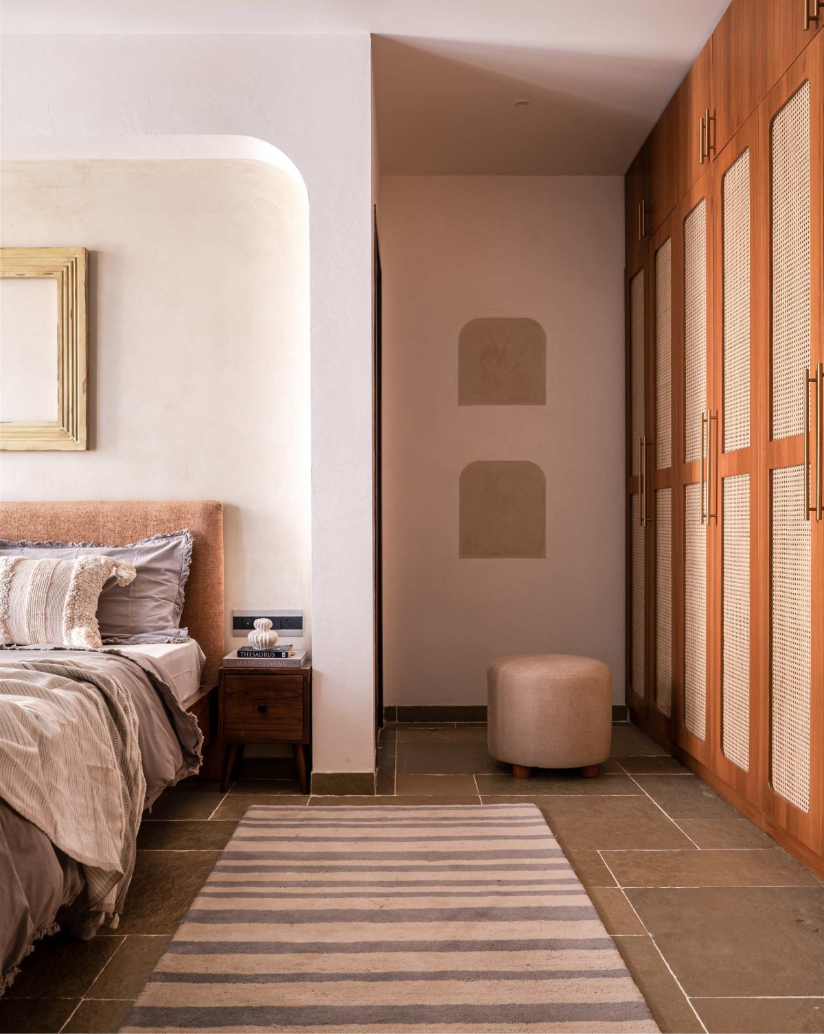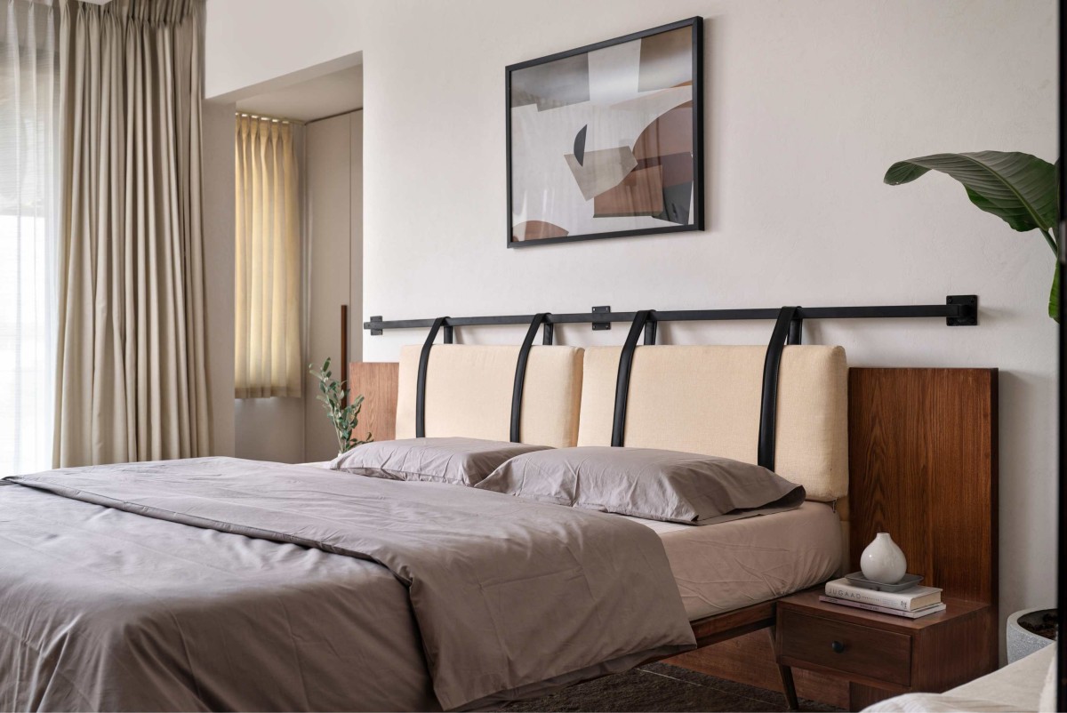 A minimal yet refined palette with a teak king bed, foam headboard supported by leather straps, and a simple geometric artwork to finish the look.