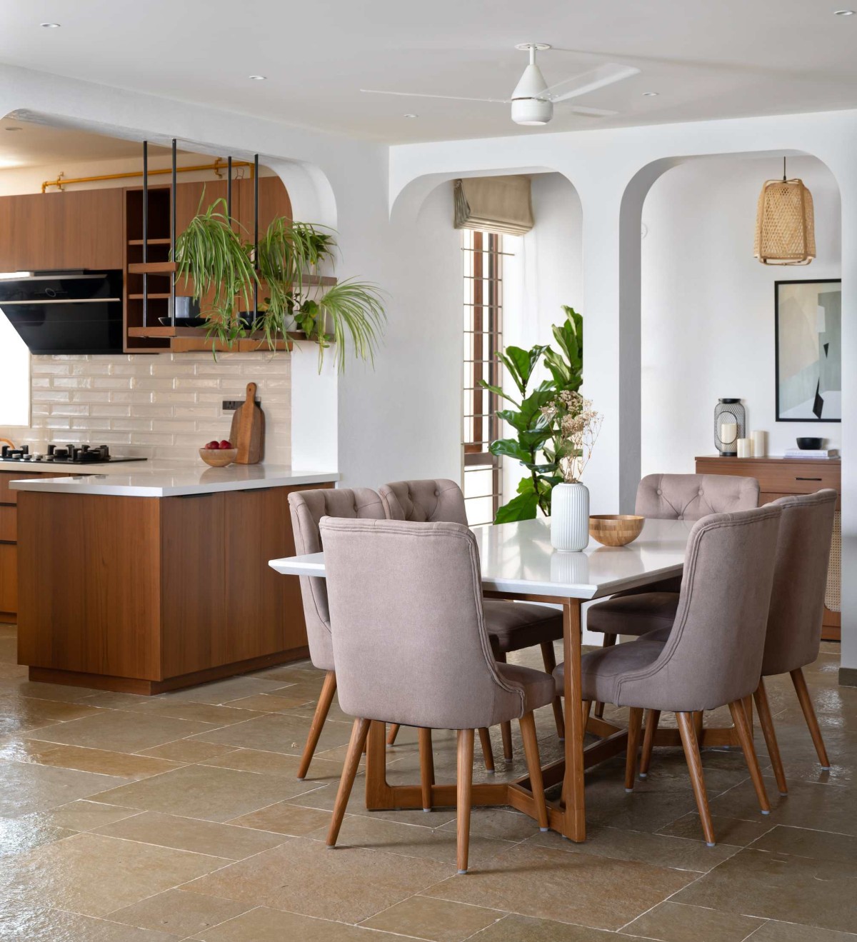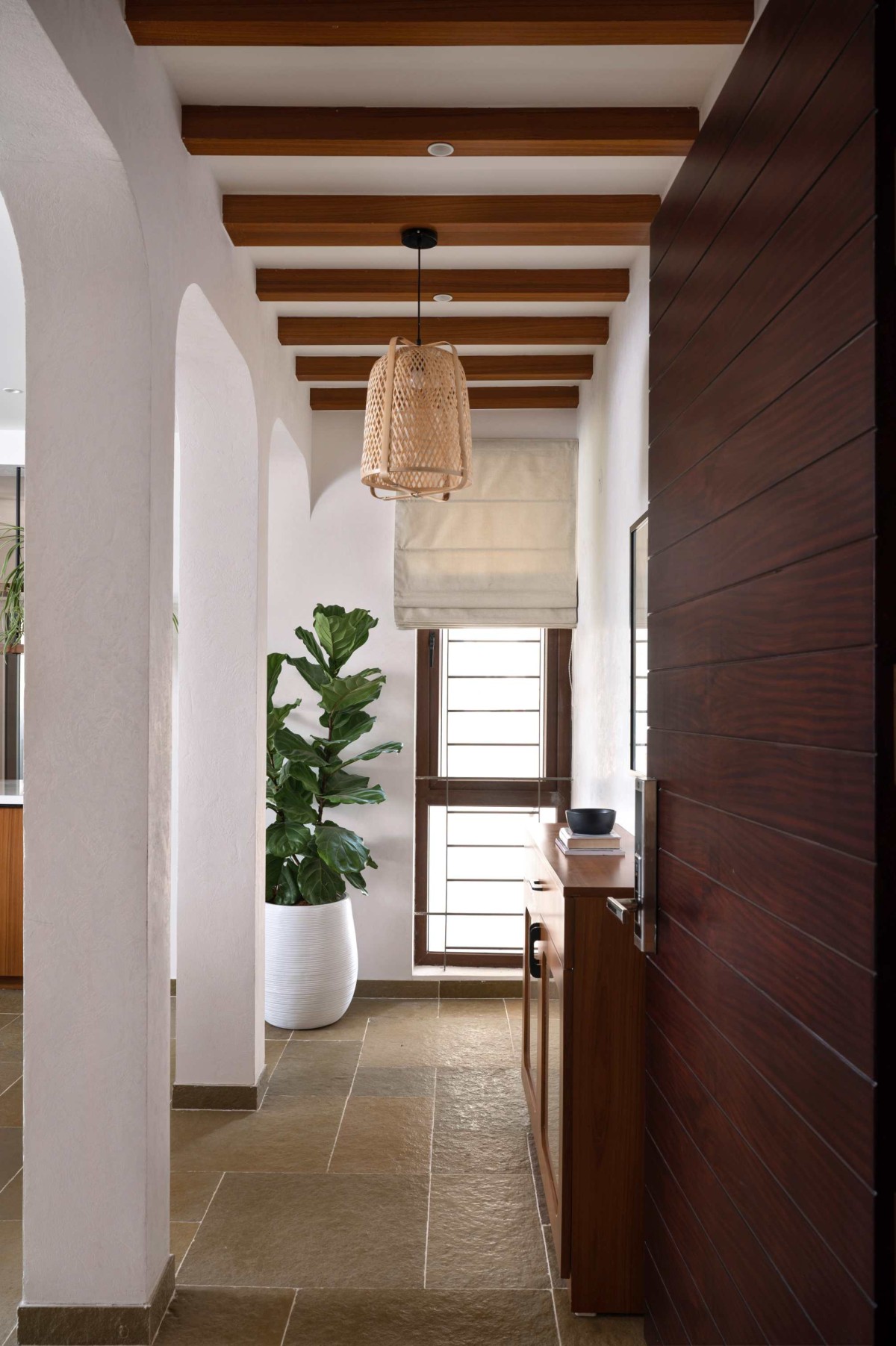 The existing plan didn’t have a foyer, so we created one by introducing three arches. This immediately defined an entry sequence and gave the home a sense of arrival. We kept the finishes simple with kota flooring, a custom rattan console, and a cane pendant to set the tone.