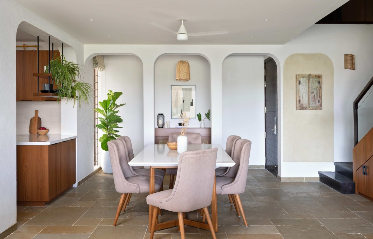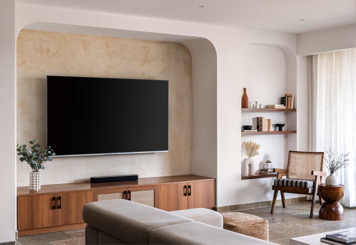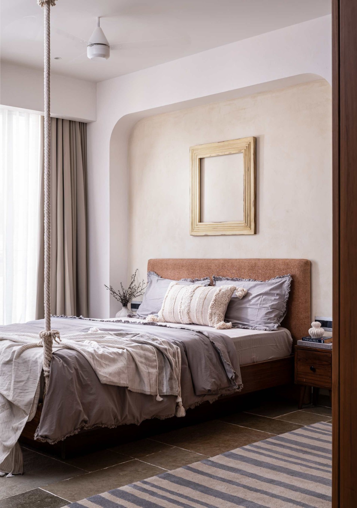 Two aspects drove our design approach. The first was the sunset view from the living room, which gave us our palette of mauves, saffrons, and neutrals. The second was the clients’ connection to their earlier family home in Nagpur. They spoke fondly of its swing, garden, and earthy finishes, and we tried to bring that sense of memory into this new setting through the materials and details