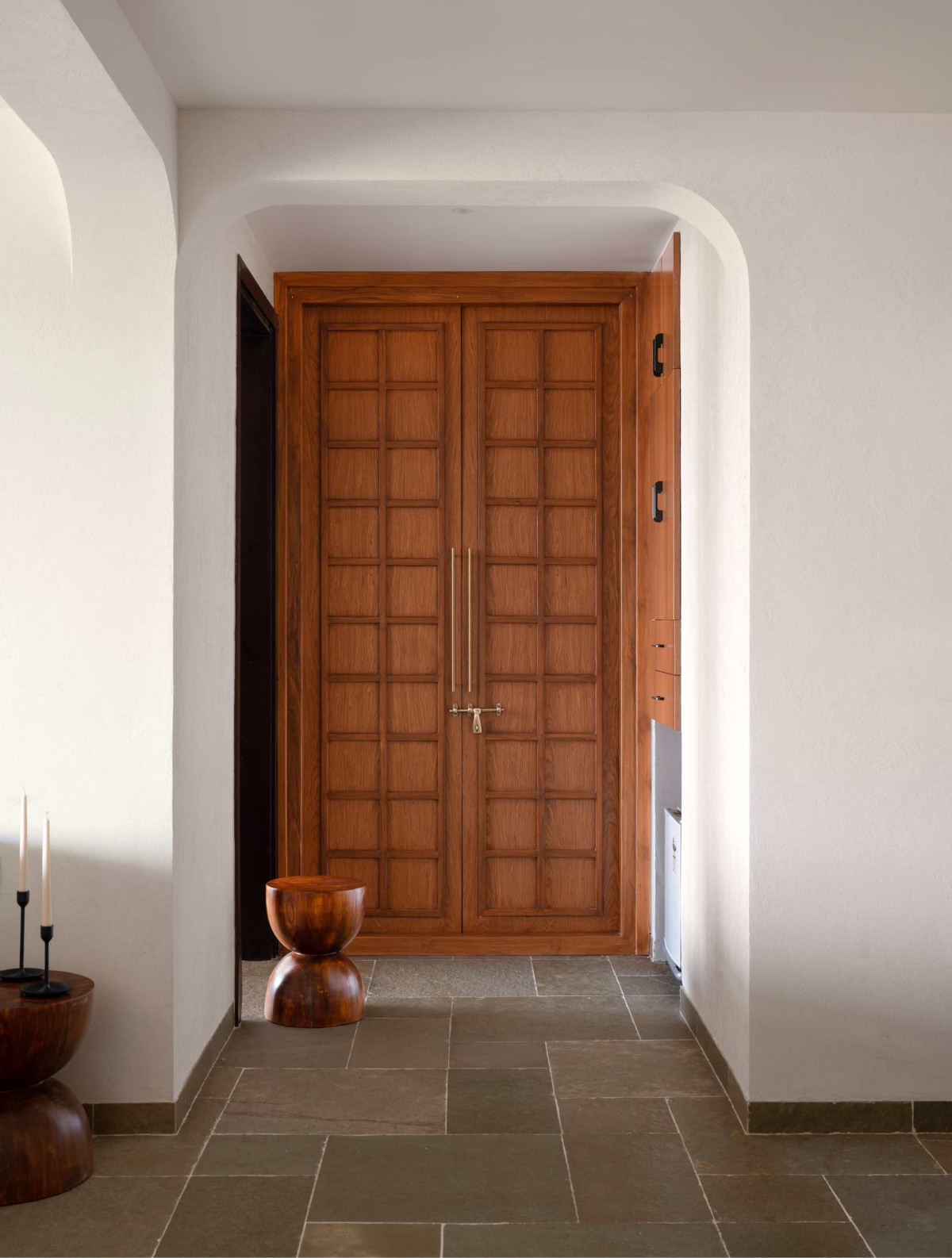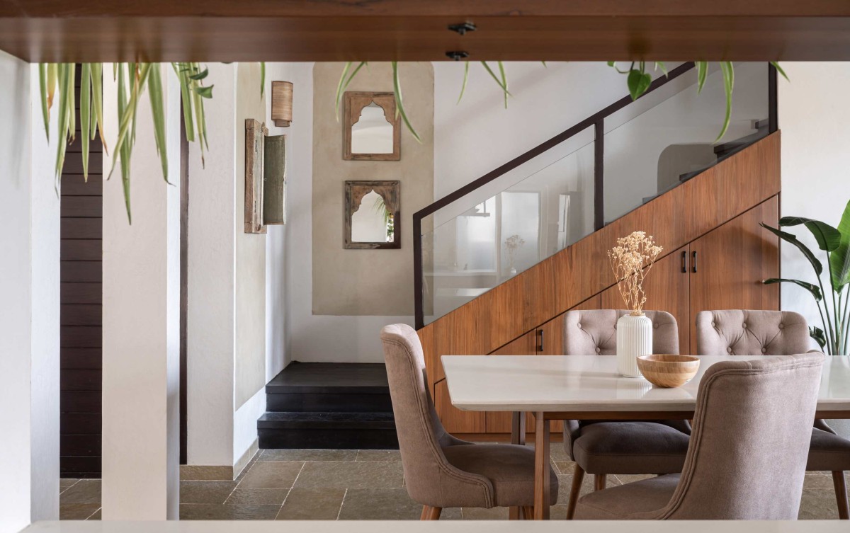 The stairway was finished in venetian plaster in a sandstone tone. To break the monotony, we added mirrors and an openable window frame sourced via Bangalore Hunts, which provide subtle detail. The powder bathroom was tucked neatly under the landing.