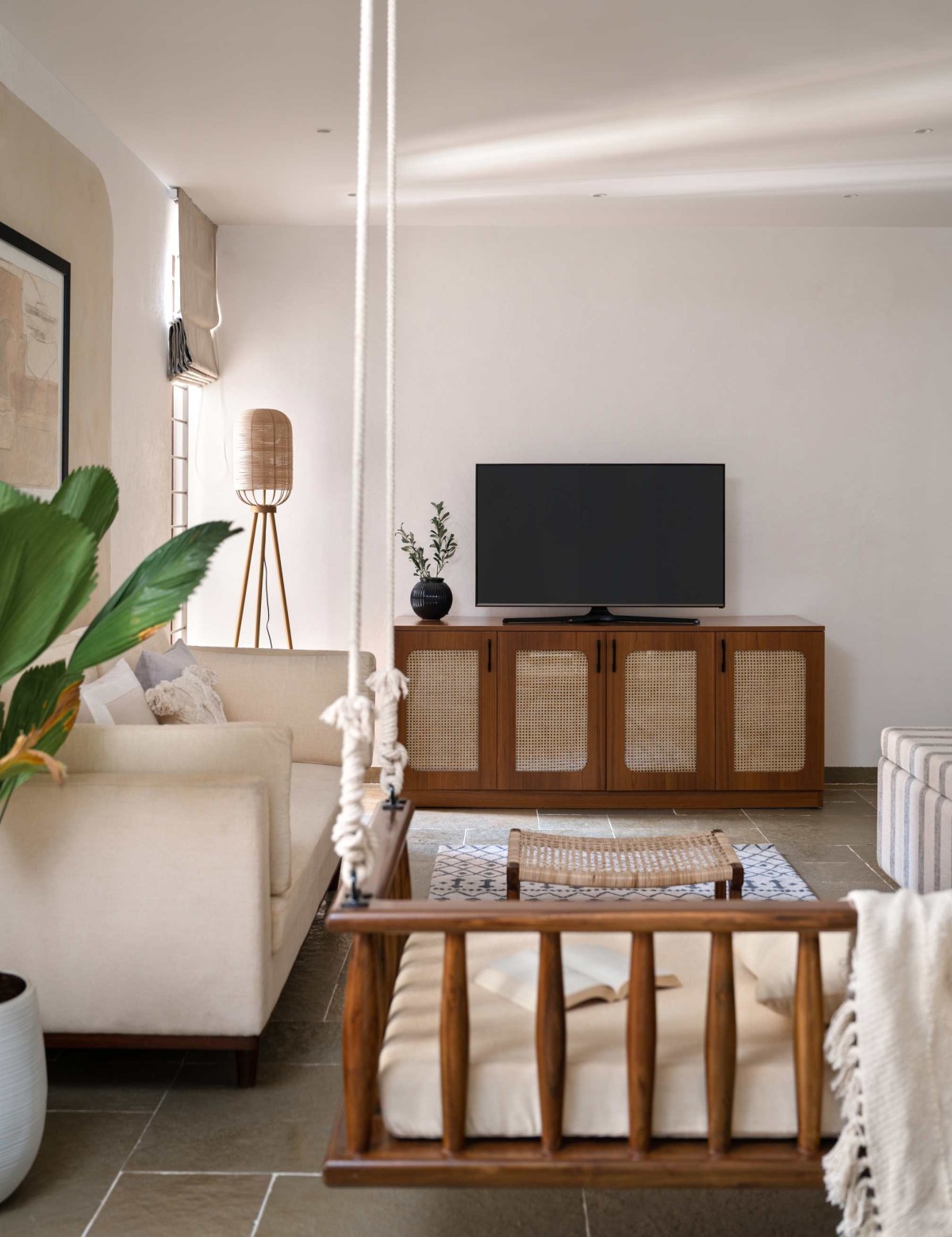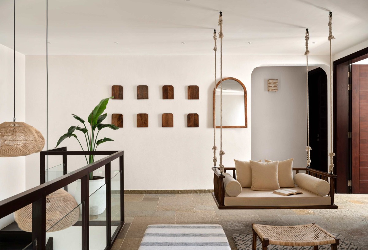 Upstairs, we designed the family lounge as an informal, intimate space. The highlight here is a solid teak swing — an intentional nod to the client’s childhood memories of their Nagpur home. To complement it, we added a fabric sofa and a rattan-panelled TV cabinet. We placed mirrors in reclaimed window frames along the wall, which not only add rustic charm but also bounce natural light around the double-height volume.