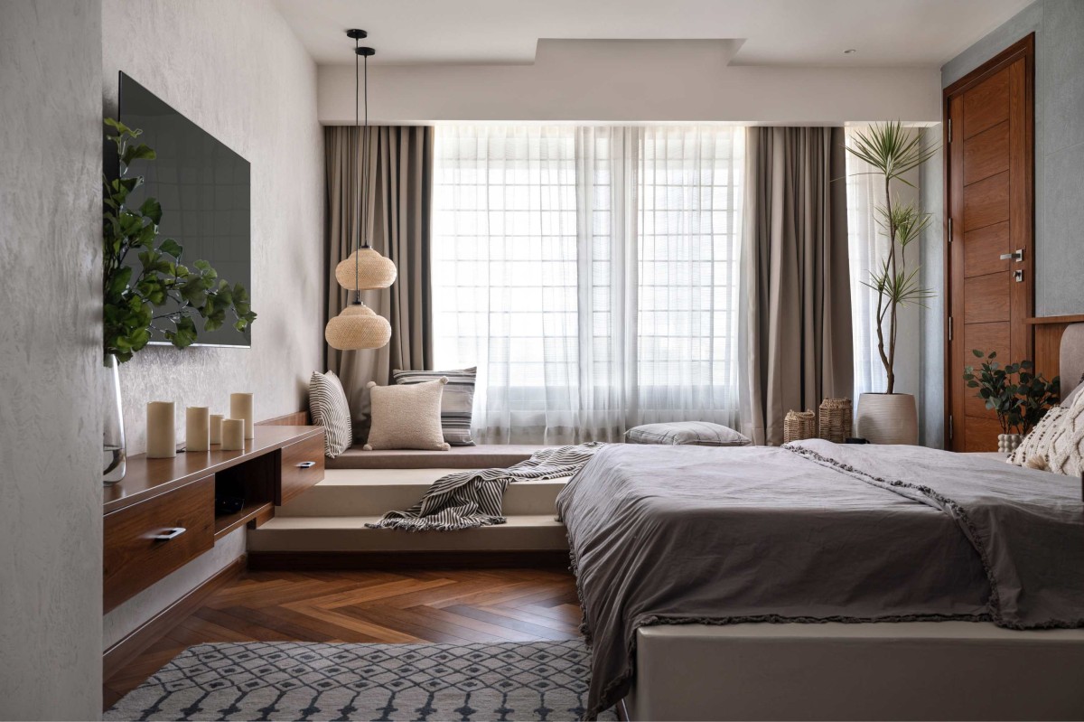 We wanted this to feel like a retreat. Instead of a conventional layout, we created a large L-shaped concrete platform finished in microcement, so the bed flows seamlessly into the seating. Teak flooring laid in herringbone adds warmth, and we opened a door to connect directly to the balcony.