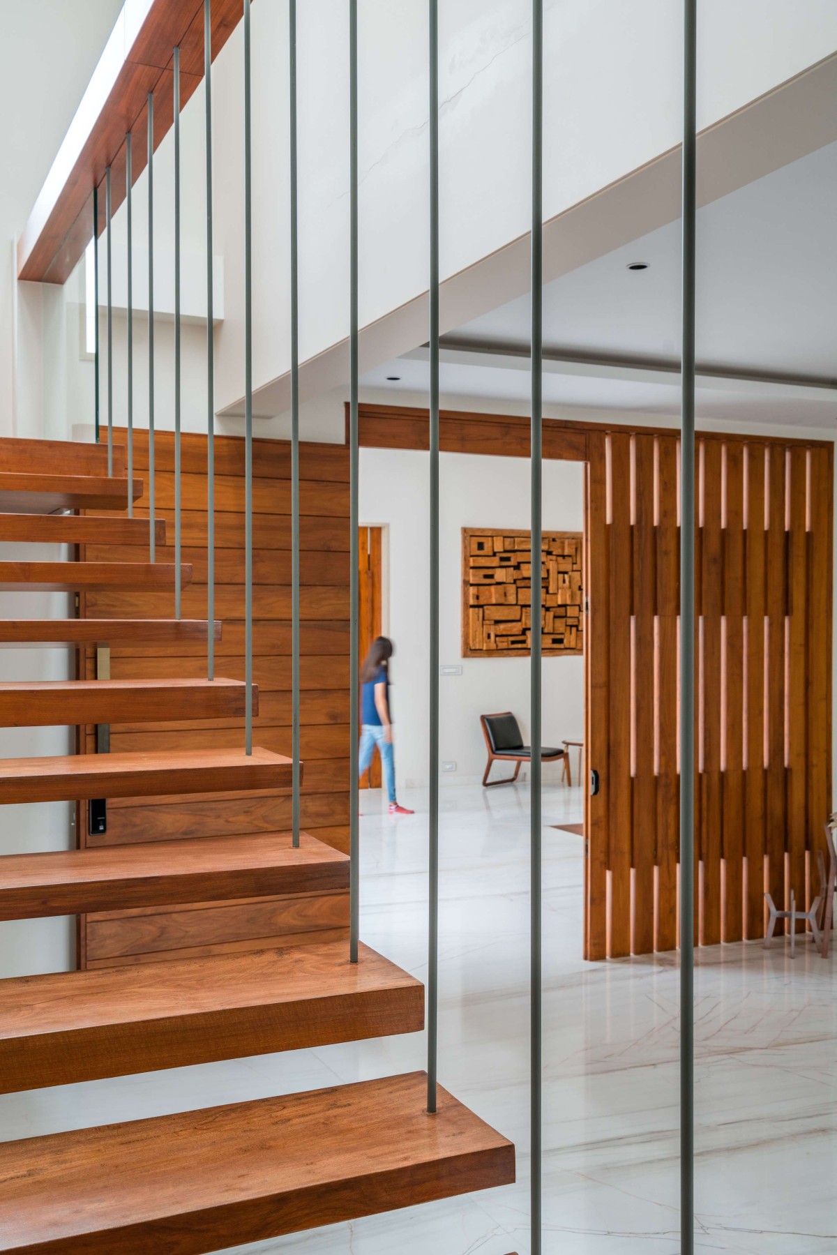 Outside the office space, a high elevated wall with hanging to improve the look and feel of the space for both residents and visitors. This area is distinguished by the suspended flight of stairs which is completed in wood to complement the interior language. The stairwell leads to an area with an open layout that allows for easy circulation and visual fluidity. The entry is distinguished by a tiny flight of steps backed by plants, giving it a contemporary yet inviting feel.