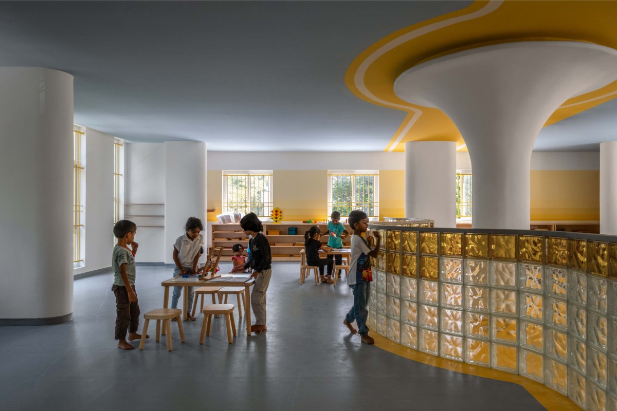from the column, the wall creates a playful loop, allowing children to run