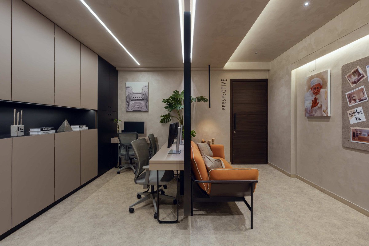 The heart of the office is the Design Strategy Cabin, a space that defies conventional hierarchical office planning by housing all three partners together in one collaborative environment. Rather than separate offices that might create barriers to communication and collaborative thinking, this cabin features three partner workstations arranged around a central conference table. This table is crowned with the same carefully selected Italian marble that appears at the entrance and on the waiting area side table—bringing the material full circle through the office journey. This marble was chosen specifically because it contains the entire color spectrum of the office within its natural veining: from the palest cream to the richest desert beige, with all the subtle variations in between. It serves as both the aesthetic foundation and the unifying element that ties every space together.
