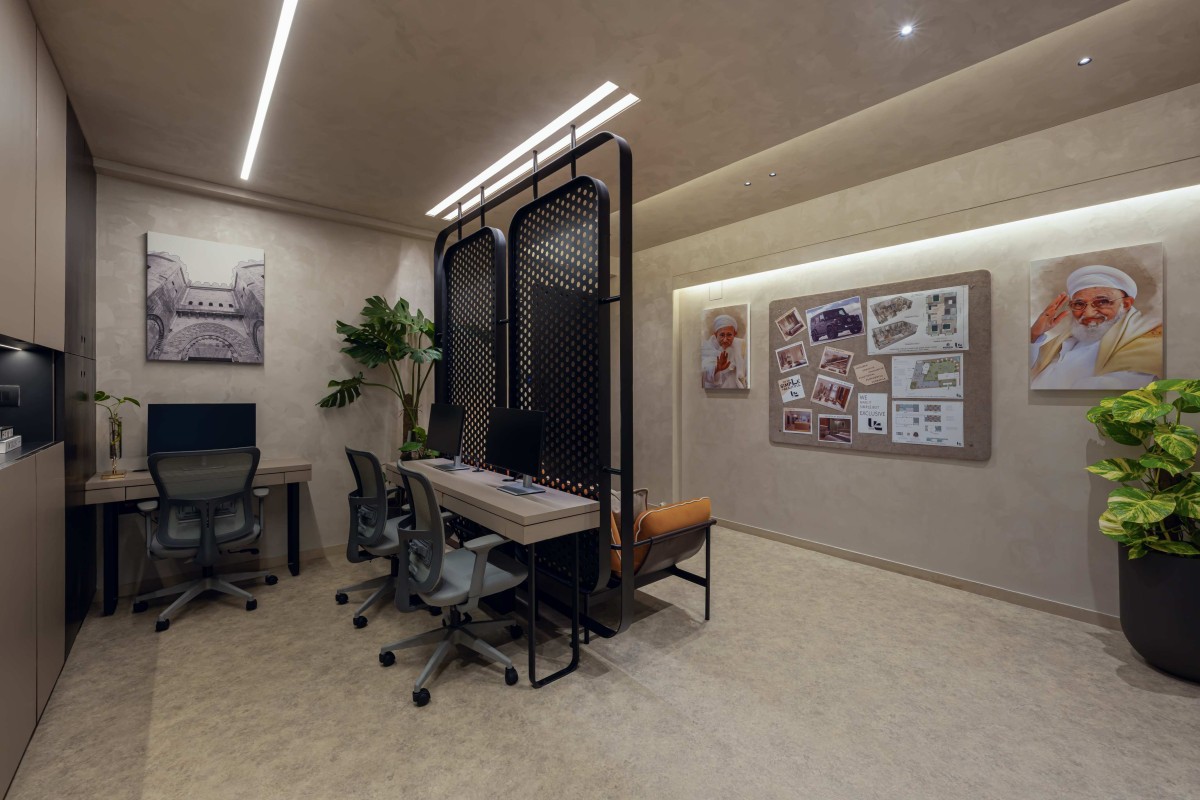 The wall opposite the waiting sofa presents a carefully curated gallery that balances heritage with contemporary practice. Two framed photographs of His Holiness provide spiritual grounding and cultural connection, offering visitors a sense of peace and positivity upon arrival. These images represent the firm’s roots and values, acknowledging the importance of heritage in shaping design philosophy. Between these photographs, a bulletin board in natural jute color—perfectly harmonizing with the desert-toned walls—displays current projects. This is not merely decoration; it’s an interactive element that transforms waiting time into an engaging experience. Detailed drawings with descriptions allow visitors to immerse themselves in Urban Crescent’s work, understanding the firm’s approach and attention to detail while they wait.