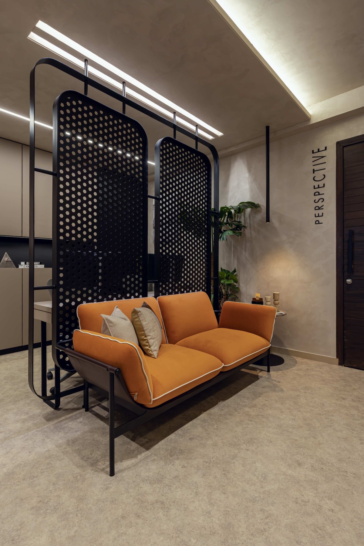 Throughout the office, fabrication appears as a recurring material signature—in the entrance nameplate, the honeycomb partition, the sofa legs, the side table column, the freestanding shelf—each application demonstrating different possibilities of metalwork while maintaining visual consistency through the matte black finish. Similarly, the Italian marble appears in multiple contexts—vertical column, horizontal tabletops, accent elements—showcasing how natural materials can be applied in varied ways while maintaining coherent design language. This repetition isn’t monotonous; instead, it creates a sense of intentional design thinking where materials are carefully selected and then explored through multiple applications, demonstrating depth of consideration and commitment to a unified vision.