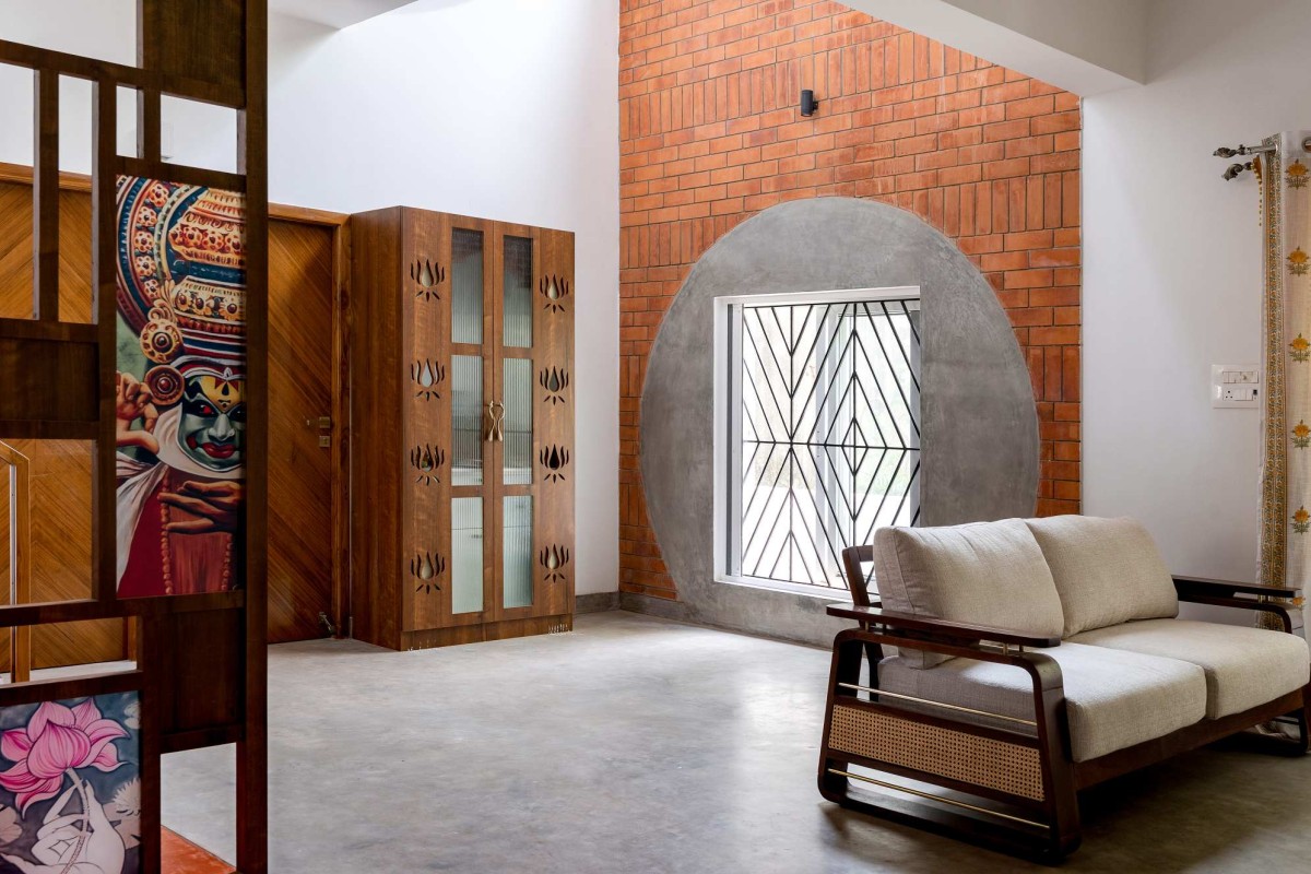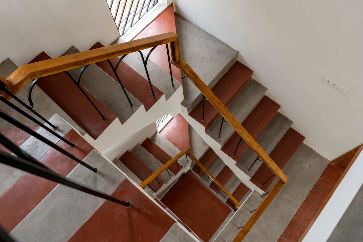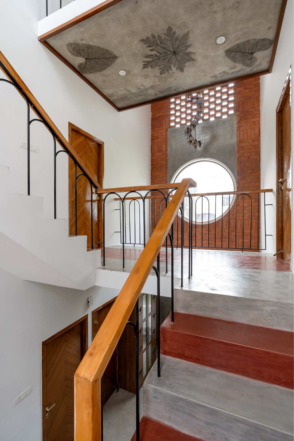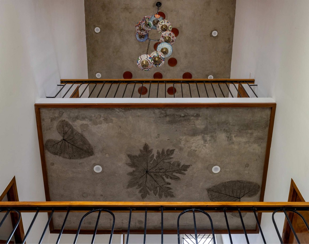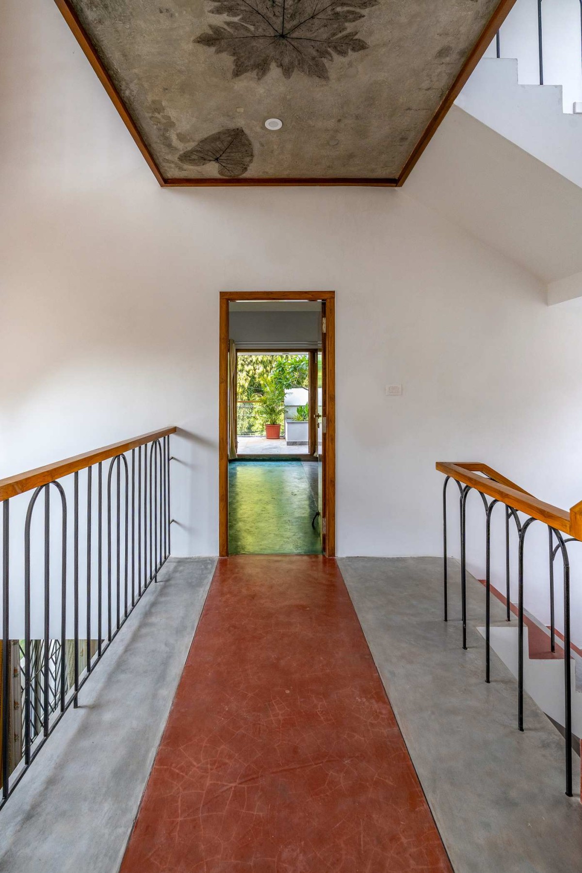 Material choices emphasize handcrafted tradition and thermal responsiveness. Floors are finished in red, green, and grey oxide; exposed concrete walls and pot filler slabs on the roof enhance thermal comfort while reducing energy loads. A distinct design element is the use of leaf imprints on the staircase landing and ceilings—capturing traces of the trees that once grew on-site, and transforming surfaces into tactile stories. Together, these material decisions root the project in vernacular sensibility while delivering spatial freshness.