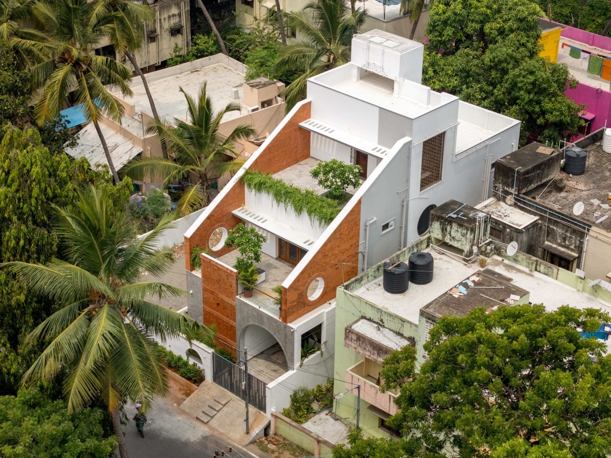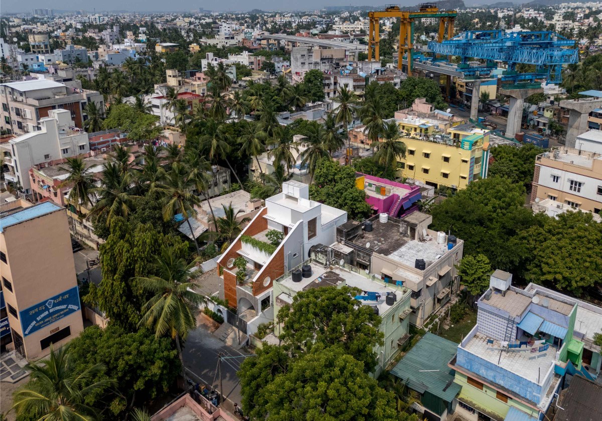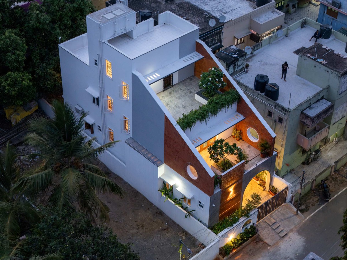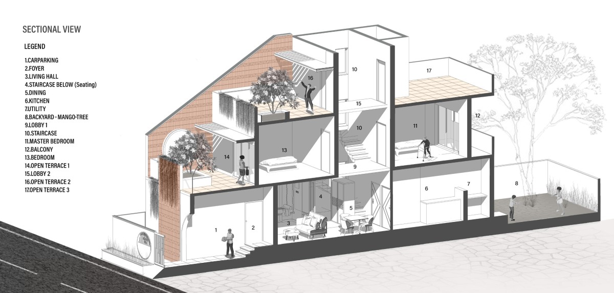 The home is organized around a triple-height volume along the northern edge—bringing in daylight, facilitating visual connections, and becoming the vertical spine of interaction. The east-facing frontage allows soft morning light to flood the interiors. Stepped terraces at the front form playful, interconnected outdoor volumes—spaces where the grandmother can sit and observe, while grandchildren play and explore above. These terraces become platforms for familial connection, story-sharing, and rootedness.