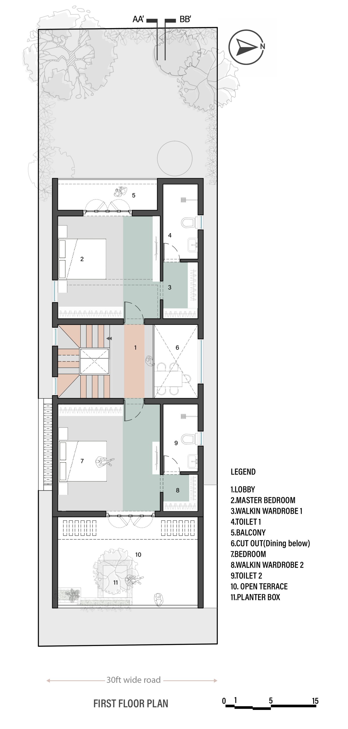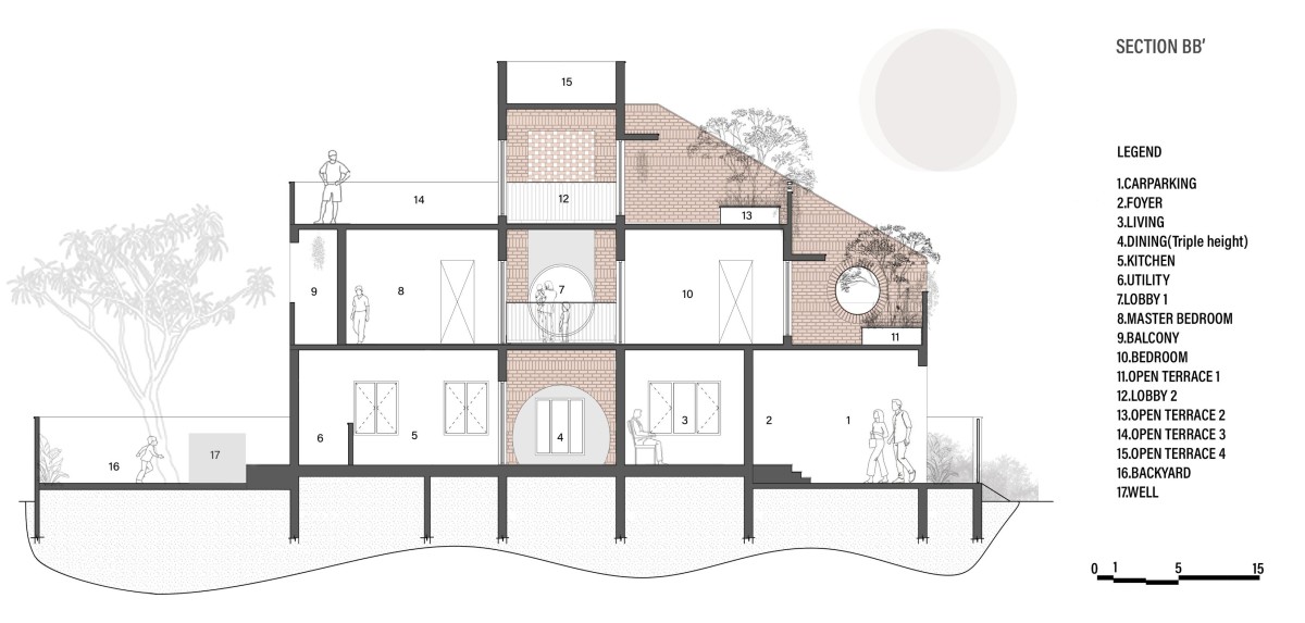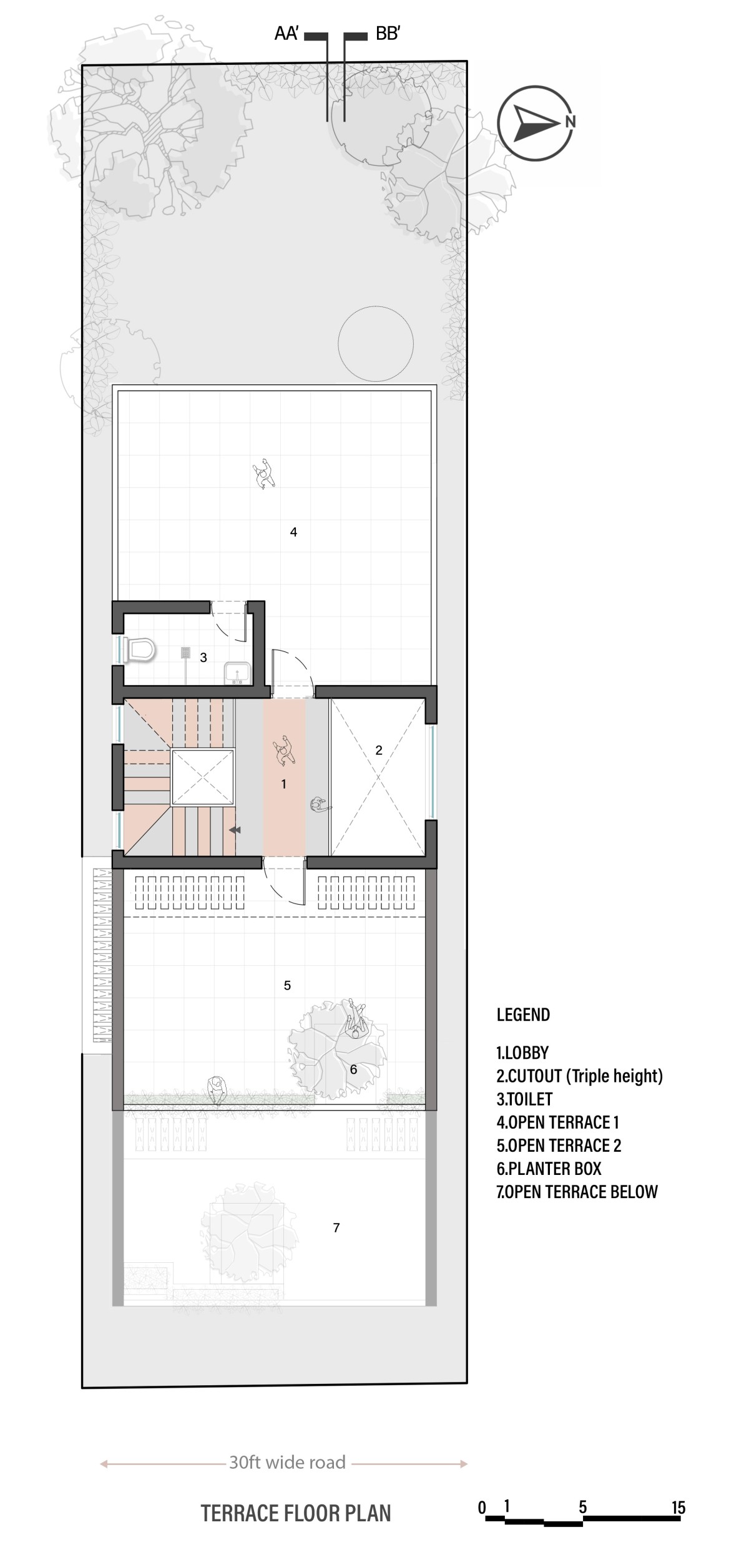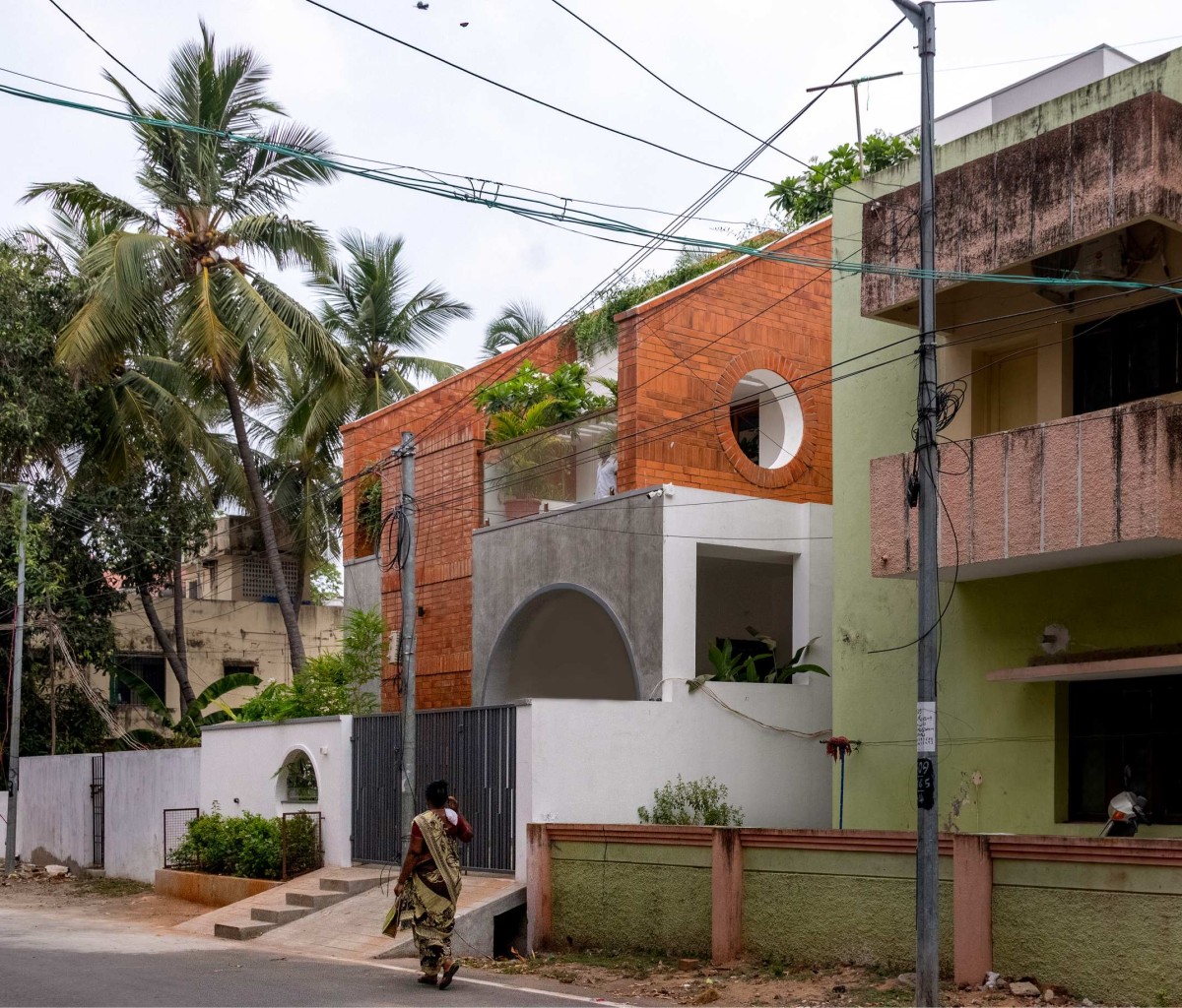 The home is organized around a triple-height volume along the northern edge—bringing in daylight, facilitating visual connections, and becoming the vertical spine of interaction. The east-facing frontage allows soft morning light to flood the interiors. Stepped terraces at the front form playful, interconnected outdoor volumes—spaces where the grandmother can sit and observe, while grandchildren play and explore above. These terraces become platforms for familial connection, story-sharing, and rootedness.