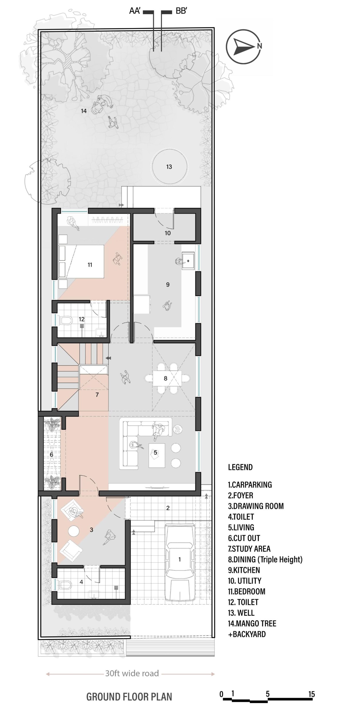 The rear of the house preserves the site’s original mango trees and ancestral well—both consciously retained as cultural and spatial anchors. The backyard now doubles as a shaded play space and garden, allowing the grandchildren to connect with nature and family history. The well, once integral to daily life, has been restored as a symbolic and living memory—a quiet homage to generational legacy.