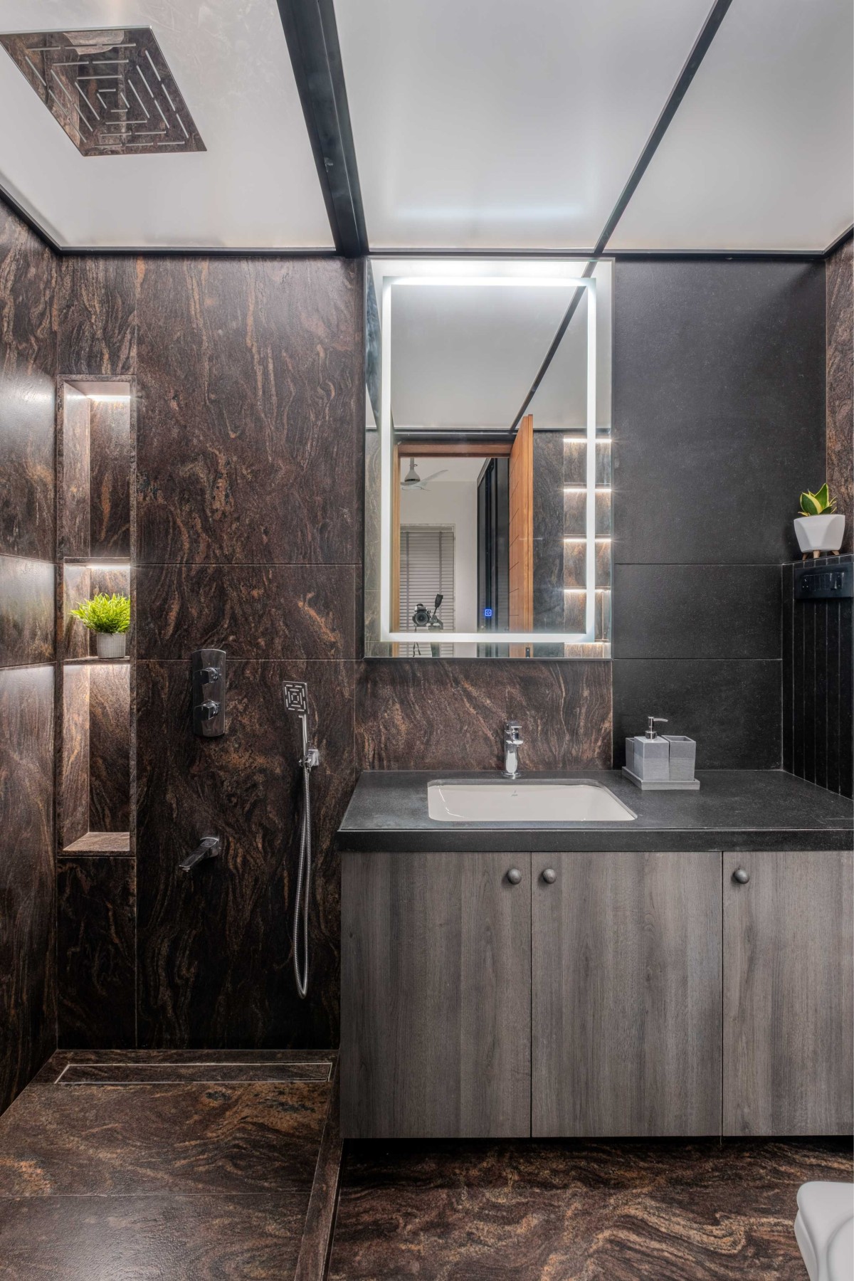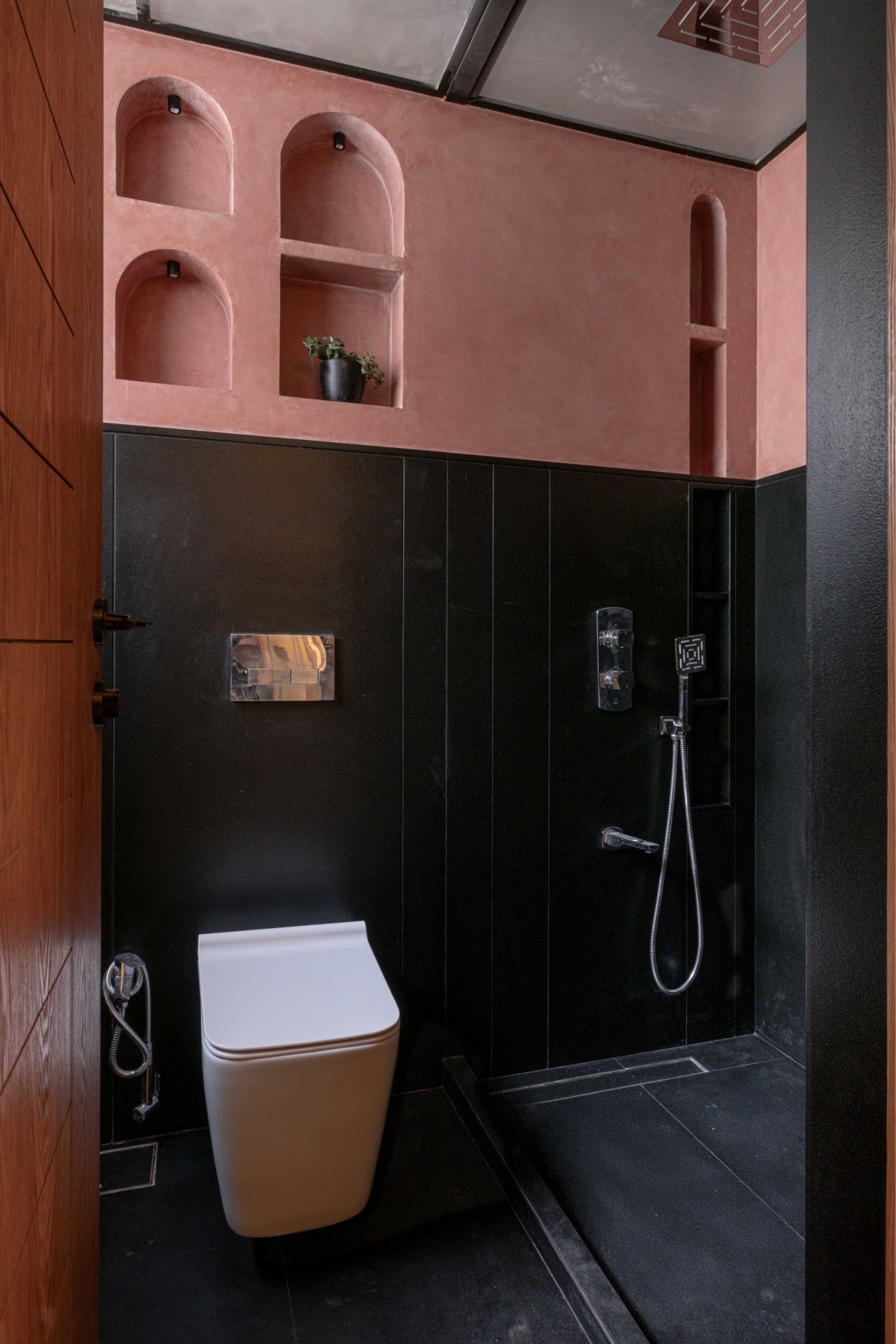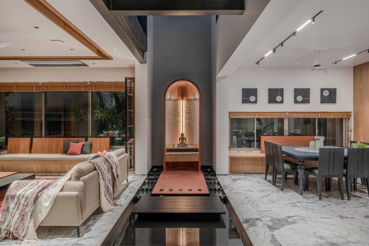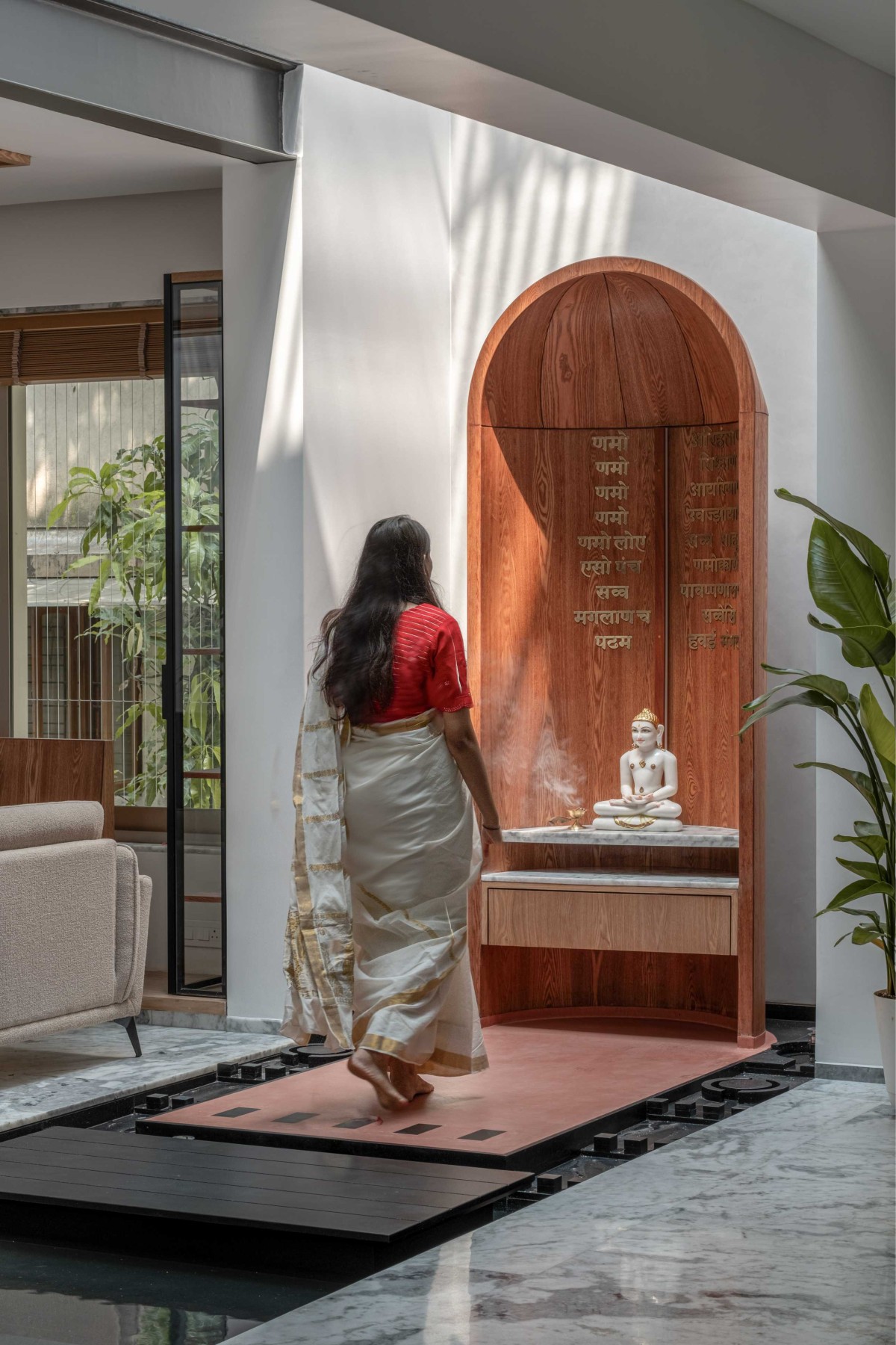 The home opens into a lobby that leads directly to a sunlit L-shaped courtyard, its edge defined in black granite. Beyond it, the living room unfolds in a column-free expanse — made possible by a composite structural system of mild steel sections. A swing — almost punctuating the space — is accompanied by Umbrella Trees and Peace Lily plants, while a standing window from the floor above looks down into the courtyard, extending the connection vertically. To the east is a minimal puja space across a waterbody, where the family’s Tirthankar idol stands within a wood-lined enclosure. The holy Navkar Mantra is etched on the backdrop, while grey micro concrete walls and rust orange floor inserts complete the sense of sanctity.
