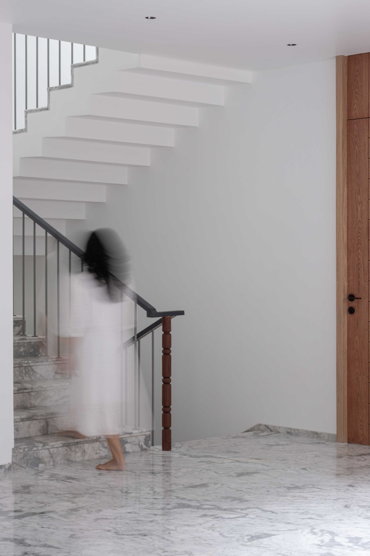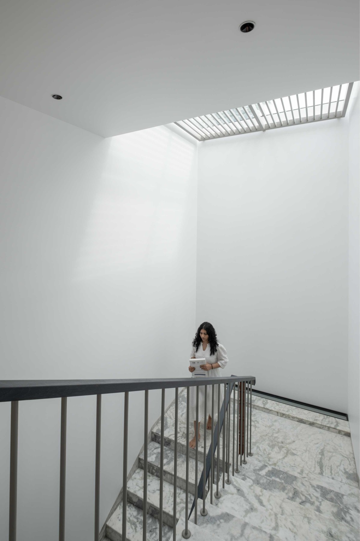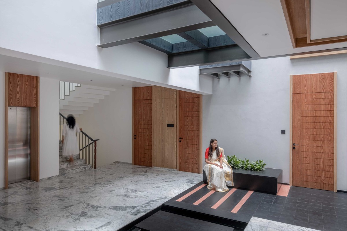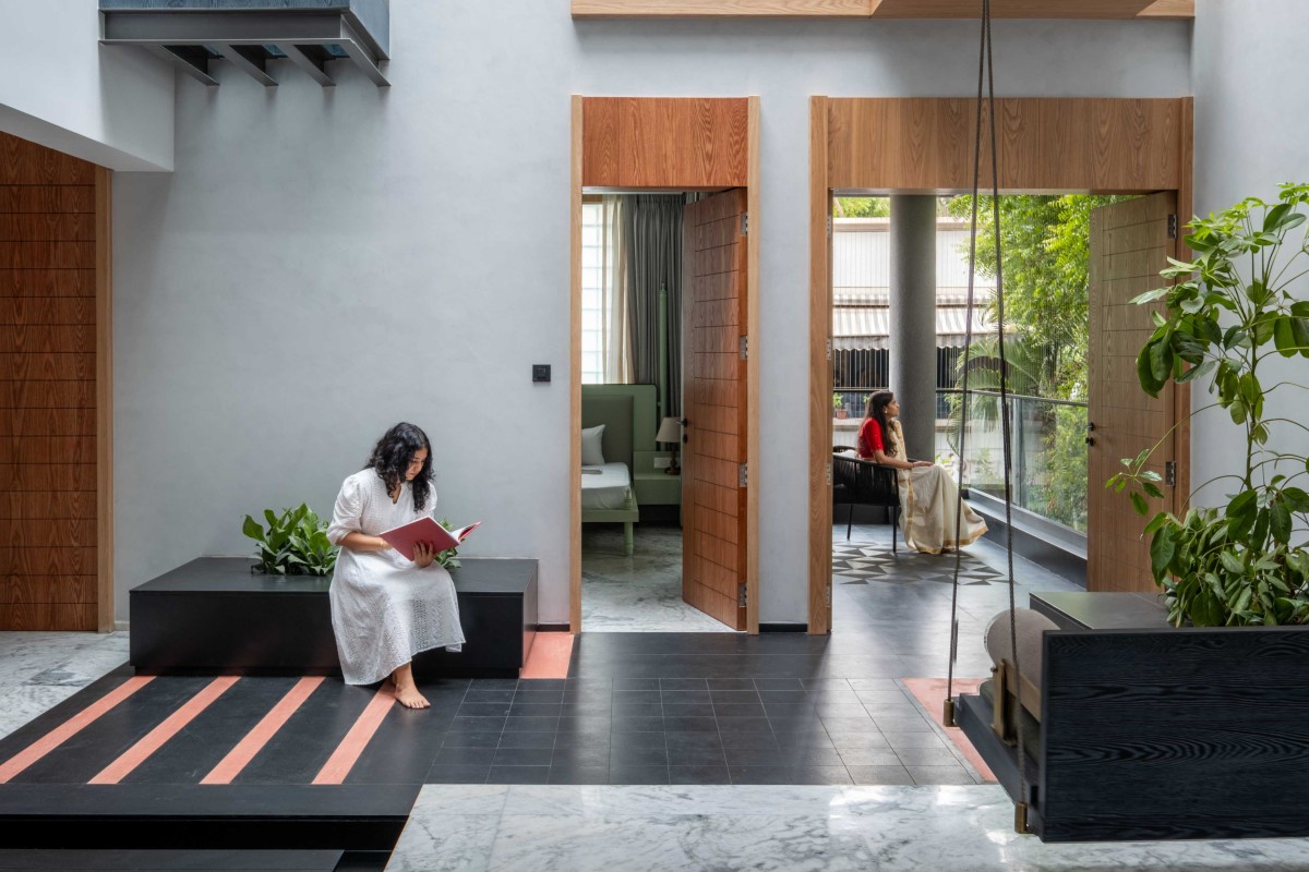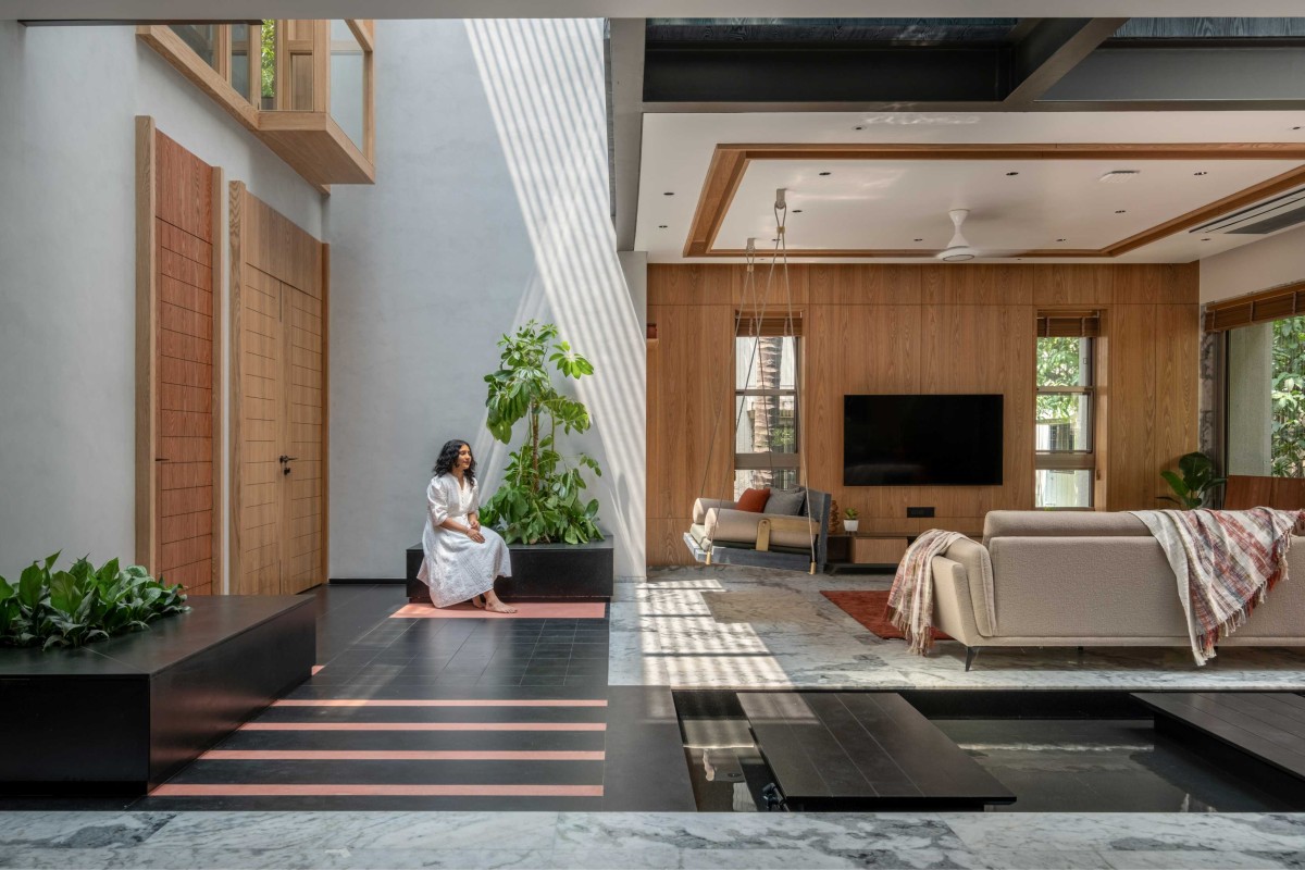 Just above the living room sits a large multipurpose room; it connects across the double-height volume to the son’s bedroom on one side and opens out to a generous terrace on the other, while the daughter’s bedroom lies right opposite.