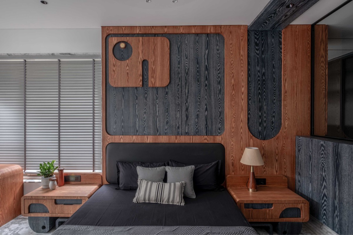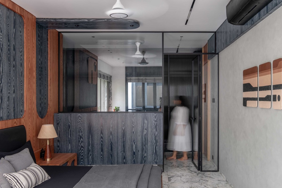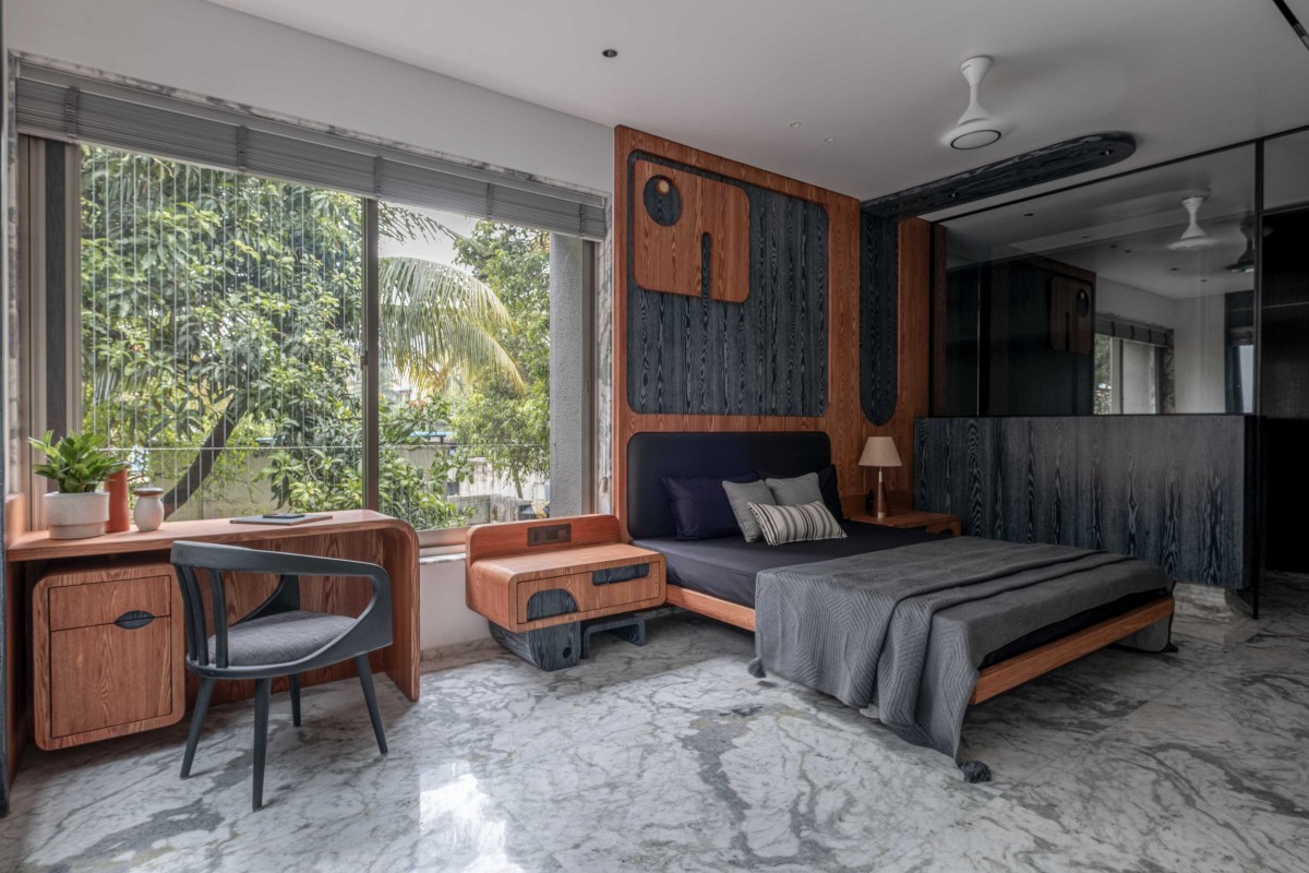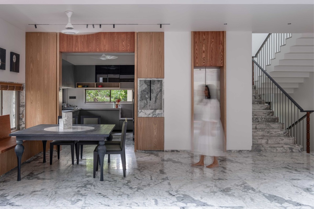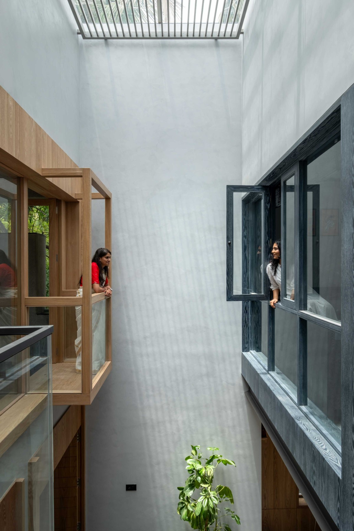 Just above the living room sits a large multipurpose room; it connects across the double-height volume to the son’s bedroom on one side and opens out to a generous terrace on the other, while the daughter’s bedroom lies right opposite.