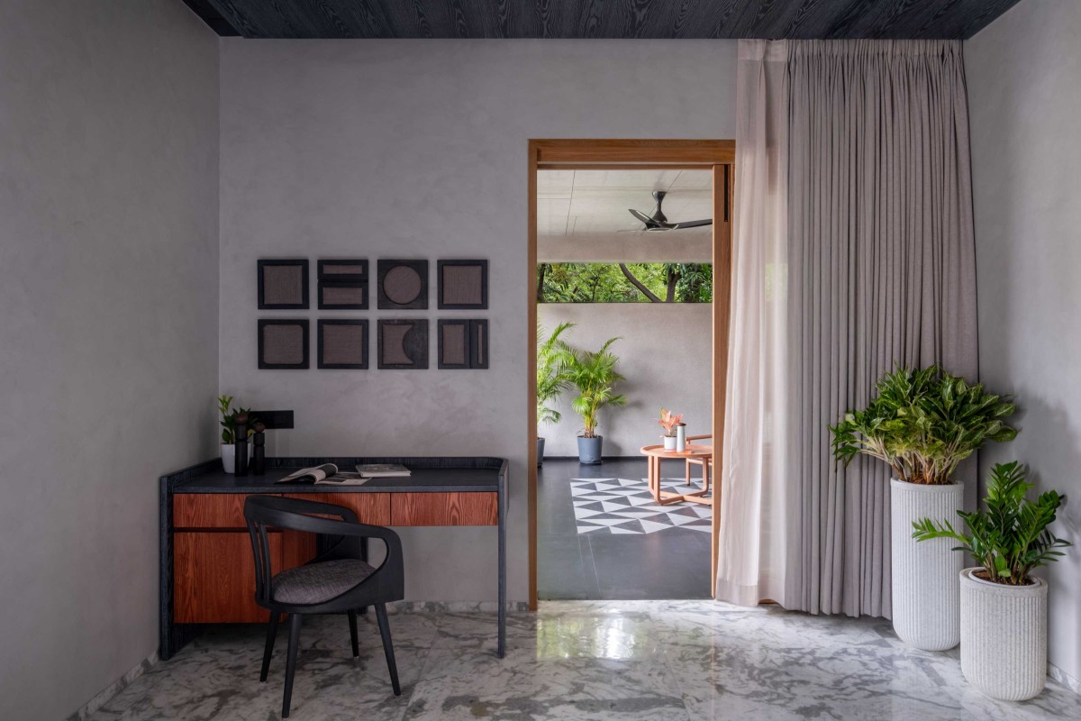 From the facade inward, the pared-back palette of beige and grey sets the tone for the shifting volumes within. Inside, the courtyards offer a stage for natural light to filter through the day, casting patterns and shadows that animate the interiors. “One of the first ideas was to place courtyards to the north and east — not just for light and ventilation, but to bring a sense of openness, lightness, and calm. The courtyard, in fact, inspired the name Swar,” says Jinesh.
