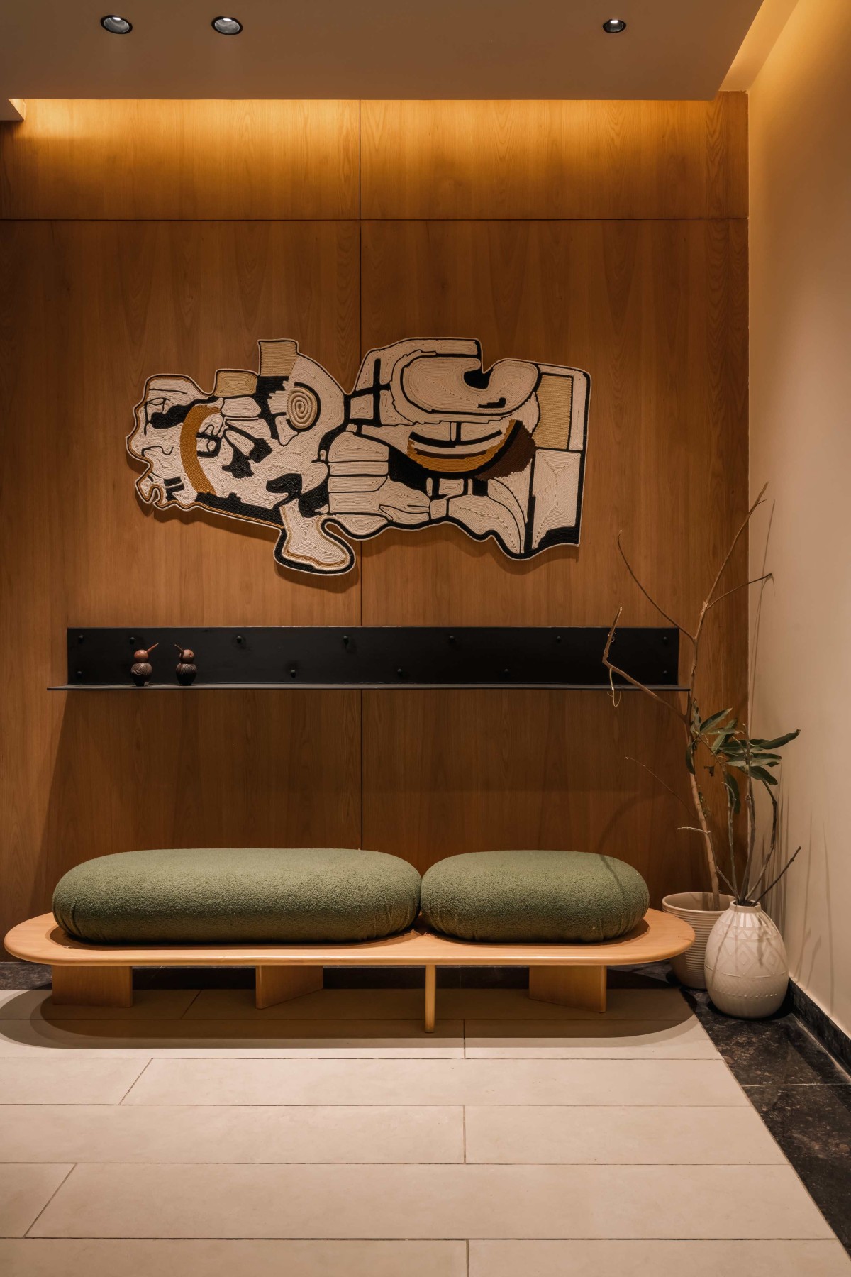 The experience begins in the foyer, a transitional space designed with intentional restraint. Bathed in soft, indirect lighting, the entrance features a custom curved bench and a focal artwork, establishing an immediate sense of welcome. This leads into the heart of the home - living room which unfolds as a sculptural composition. Curved shelving units and a custom-designed sofa with rounded edges create an enveloping setting, while a textured tufted artwork forms the focal point of the space. Together, these elements create a harmonious balance.