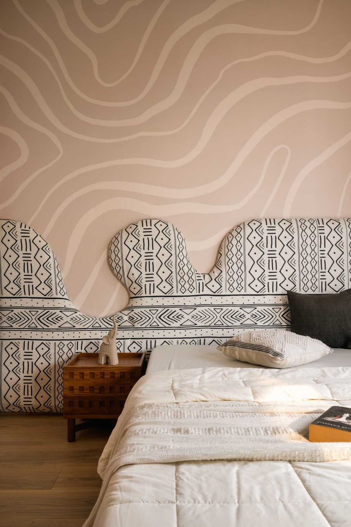 The kids’ room, envisioned as a multipurpose space, breaks the monochromatic stillness with a dynamic interplay of patterns and textures to create a lively, playful feel.