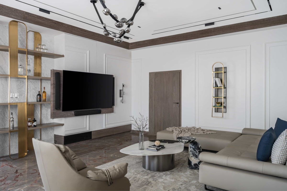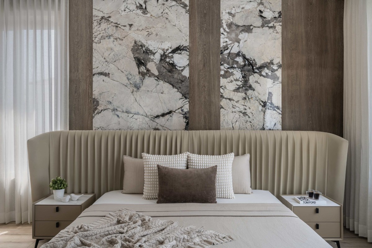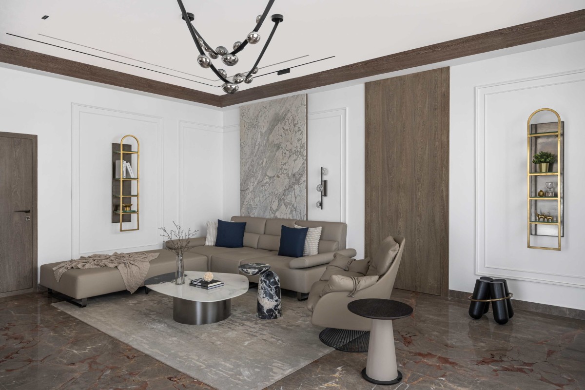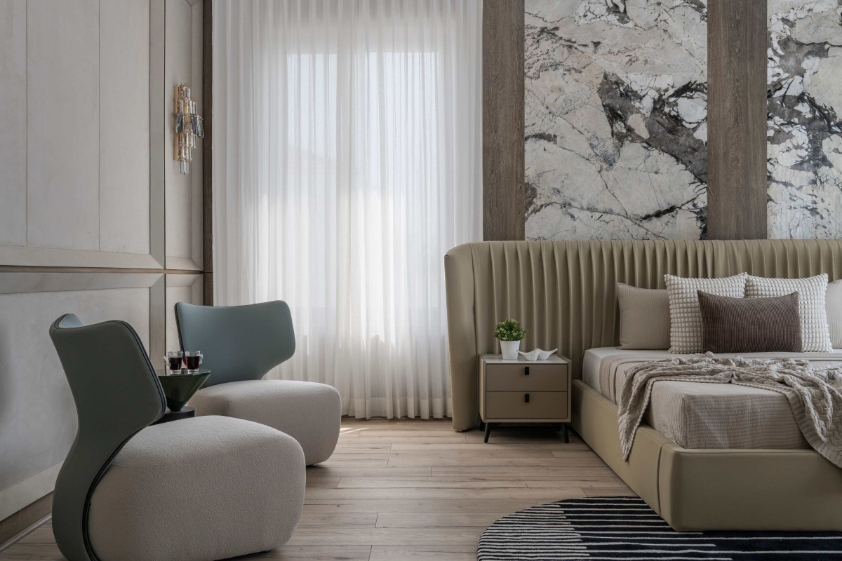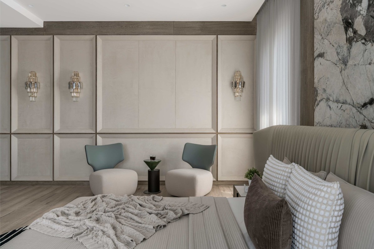 Master bedroom embodies timeless elegance with walls adorned in marble and veneer. From the sumptuous materials adorning the walls to the abundance of natural light flooding the space, every aspect of this master bedroom is designed to evoke a sense of timeless sophistication and serenity, offering the perfect retreat for rest and relaxation. Meticulously selected furniture pieces exude sophistication, while contrasting leather upholstery adds depth to the informal sitting area. In seamless integration with the bedroom's design, this dressing area exudes elegance. Soft corners and golden accents offer a luxurious touch, creating a space where style meets functionality with grace.