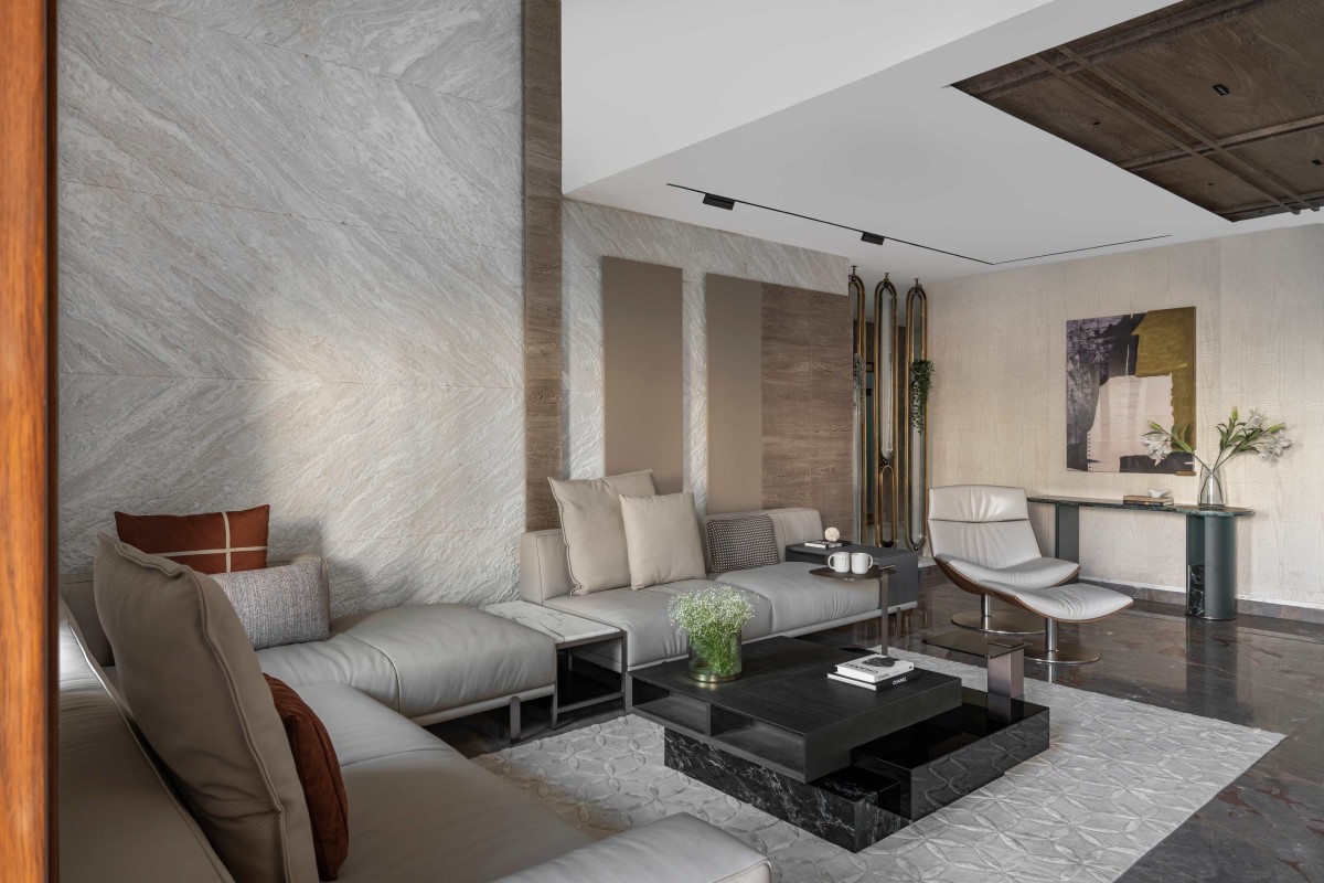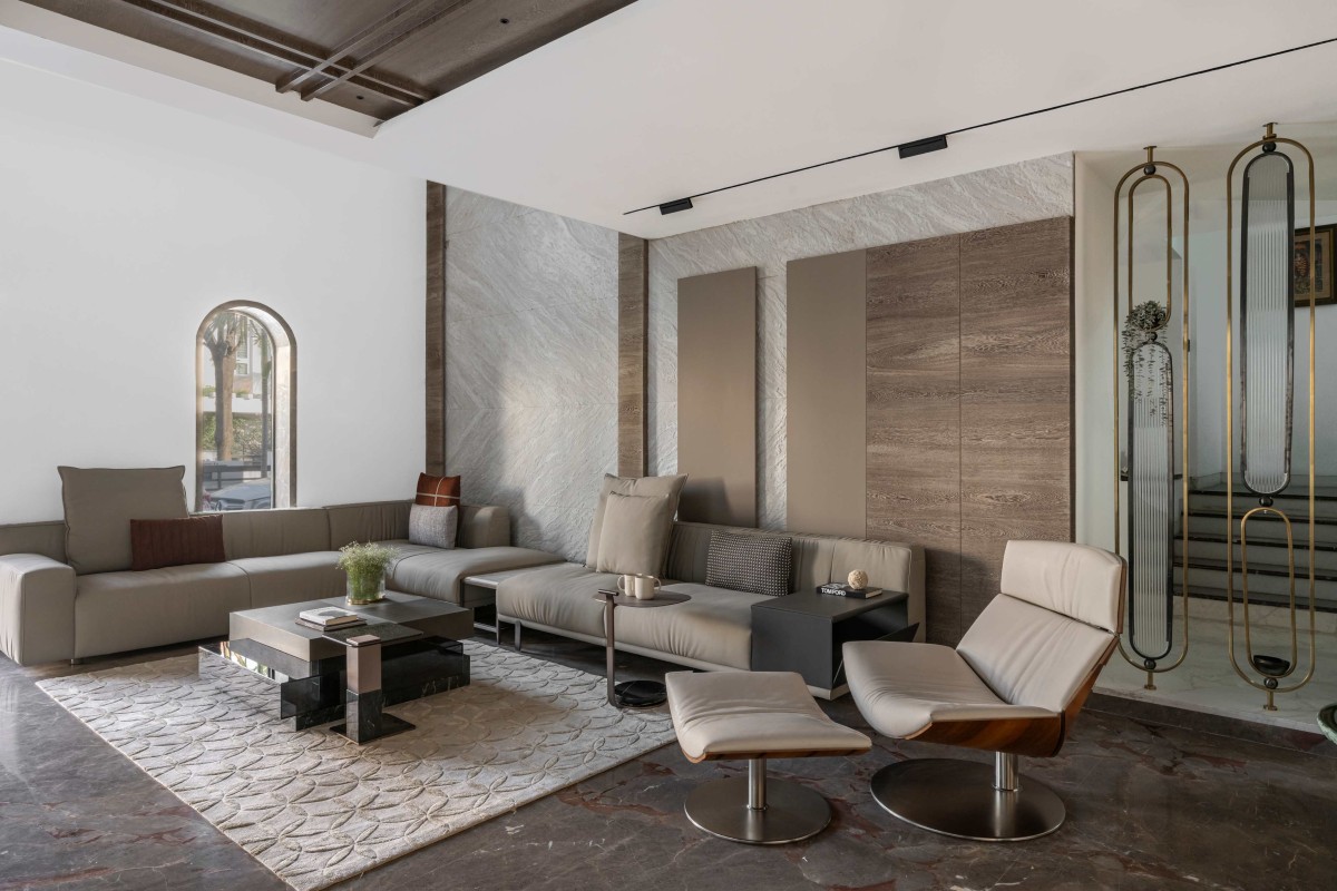 Ascend the staircase, and you're transported to a realm of understated luxury and refined comfort, where the private Living room beholds a curated collection of furniture that defies convention, beckoning you to sink into plush comfort and indulge in unparalleled relaxation. The space exudes an aura of warmth and tranquility, inviting effortless interaction and connection. But the true marvel lies in the full height vertical statuario marble backdrop behind the sofa, commanding focus and admiration with its majestic presence, elevating the entire space to new heights of grandeur.