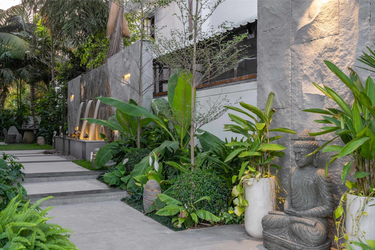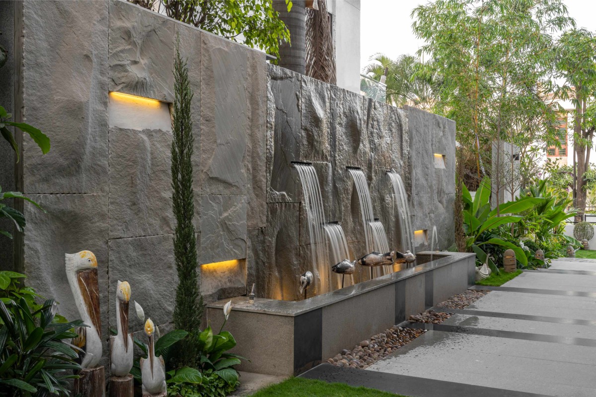 As you step into this enchanted verandah, you're greeted by a symphony of lush greenery that dances in harmony with the soft murmur of flowing water, casting a spell of tranquility upon all who enter. Every element of this divine space is crafted from earthly materials, with natural stone adorning the walls, seating, and even the garden lamps, creating a seamless fusion of rustic elegance and timeless beauty. The cascading water falls gracefully, it infuses the air with a delicate essence of purity and renewal, elevating the verandah to a realm of unparalleled beauty and tranquility.