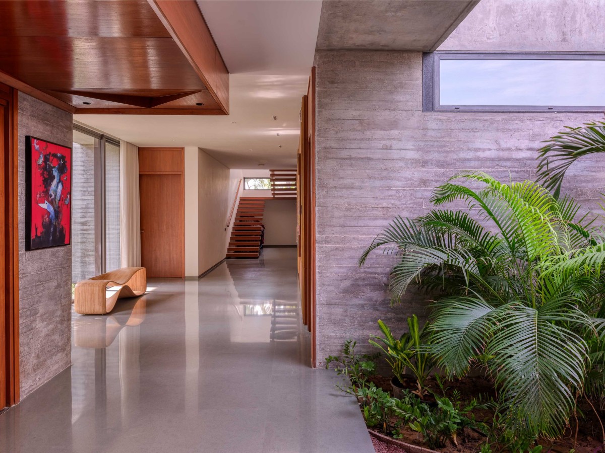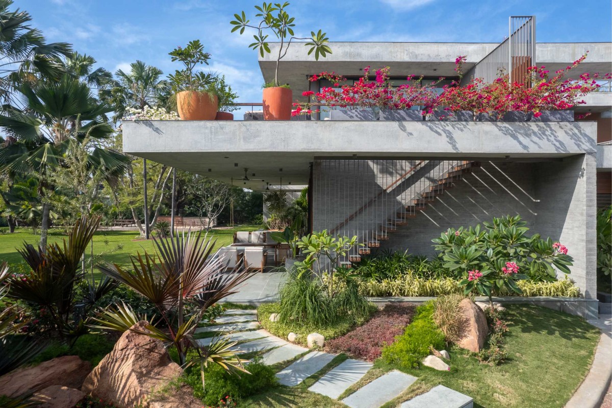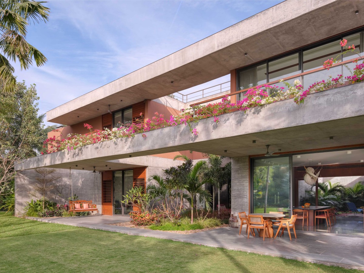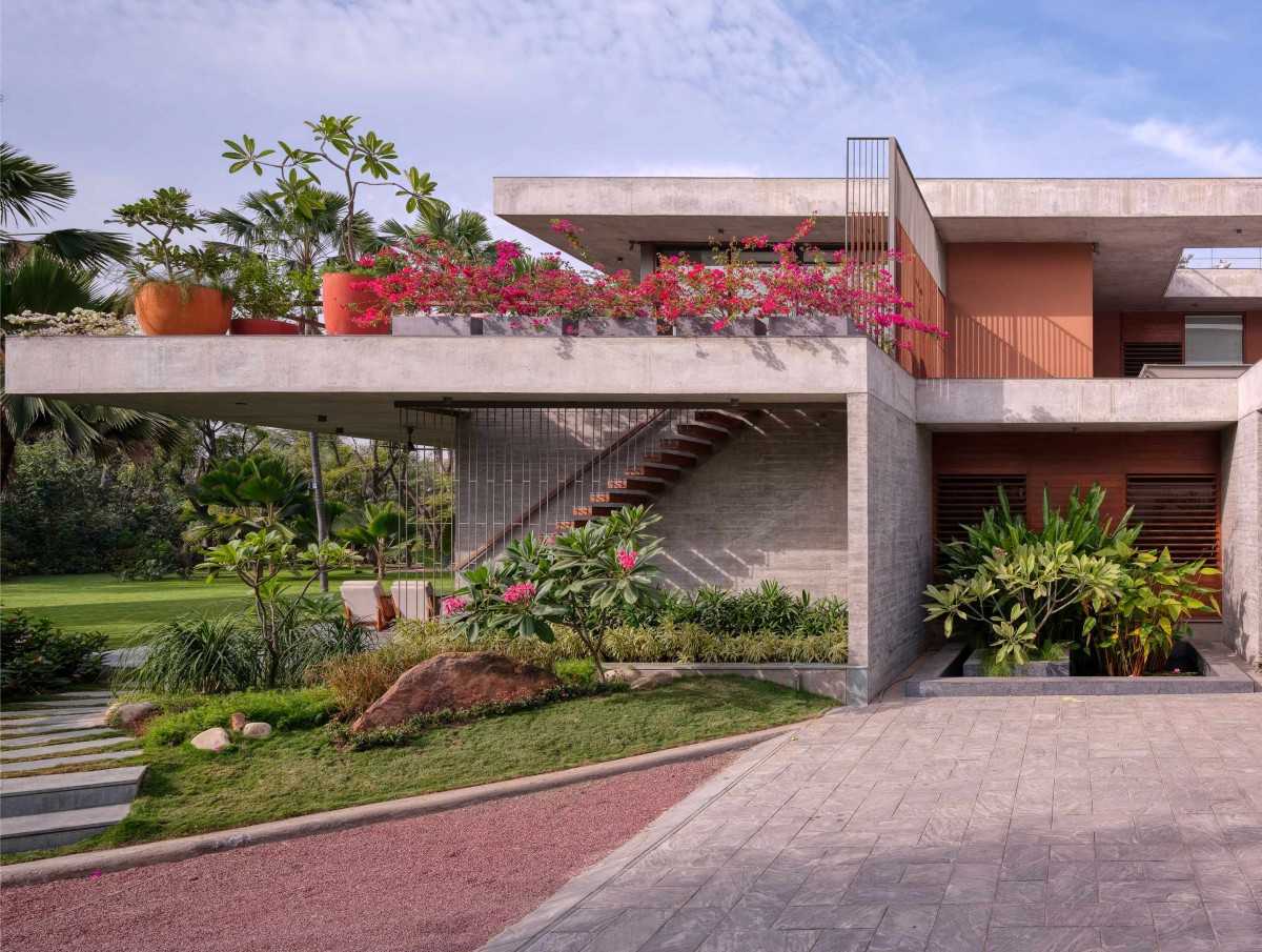 The house is explorations in dual charactertistics, working with openness and enclosure, concrete and terra cotta and balance of greens spaces and grey concrete surfaces. It’s a continuation of courtyard types but where spaces also open into the landscapes. The inside floor is in polished kota stone and leather finished kotah in verandahs while the walls are rough wood shuttered concrete, lime plaster or painted. The door windows are in reclaimed valsadi wood.