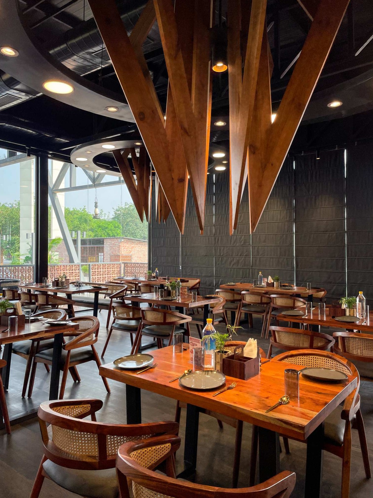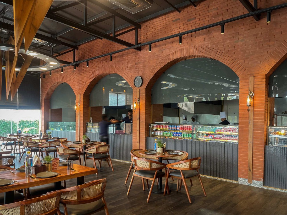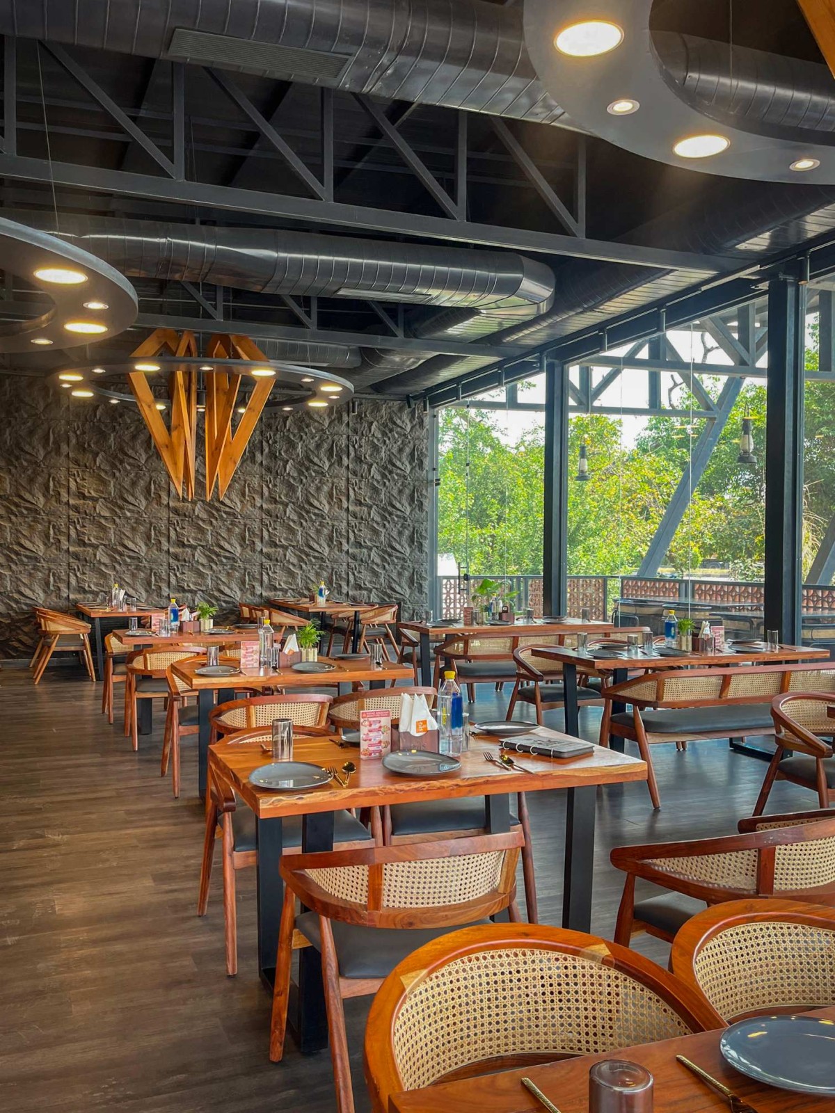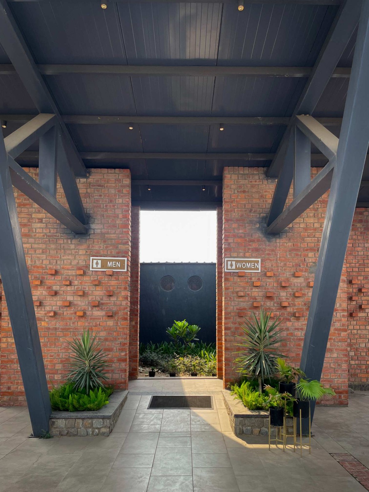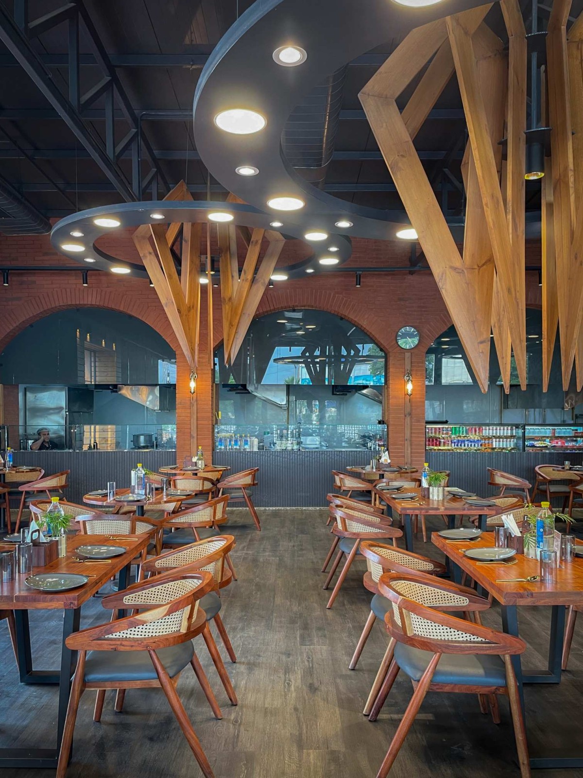 The interior features a rustic wooden theme, complementing the roughness of the brick and steel. Exposed wood textures, earthy colors, and handcrafted details soften the industrial look, creating a balanced atmosphere of elegance and warmth. The combination of steel, brick, and wood gives the architecture a timeless character that feels genuine, celebrates structure, and fosters an environment where dining, community, and celebration come together seamlessly.