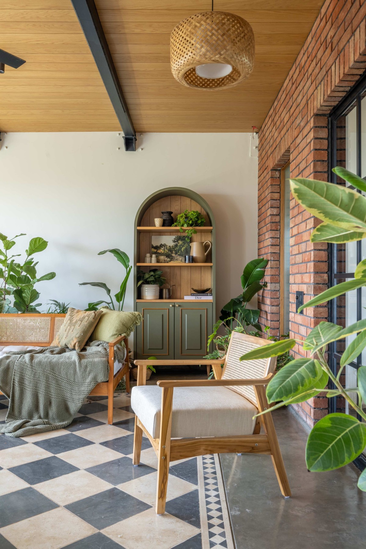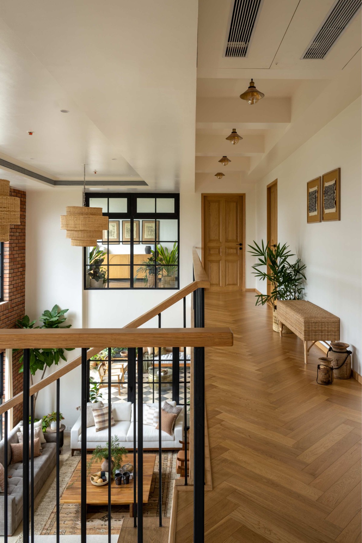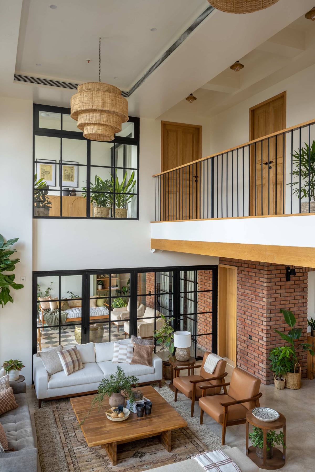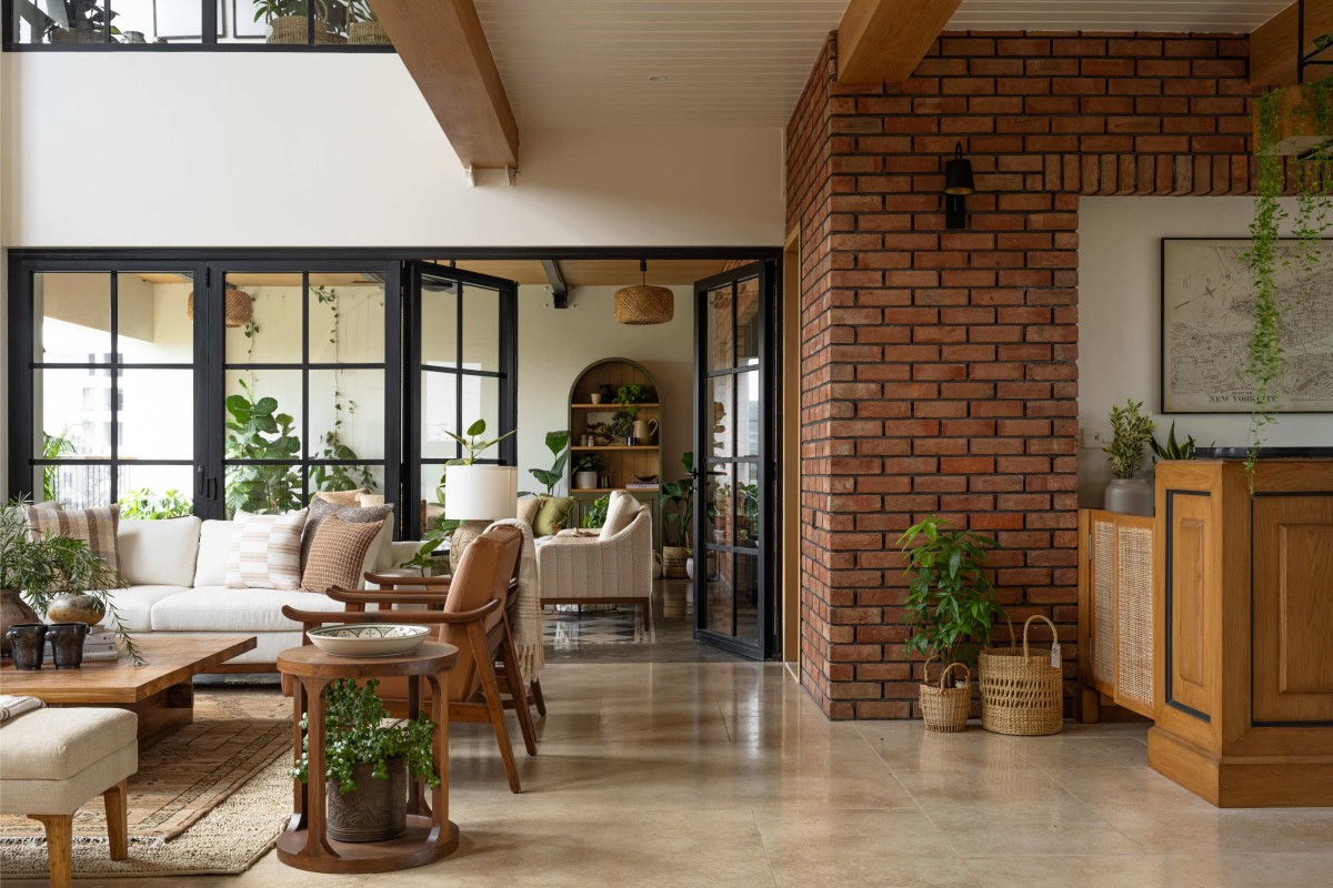 This home primarily breaks away from adhering to any particular style or any ongoing trends. In fact, it brings together contemporary, vintage and rustic elements in an effortless manner where they all coexist & complement each other. To blend different styles into one, it was extremely important that they create a neutral and muted palette to set a harmonious tone for the overall space. The larger palette works around the warm tones of beige marble flooring laid in staggered pattern, rustic double height brickwork and windows with Georgian bars and presence of Oak wood ceiling. However, it’s the play of various textures and patterns, that doesn’t allow the space to get flat and monotonous. Layering was one of the important tools to create a sense of depth in the larger spaces. Fabrics of varying textures, pieces of furniture belonging to various styles, organic mix of plants and varied artwork give the space a feeling of a home that is well curated, lived in and grown over a time. The overall house is tastefully curated but not precious. It’s visually comforting and that precisely gives it a feeling of a home!