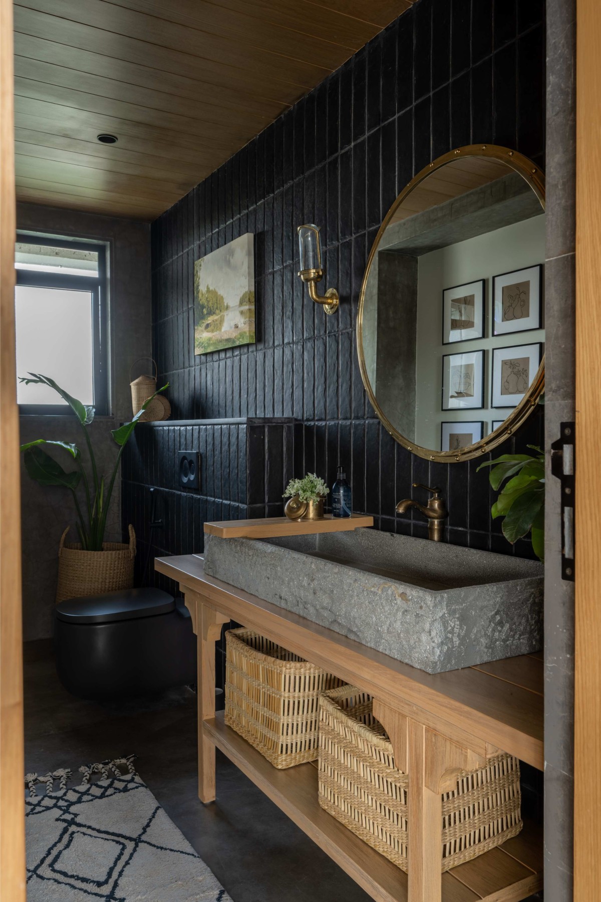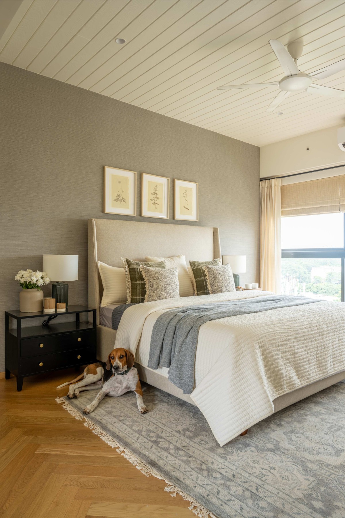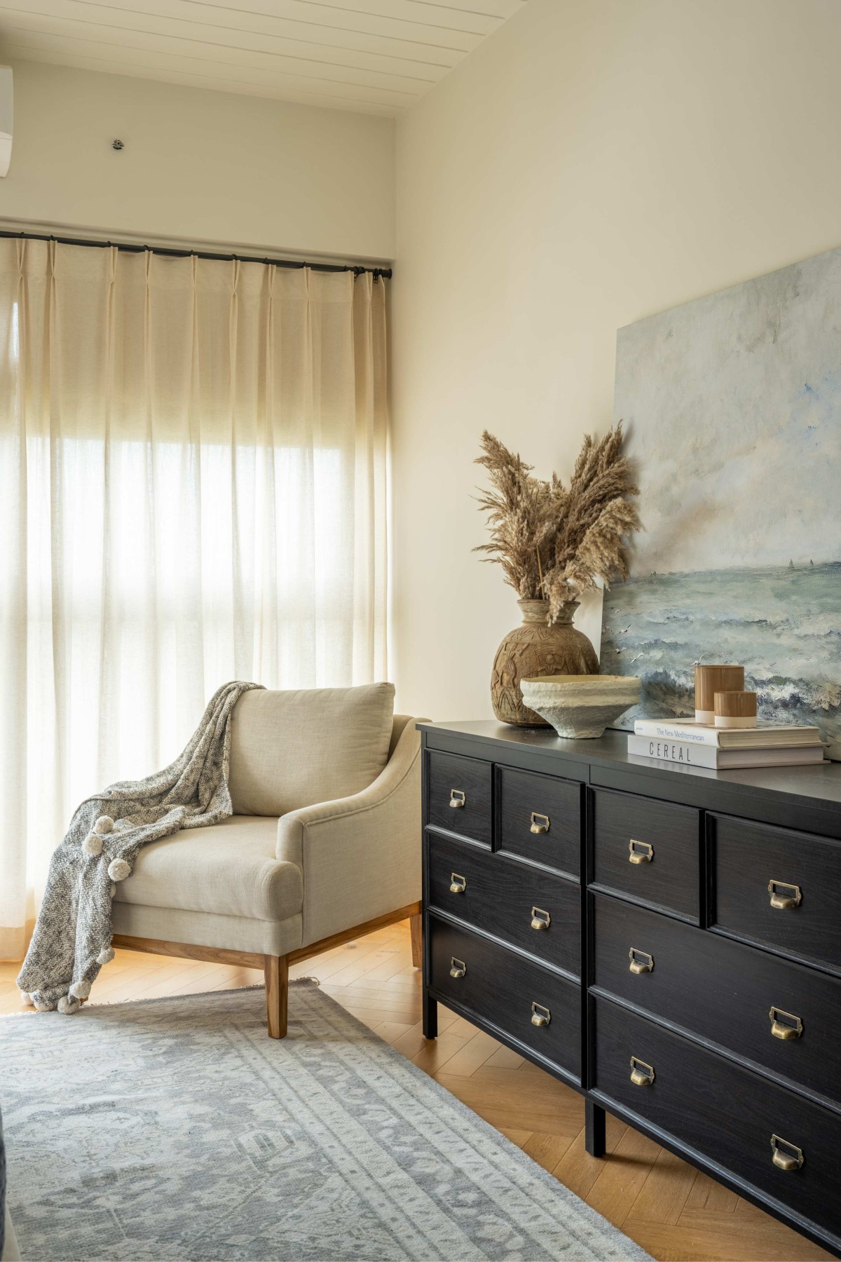 This home primarily breaks away from adhering to any particular style or any ongoing trends. In fact, it brings together contemporary, vintage and rustic elements in an effortless manner where they all coexist & complement each other. To blend different styles into one, it was extremely important that they create a neutral and muted palette to set a harmonious tone for the overall space. The larger palette works around the warm tones of beige marble flooring laid in staggered pattern, rustic double height brickwork and windows with Georgian bars and presence of Oak wood ceiling. However, it’s the play of various textures and patterns, that doesn’t allow the space to get flat and monotonous. Layering was one of the important tools to create a sense of depth in the larger spaces. Fabrics of varying textures, pieces of furniture belonging to various styles, organic mix of plants and varied artwork give the space a feeling of a home that is well curated, lived in and grown over a time. The overall house is tastefully curated but not precious. It’s visually comforting and that precisely gives it a feeling of a home!