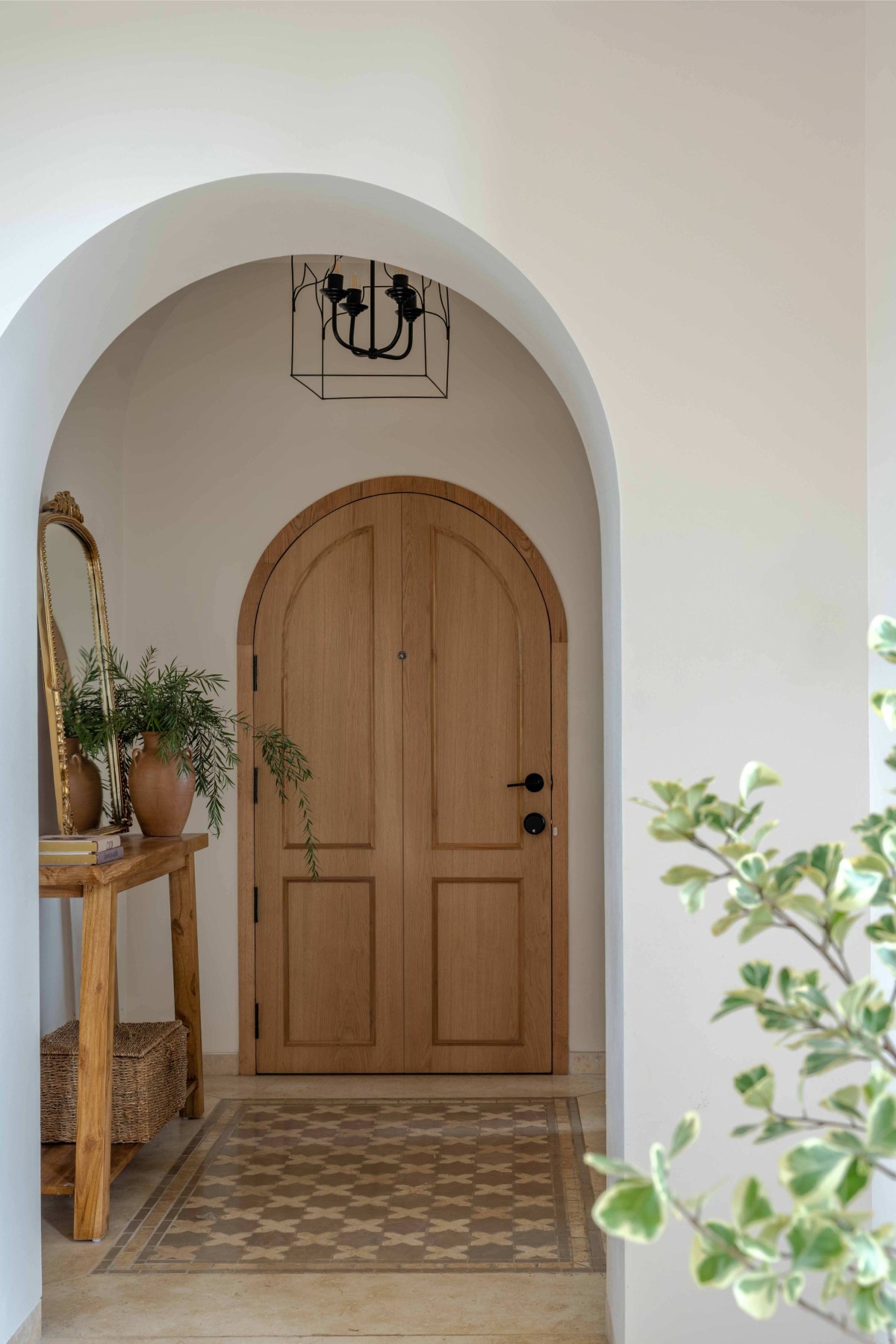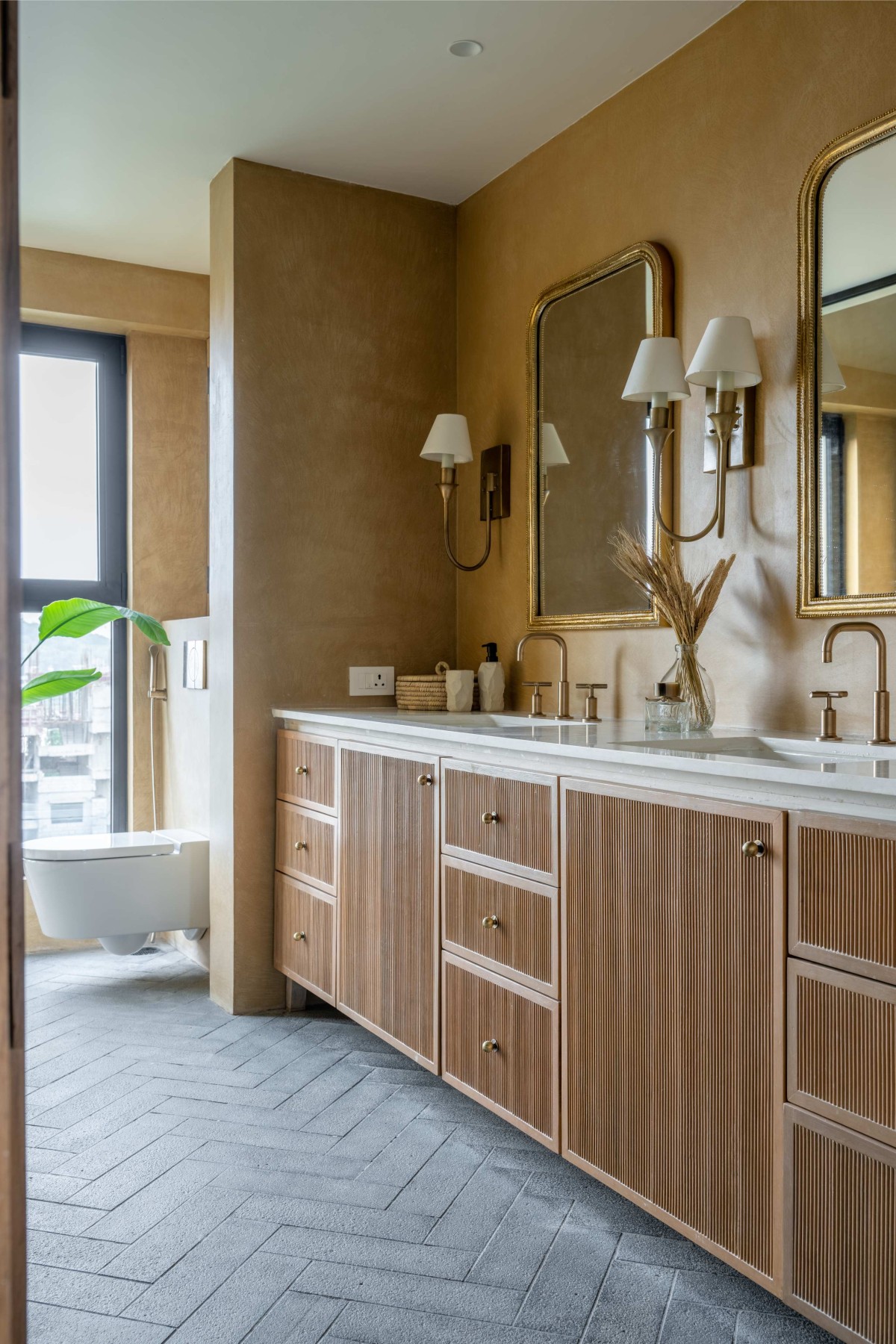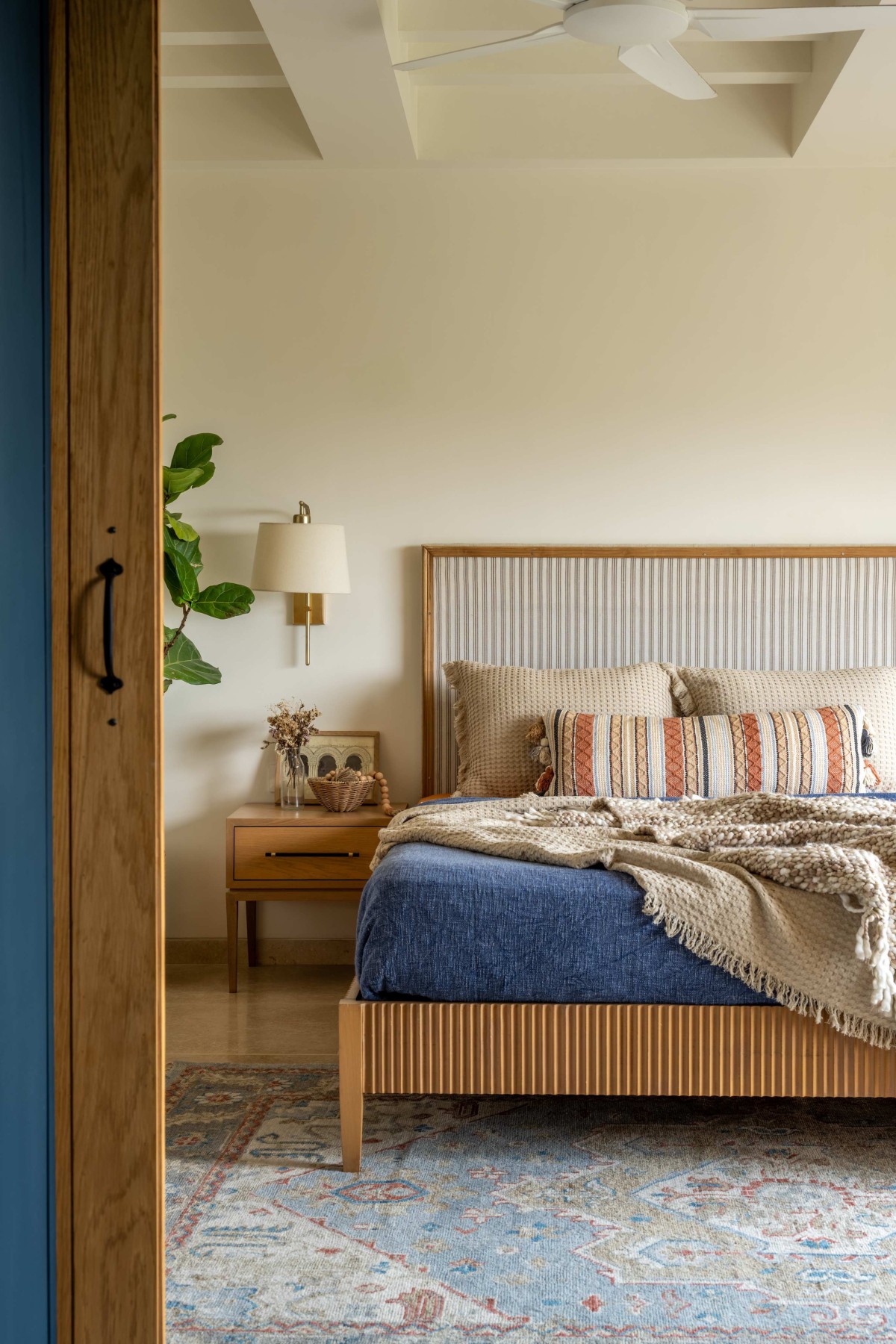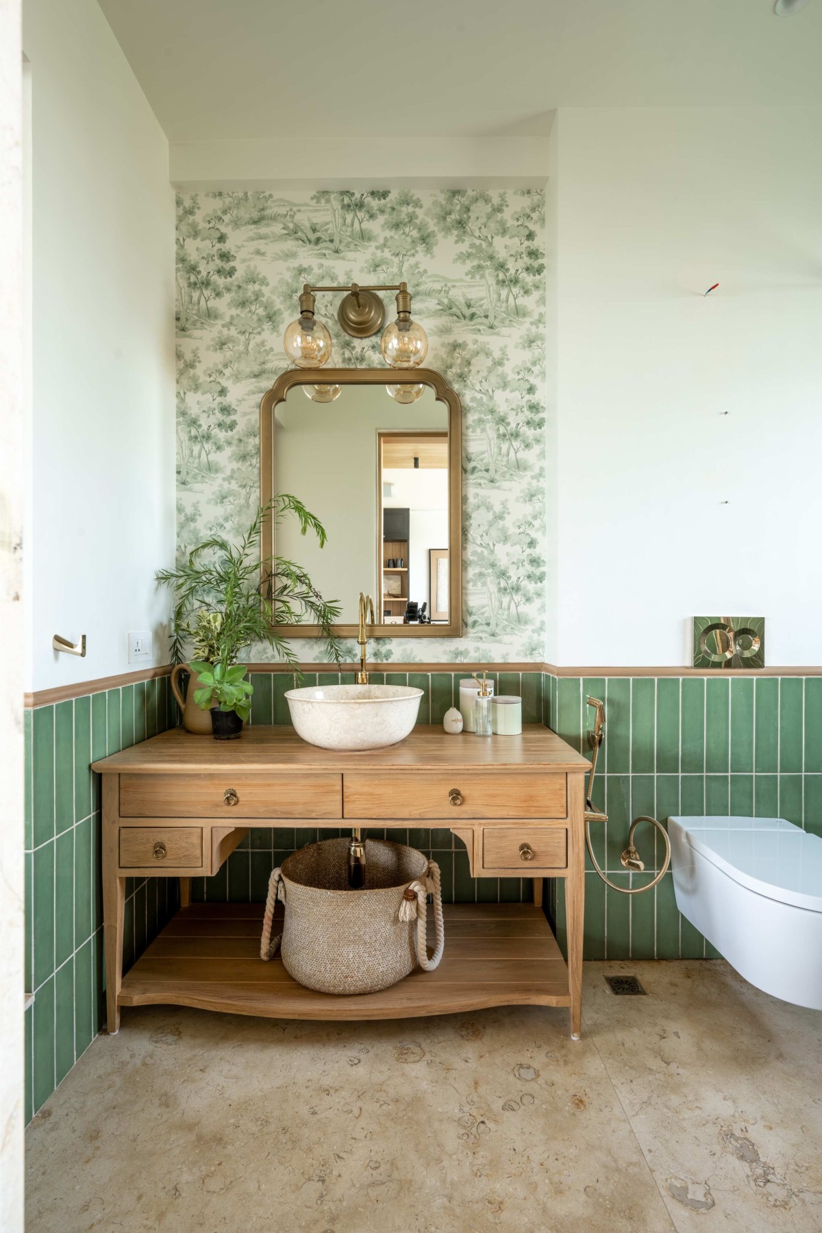 While all the common spaces adhere to warmer palette with hints of pastel tones with subtle contrasts, the bedrooms and bathrooms play around slightly bolder tones bringing a subtle burst of colors within the broader palette of overall house. Presence of brushed brass finish add a subtle sense of luxury through the bedside lamps, hardware, bath fixtures. Rattan chandelier and wicker lamps compliment by adding a layer of craft to the spaces.