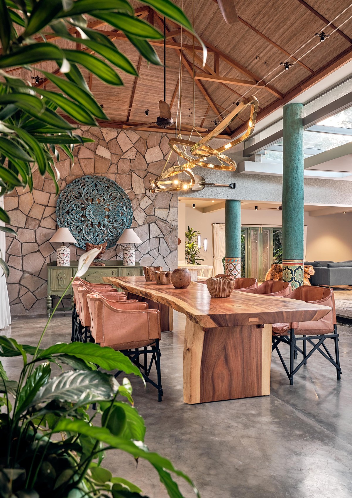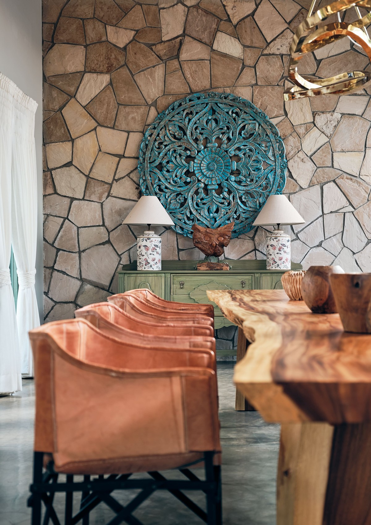 living. The dining room is bold and rustic. A stone wall that wraps to the